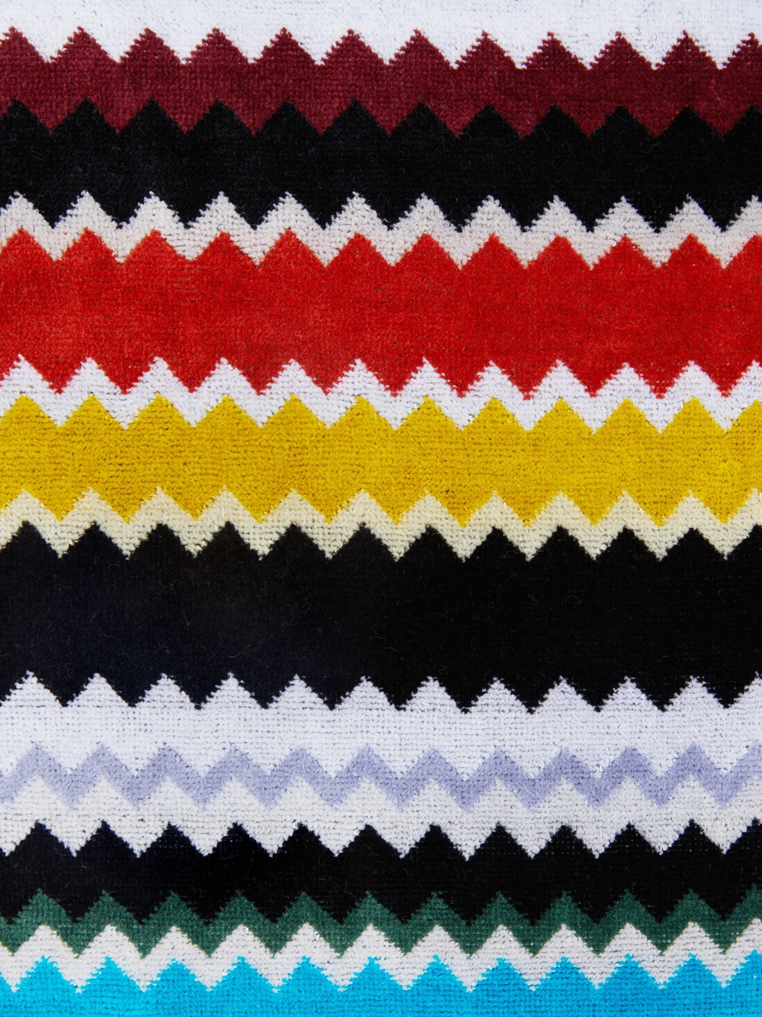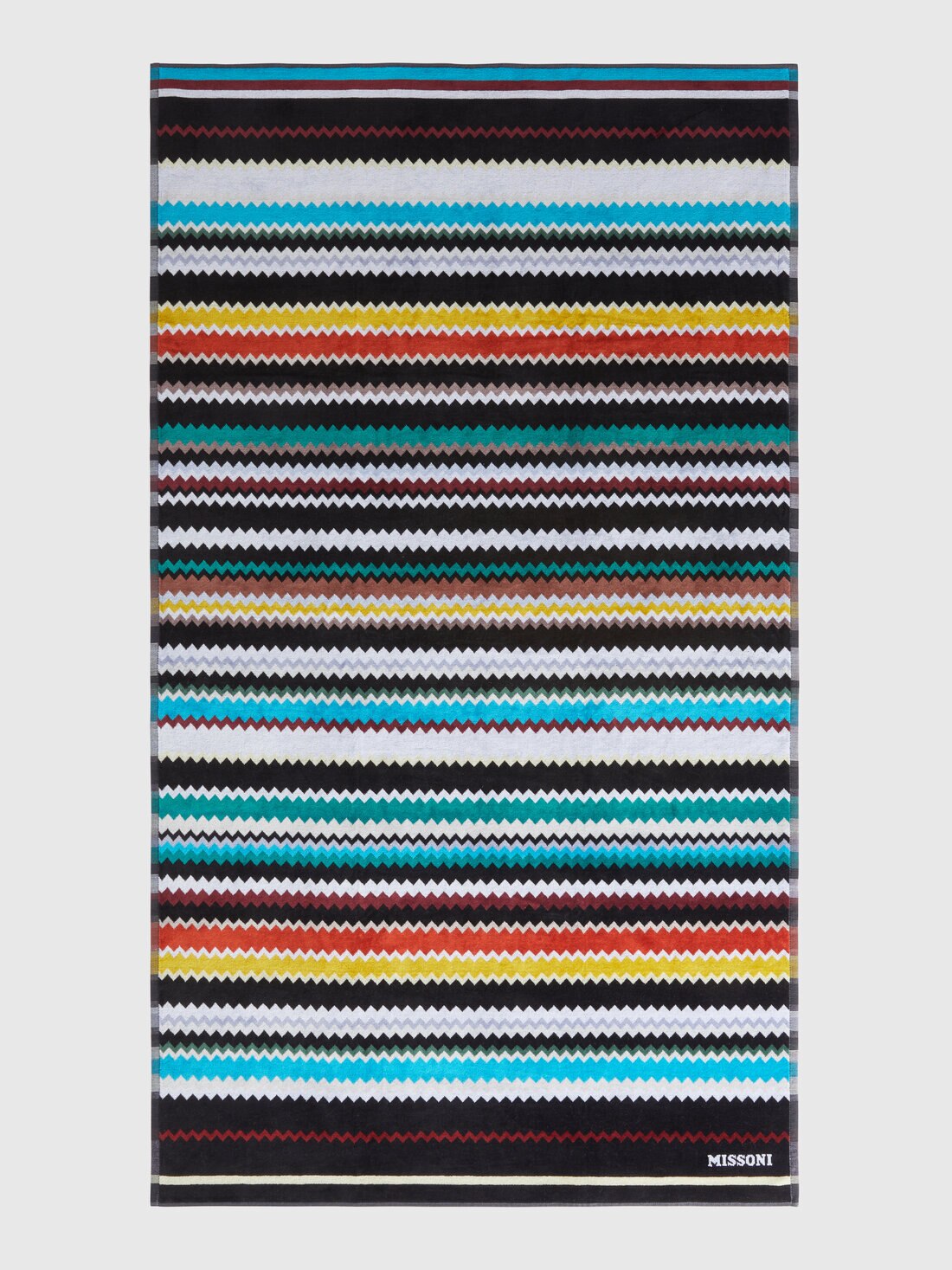 El ADN de MissoniHome se plasma a la perfección en la toalla de playa Curt de 100x180 cm. El rizo de puro algodón aterciopelado, cubierto por el motivo en zigzag y la inscripción del logotipo, cubre este accesorio de verano con un estilo atemporal.
