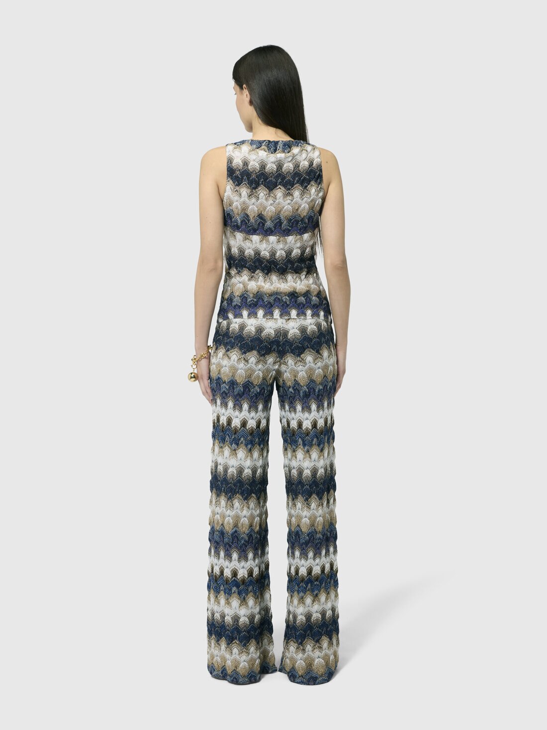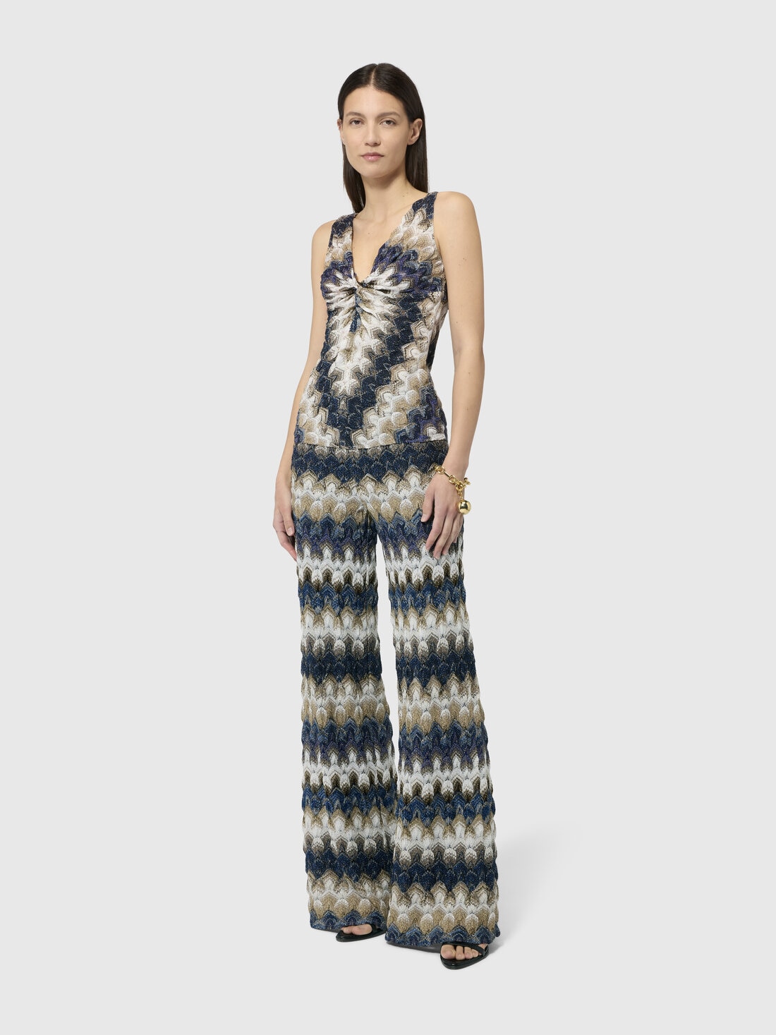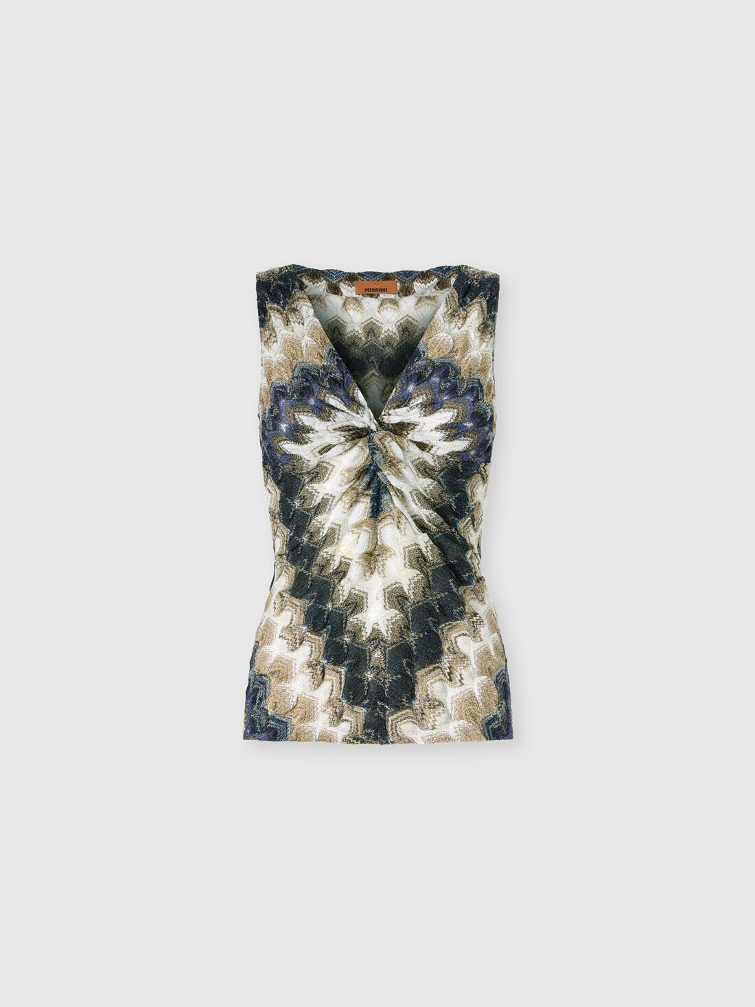 Una elegancia luminosa define este top sin mangas para mujer, caracterizado por un escote fruncido y un tejido raschel de encaje en mezcla de viscosa lamé. Una prenda refinada que combina ligereza y armonía gráfica.