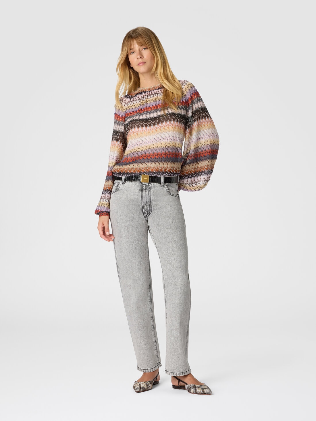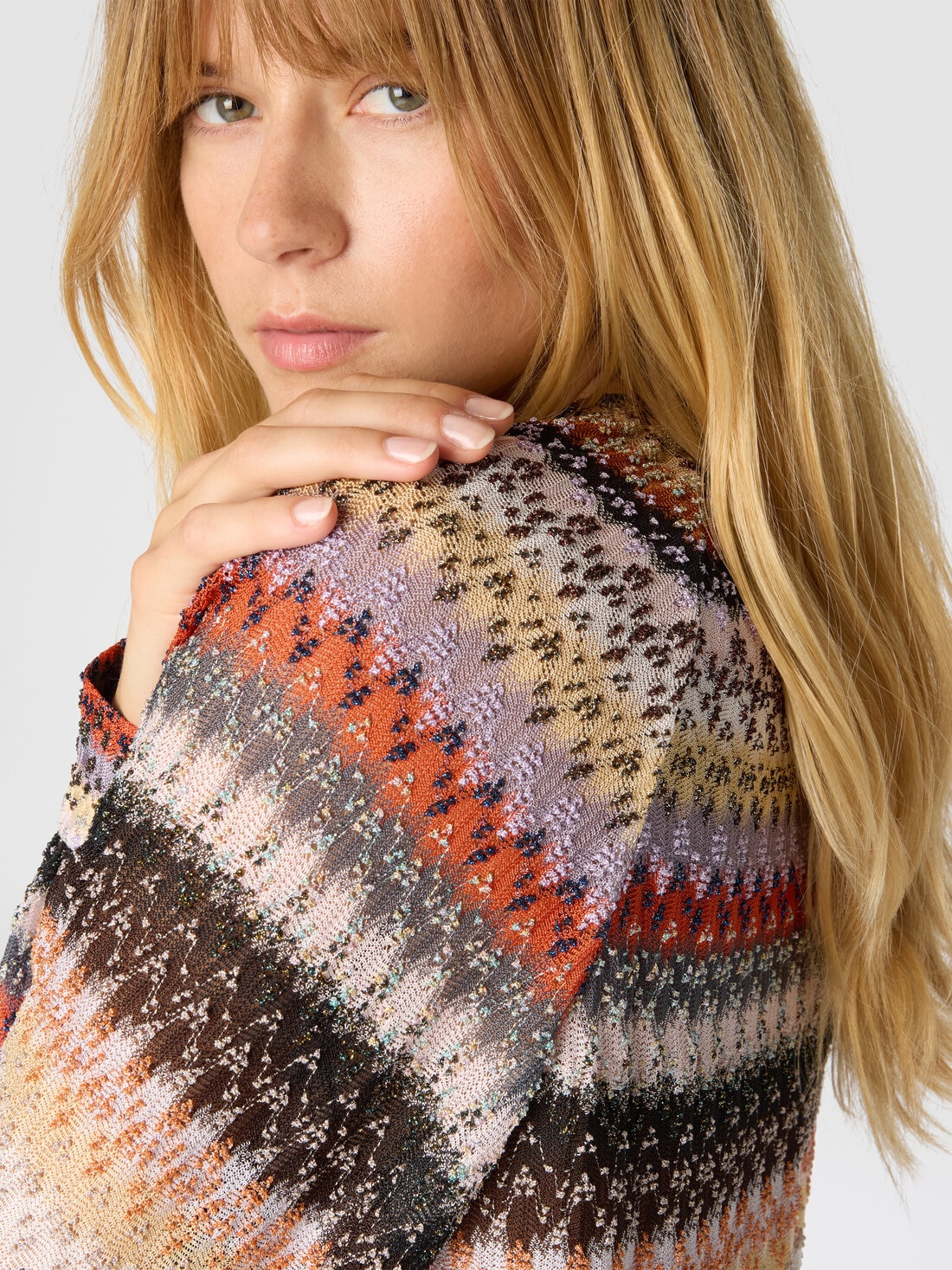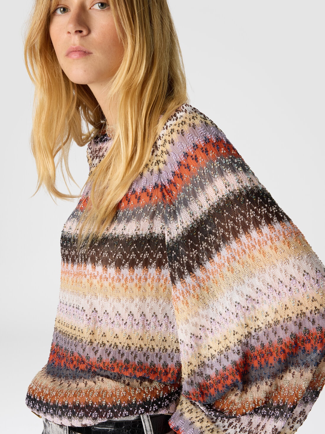 Ligereza sofisticada y detalles luminosos definen esta blusa de cuello redondo relaxed fit para mujer, con mangas amplias y una refinada confección raschel en encaje calado. Confeccionada en mezcla de viscosa con hilos lamé, expresa una elegancia moderna a través de texturas elaboradas y reflejos delicados.
