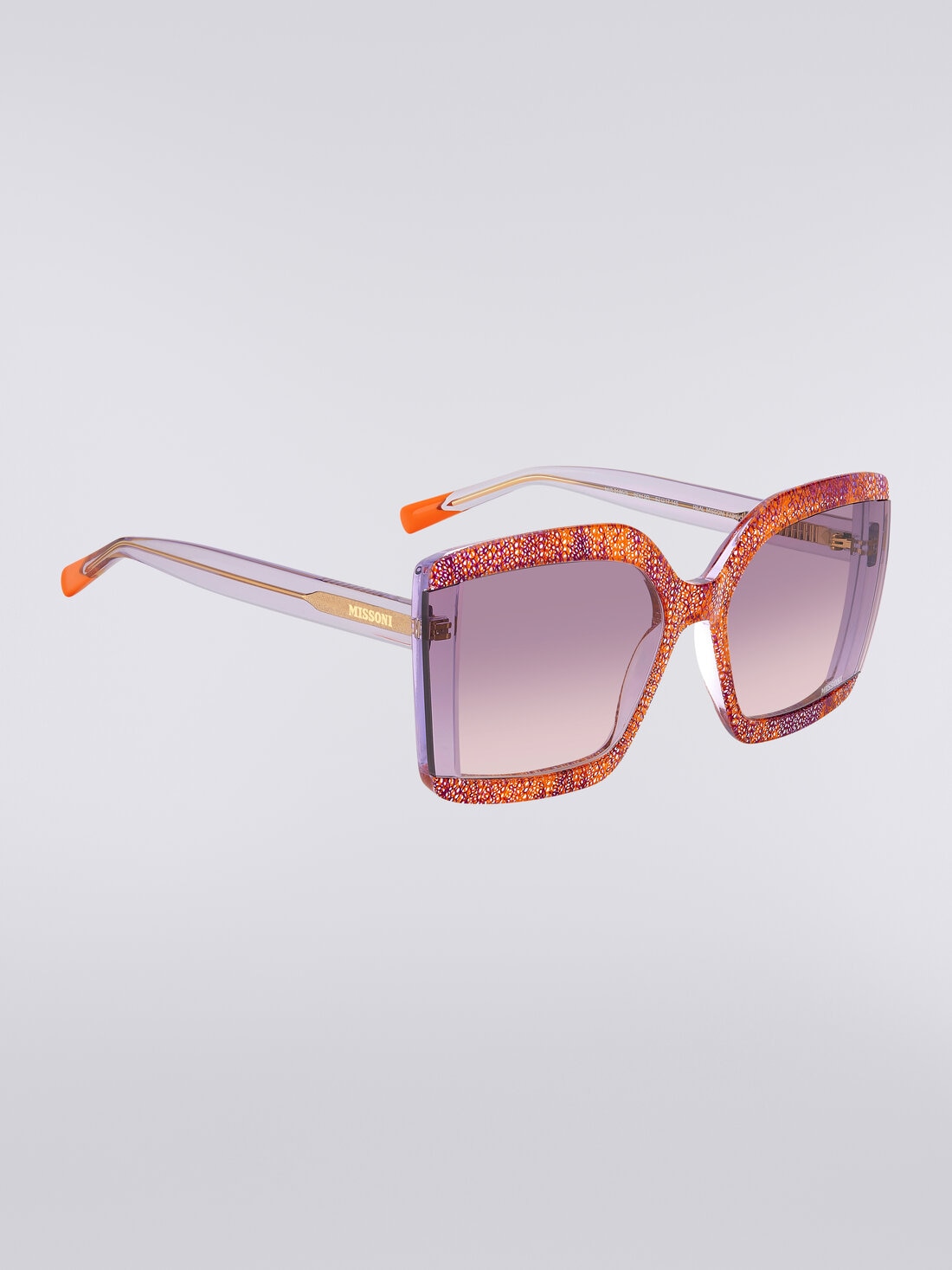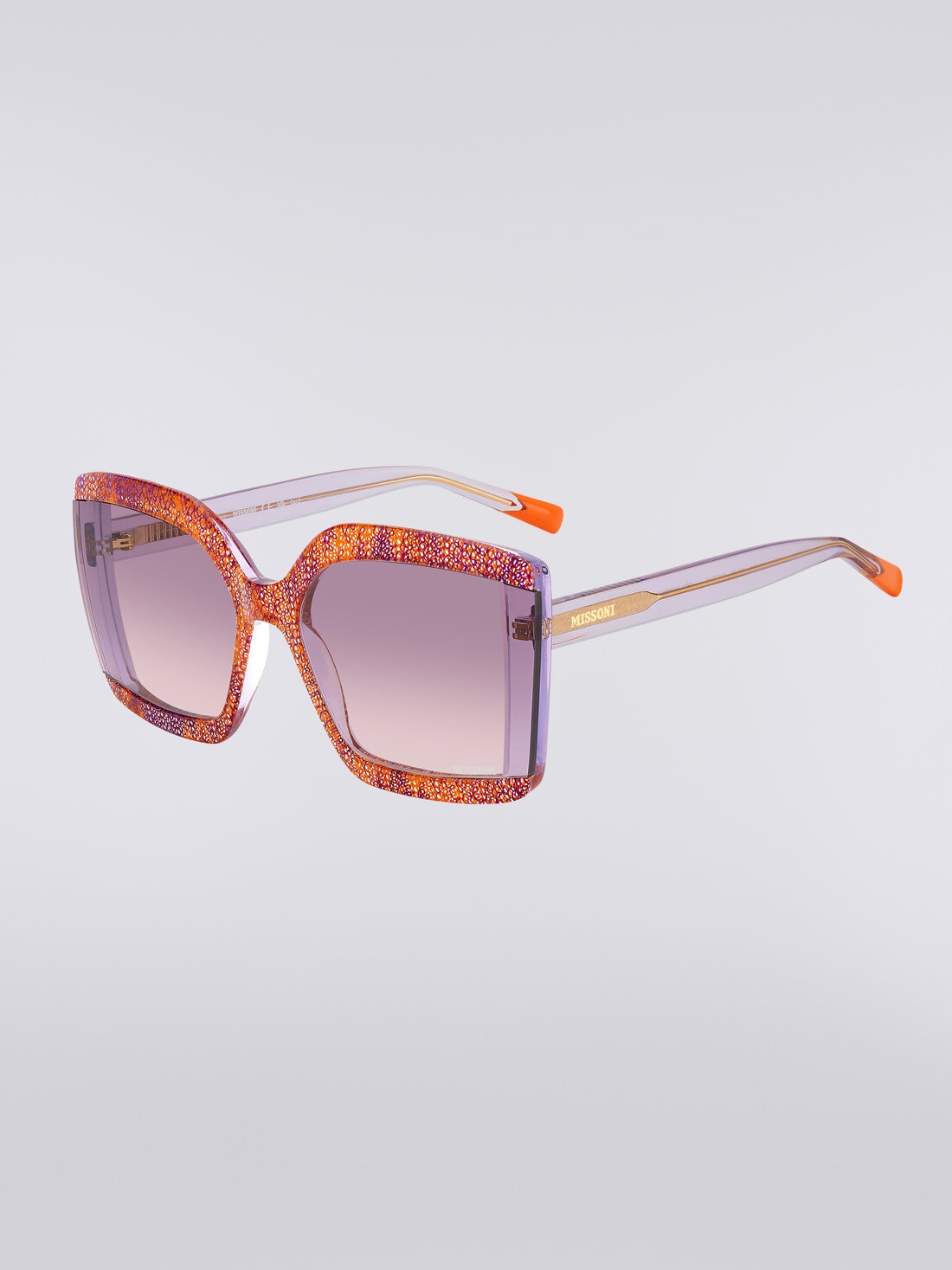Eclécticas y opulentas, estas gafas de sol de la colección de gafas Missoni se caracterizan por su montura cuadrada de acetato. La silueta geométrica está adornada con una elegante mezcla de materiales en la parte delantera, una sofisticada referencia a las experimentaciones textiles de Missoni. Las varillas están personalizadas con el logotipo de Missoni en un refinado color dorado, mientras que los extremos de acetato presentan la reconocible forma de medio zigzag.