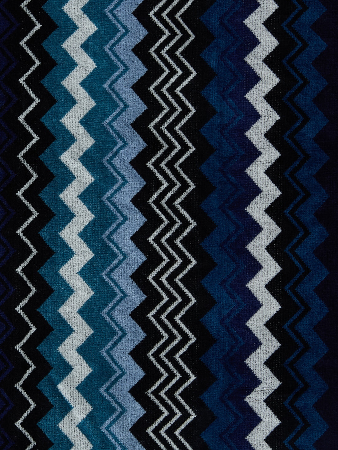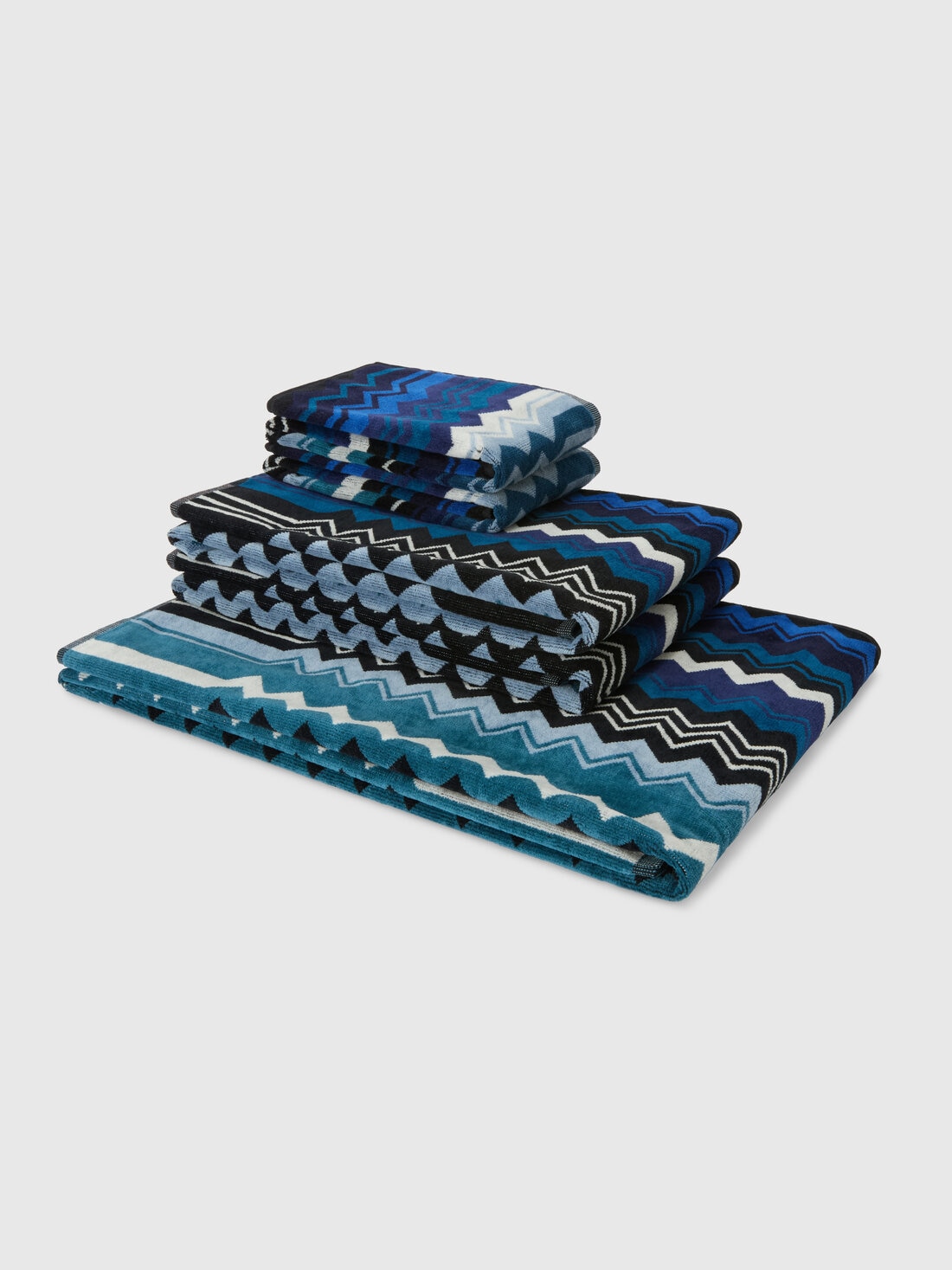 El juego de 5 toallas Giacomo es la quintaesencia del estilo Missoni: aquí, la calidad del rizo de algodón aterciopelado se une a la definición del estampado de espigas, que se sumerge en los bordes a rayas para animar este juego precioso y atemporal.
