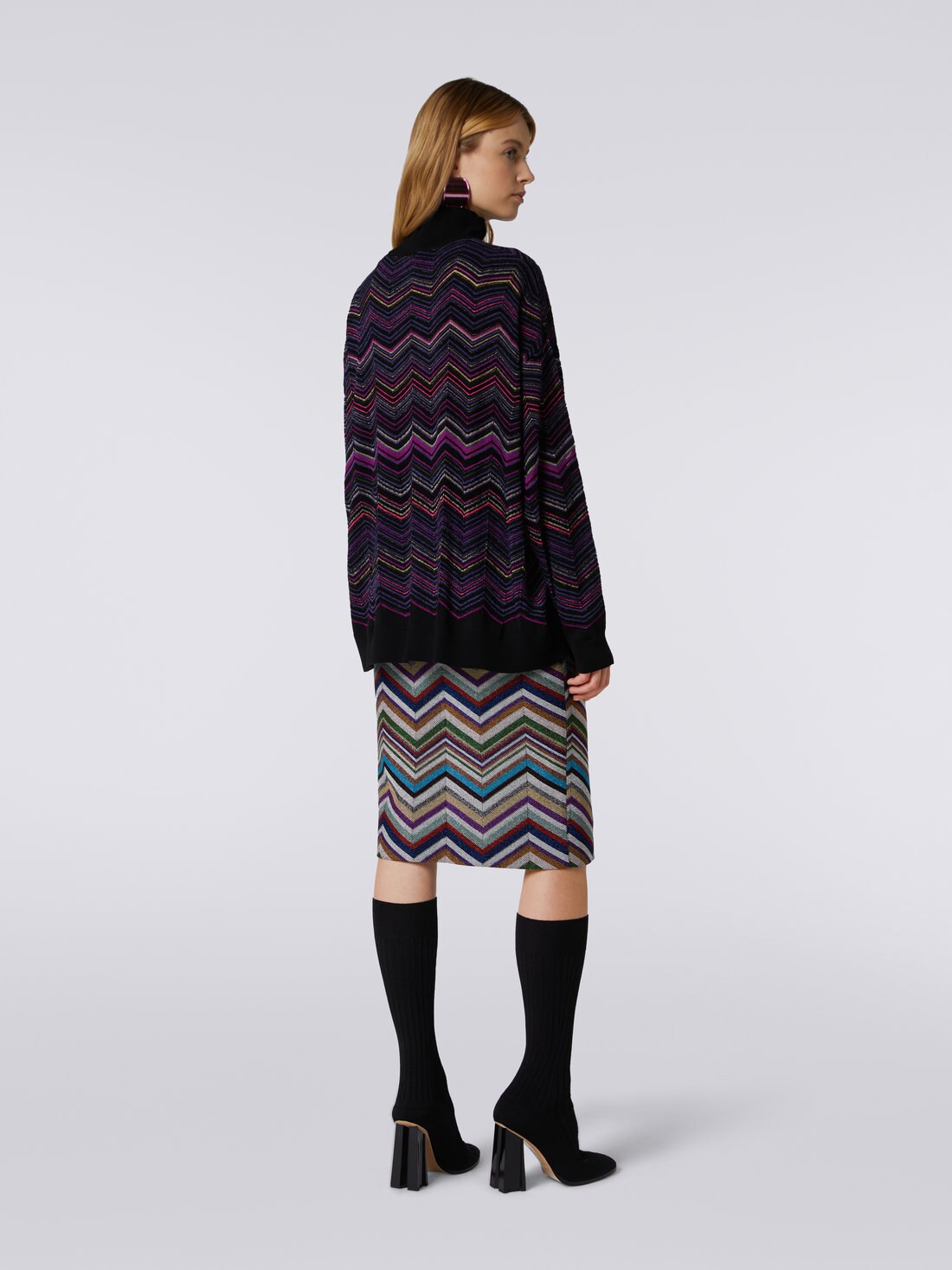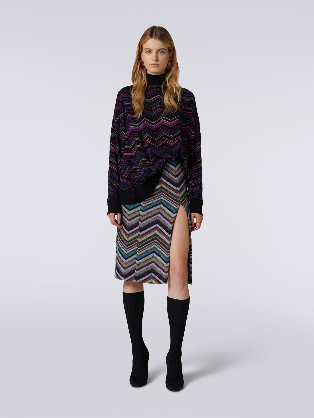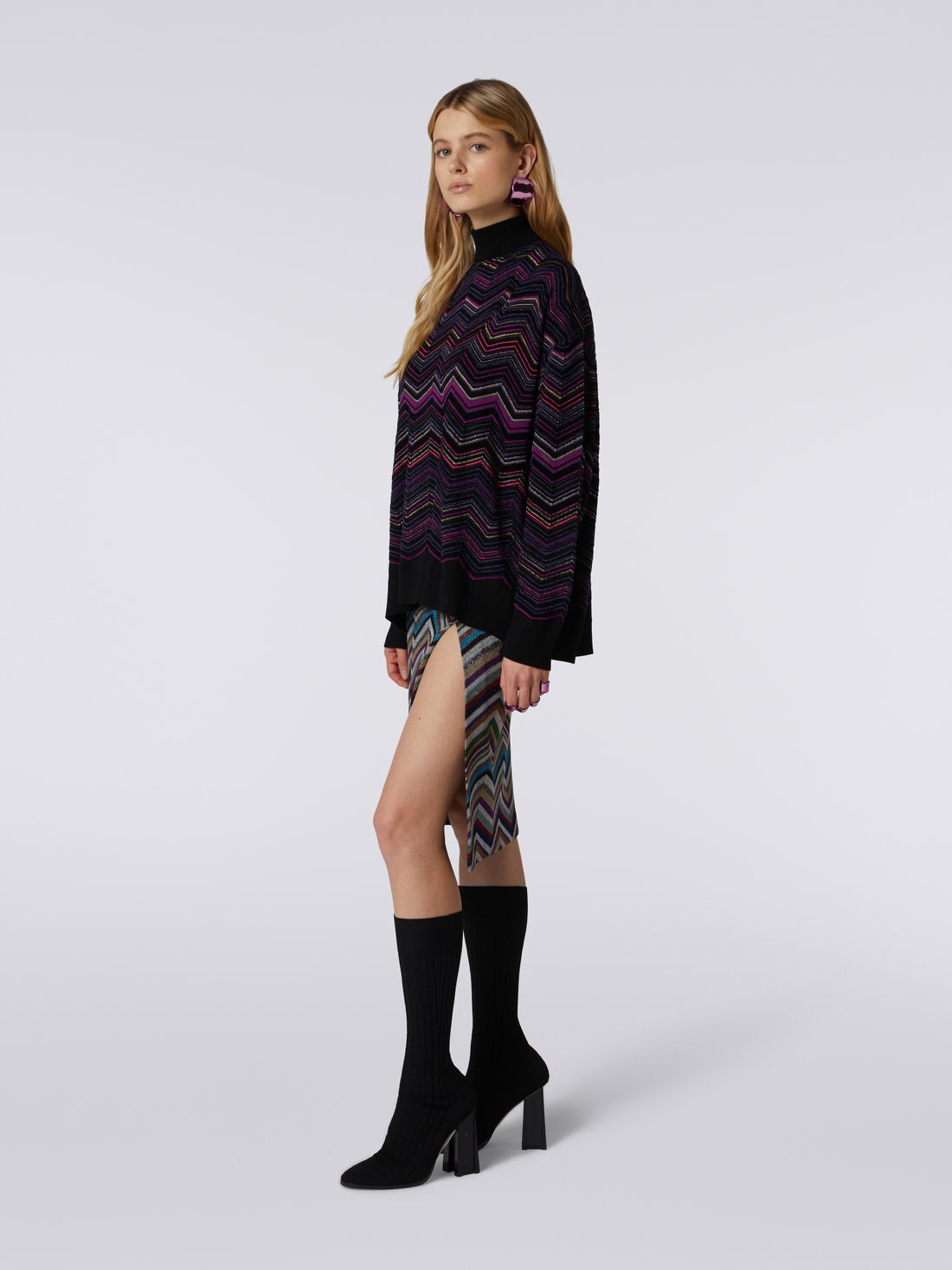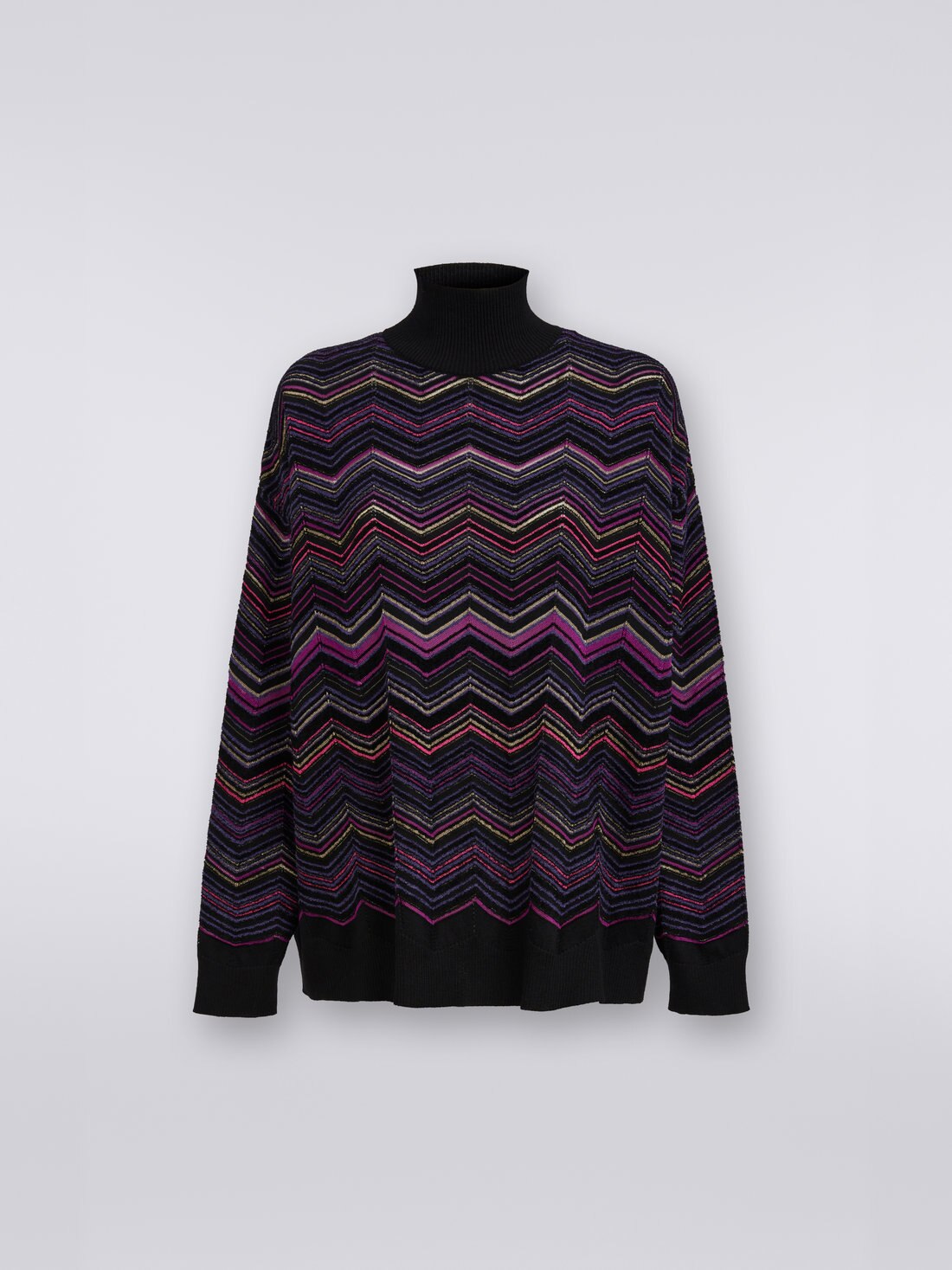 El jersey para mujer, de ajuste extragrande, está confeccionado en una fina mezcla de lana y viscosa. La prenda está cubierta de motivos en zigzag multicolores que crean un efecto visual dinámico y alegre, mientras que los ribetes de color liso añaden un toque de sencillez y elegancia. Este modelo es una excelente elección para quienes desean un aspecto cómodo y a la moda, pero sin renunciar a un estilo distintivo y único.