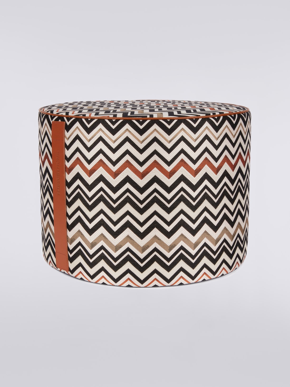 El zigzag de Missoni, en su versión más pura, caracteriza el puf cilíndrico Belfast de 40x30 cm. Práctico y fácil de manejar gracias al asa de refinada piel con el logotipo impreso, este accesorio de decoración presenta ribetes de cuero.