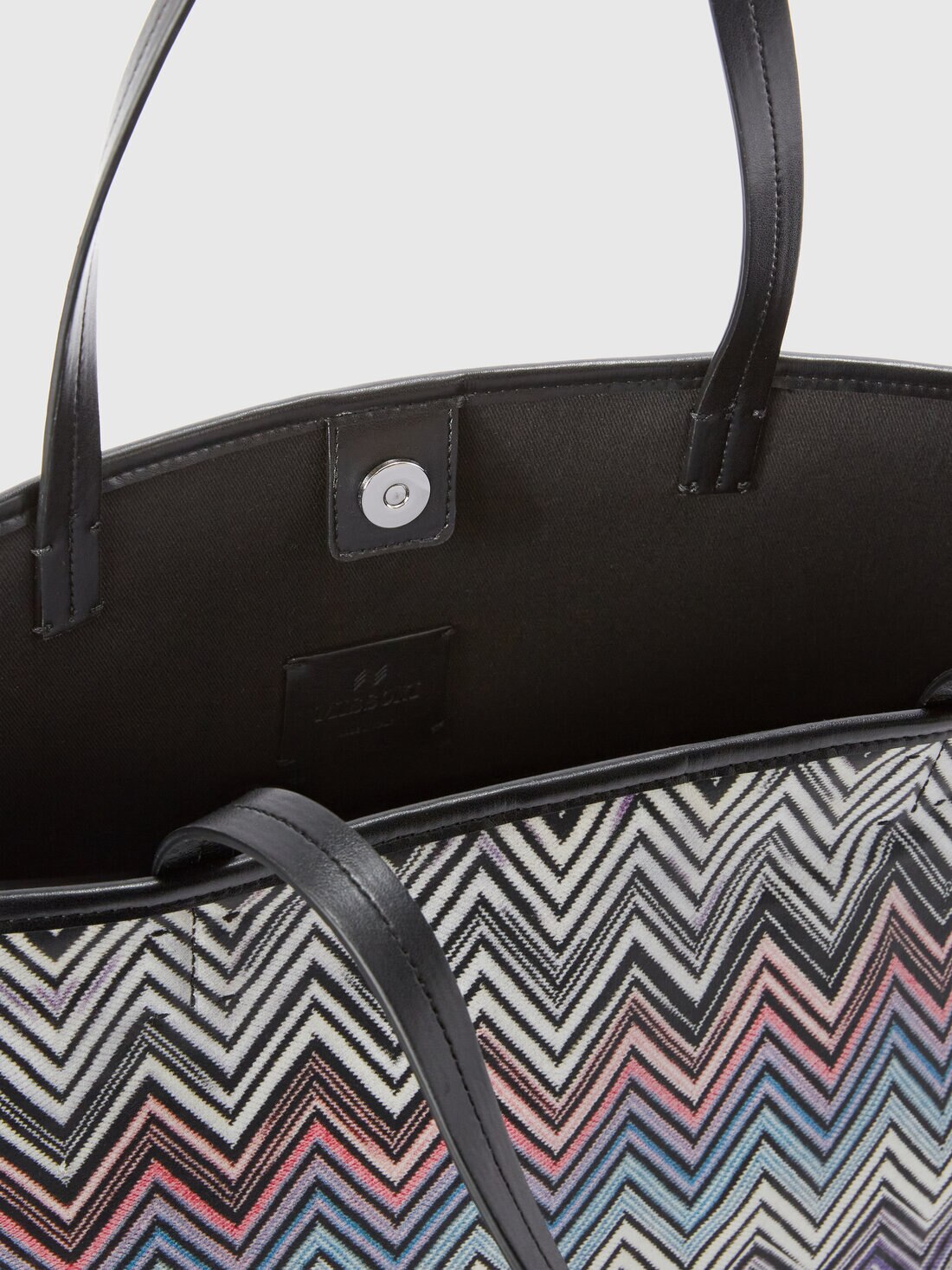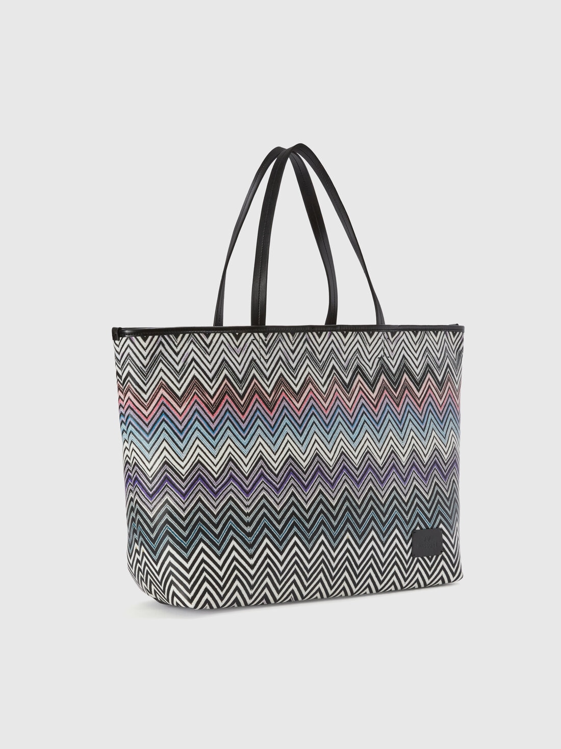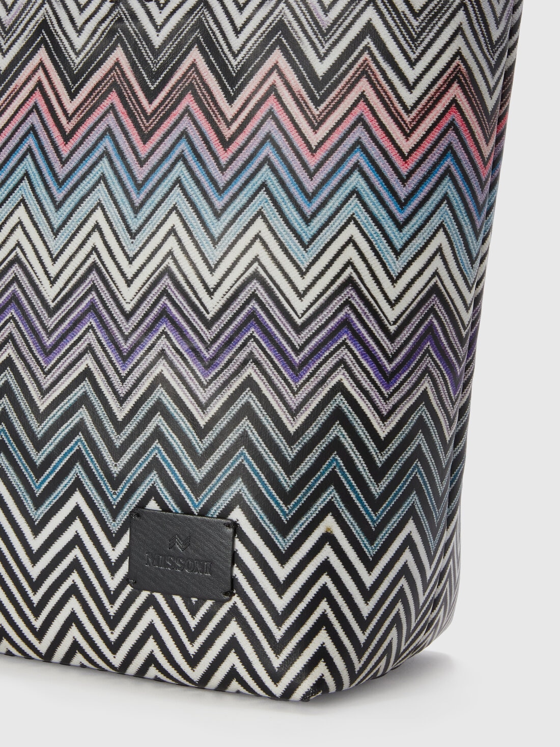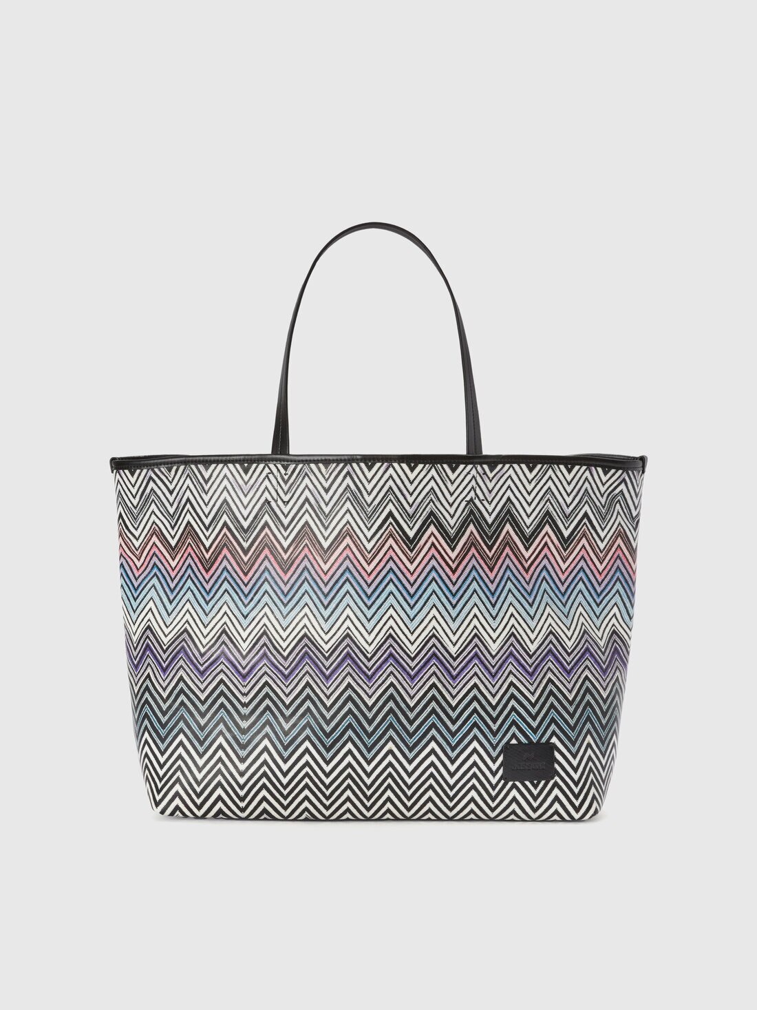 Práctico y espacioso, el bolso shopping para mujer Missoni se hace inmediatamente reconocible por la lona de algodón en zigzag que lo caracteriza. Las asas dobles de cuero y el botón a presión añaden versatilidad, mientras que el parche con el logotipo que lo personaliza le da un toque pop.