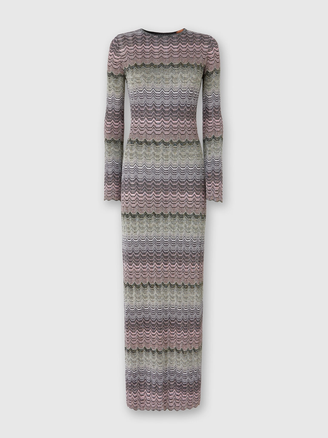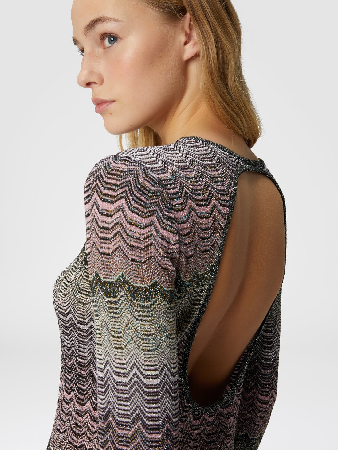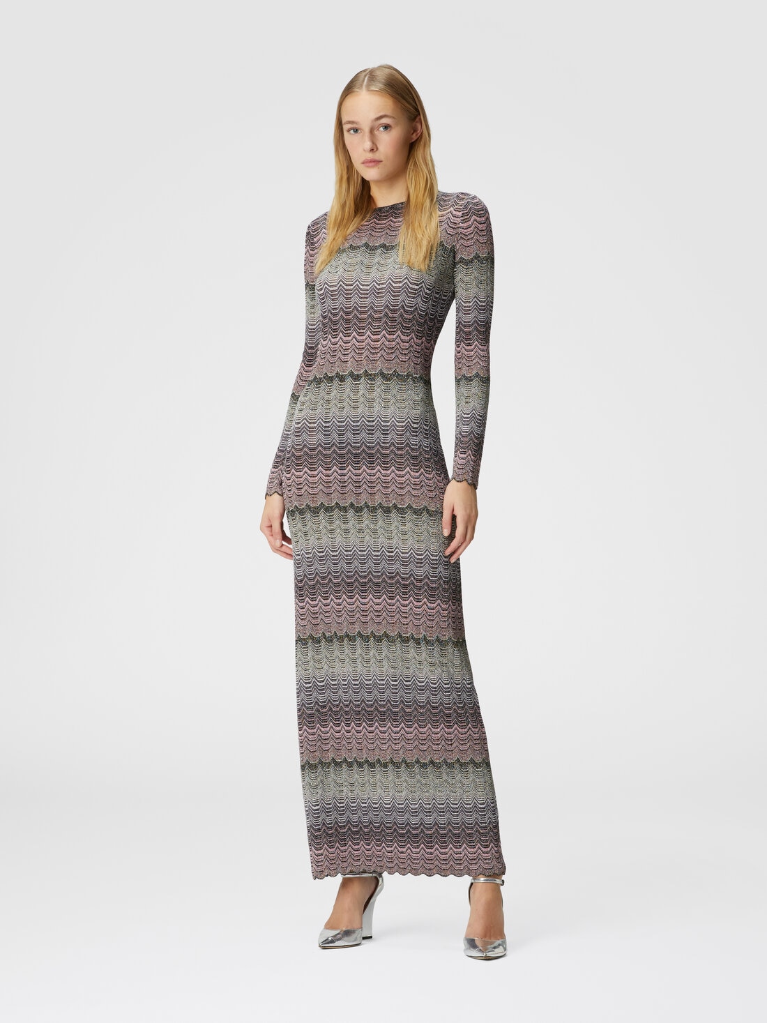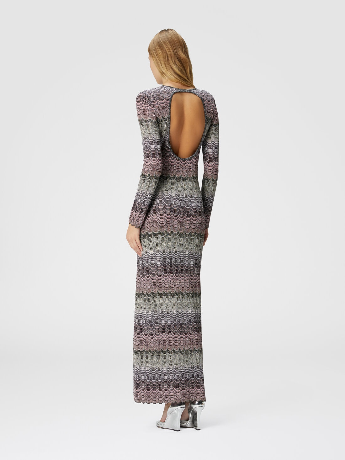 Adornado con el escote ovalado recortado en la espalda, el vestido largo está adornado con un patrón griego en zigzag e iluminado por los destellos de lamé. Los perfiles de la prenda continúan el motivo decorativo, para un resultado de refinamiento extremo.