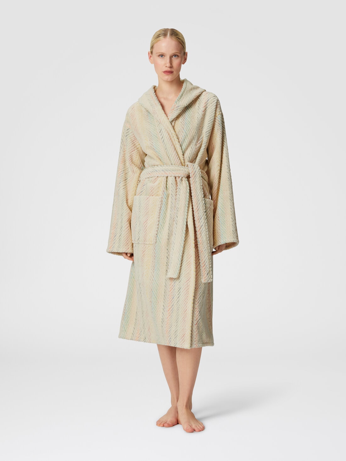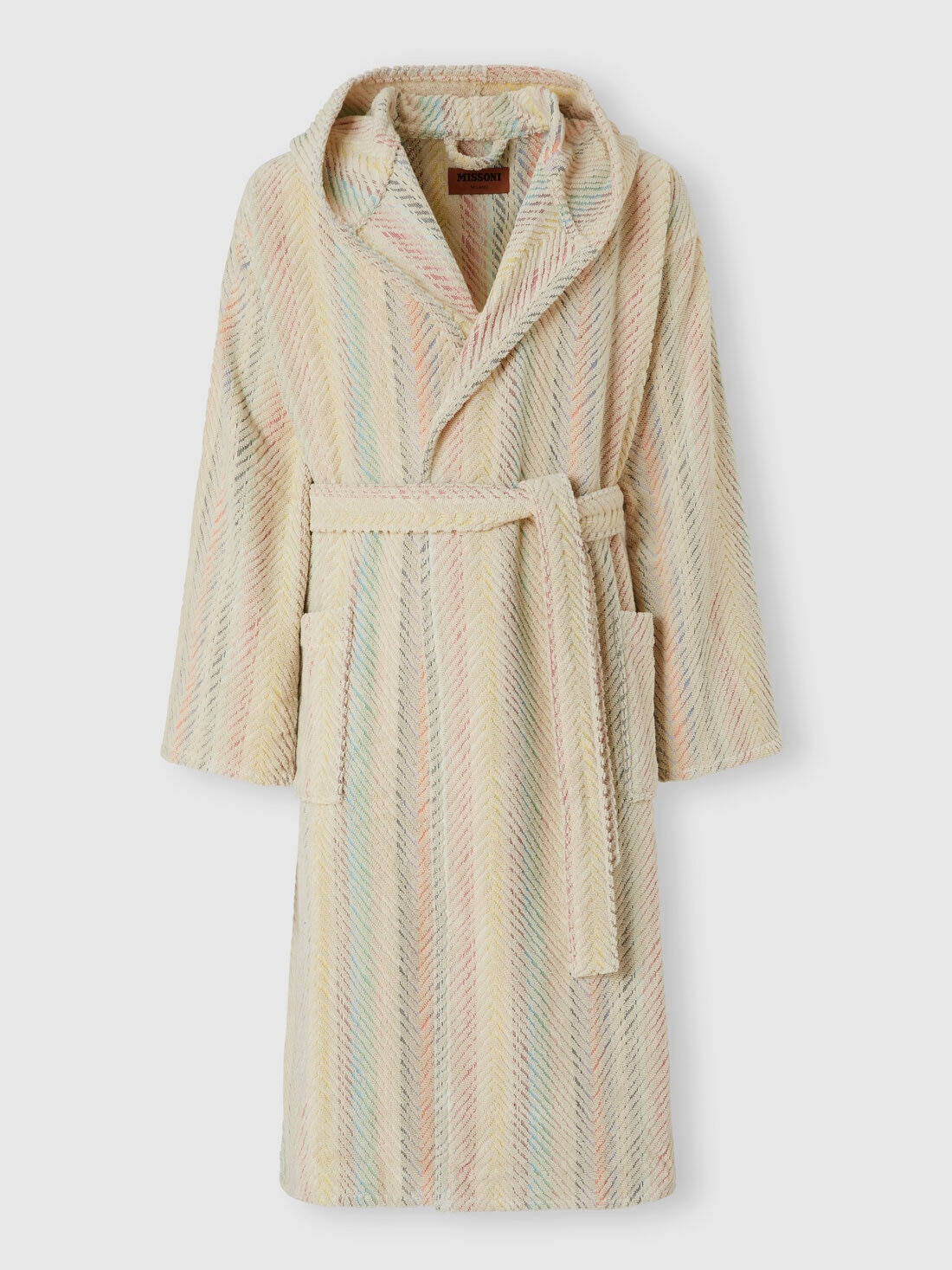 El albornoz con capucha Harmony representa la suavidad del rizo de algodón aterciopelado, y pone de relieve los rasgos distintivos del ADN de MissoniHome. Con el motivo de espigas en relieve, aquí superpuesto sobre rayas verticales, la prenda añade el toque inconfundible de Missoni a cada momento de la vida cotidiana.