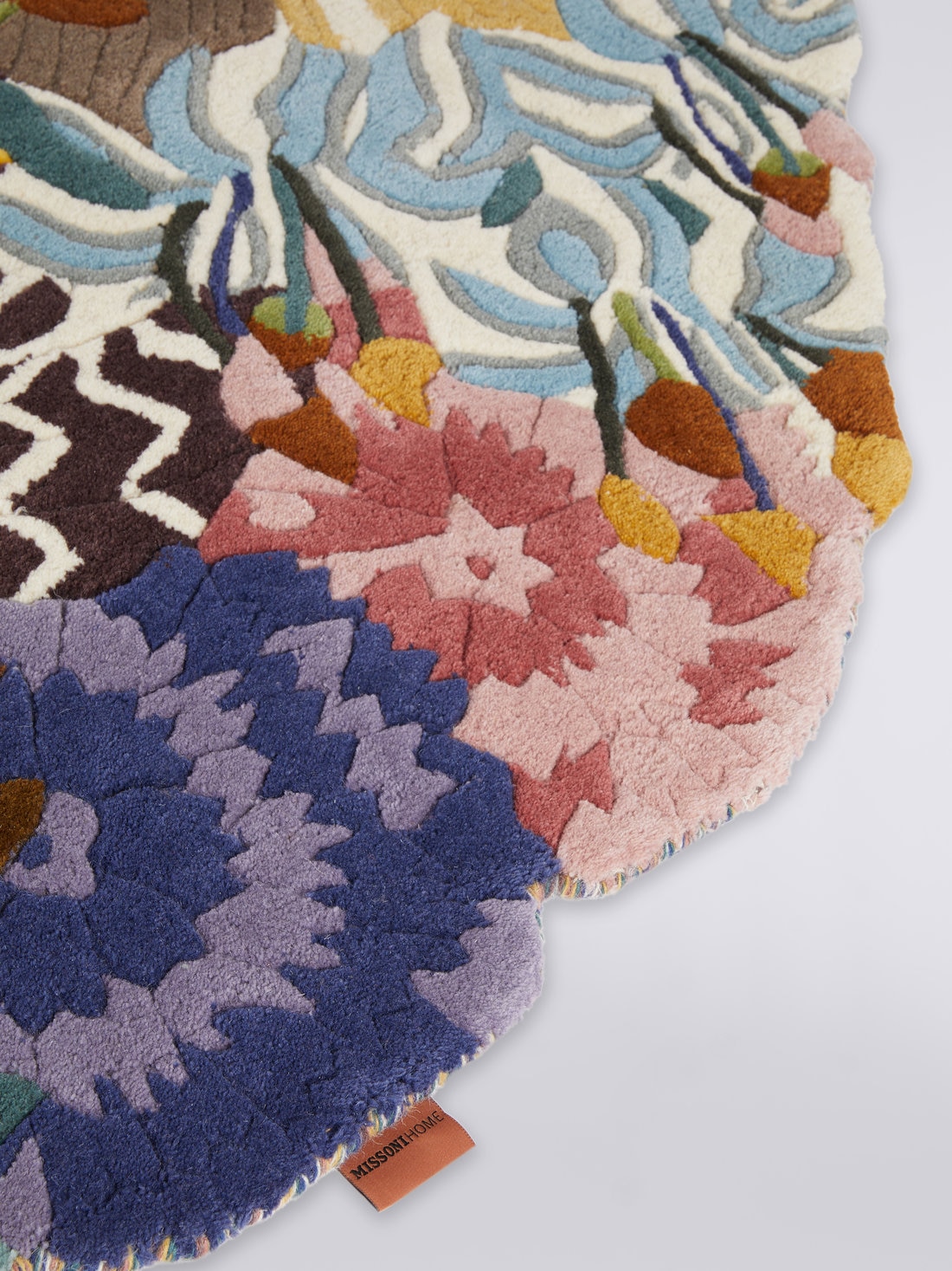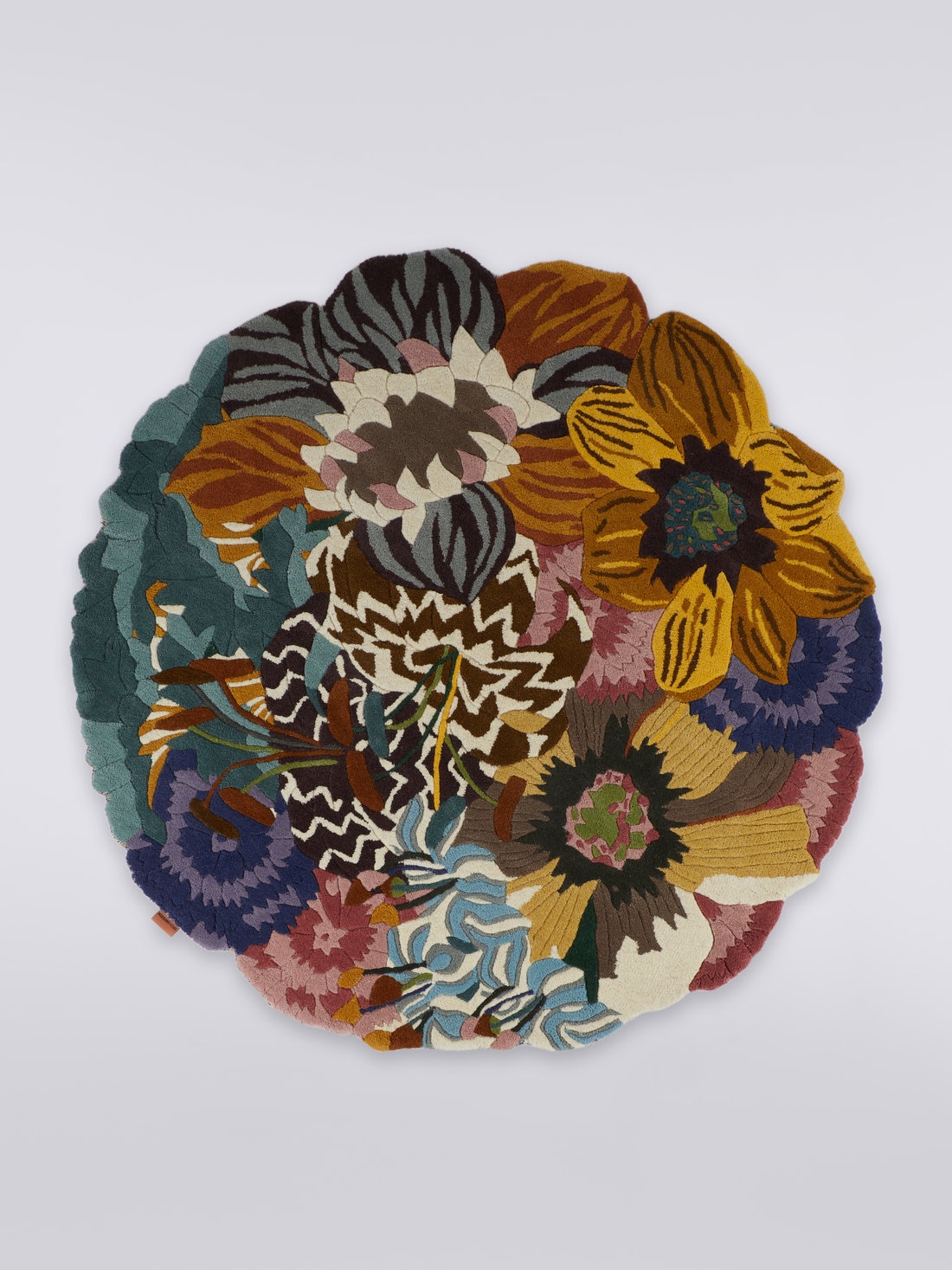 El placer de pasear sobre un remolino de flores y hojas también puede sentirse en casa gracias a Rajmahal, la alfombra redonda de Missoni. Enriquecido por la vibrante sucesión de corolas y pétalos que componen su original estampado floral, este accesorio de 150 cm de diámetro está totalmente confeccionado en lana.