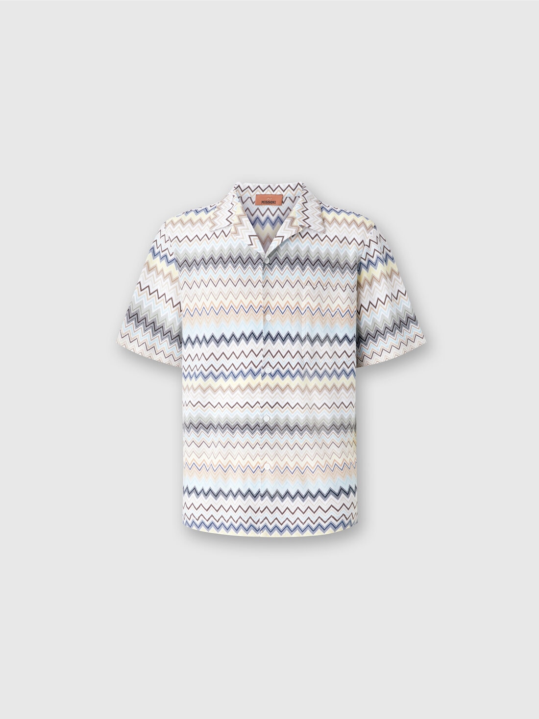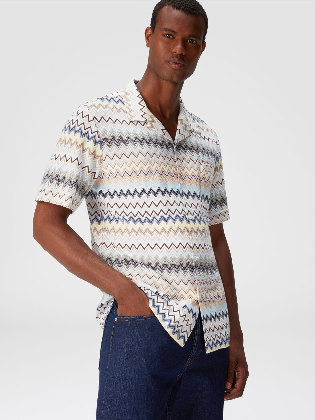 El punto de algodón laggera con punto raschel y patrón en zigzag da un reconocimiento inmediato a la camisa bowling de manga corta con bolsillo en el pecho. Para llevar el estilo Missoni incluso en las ocasiones más informales y deportivas.
