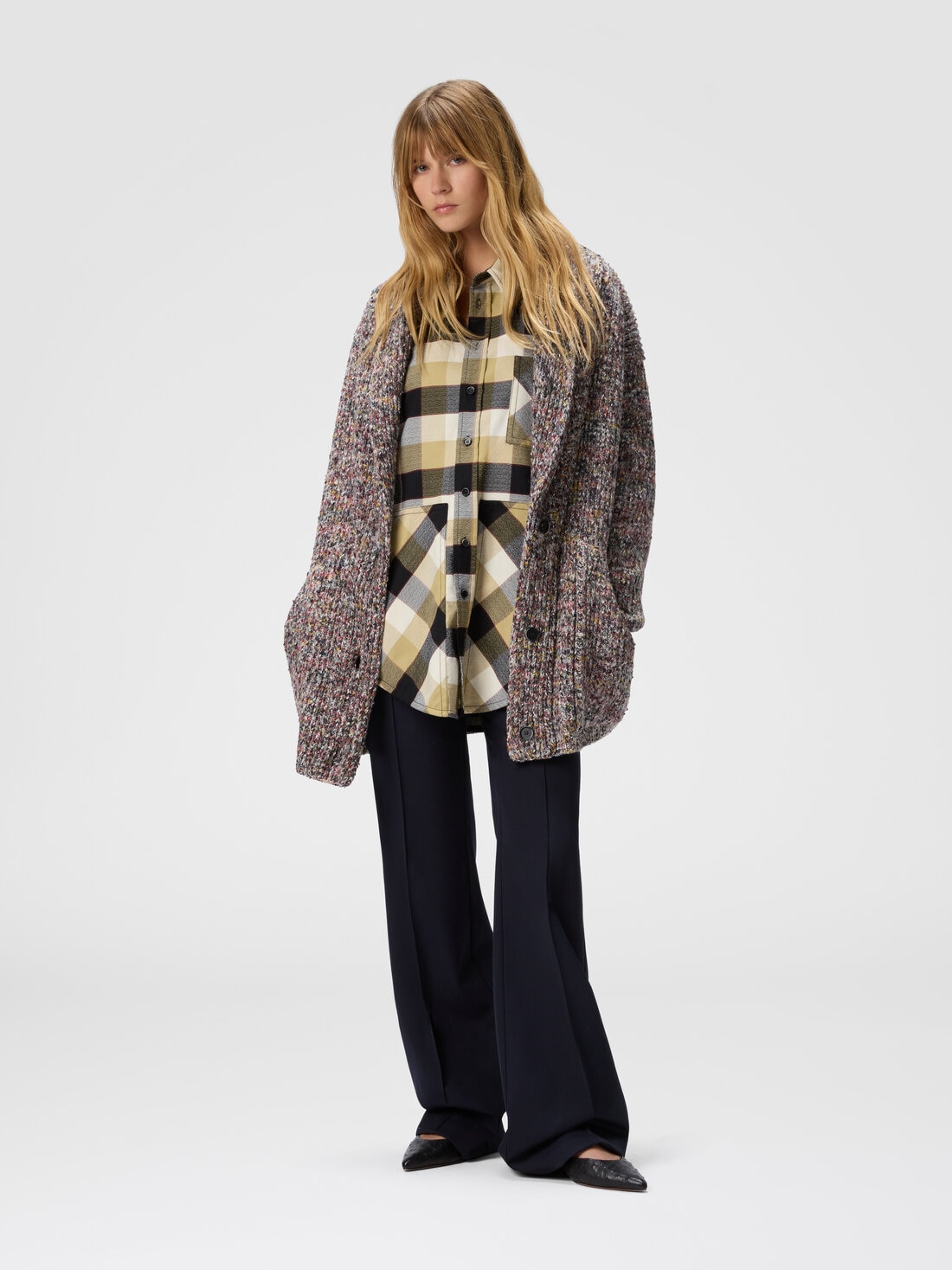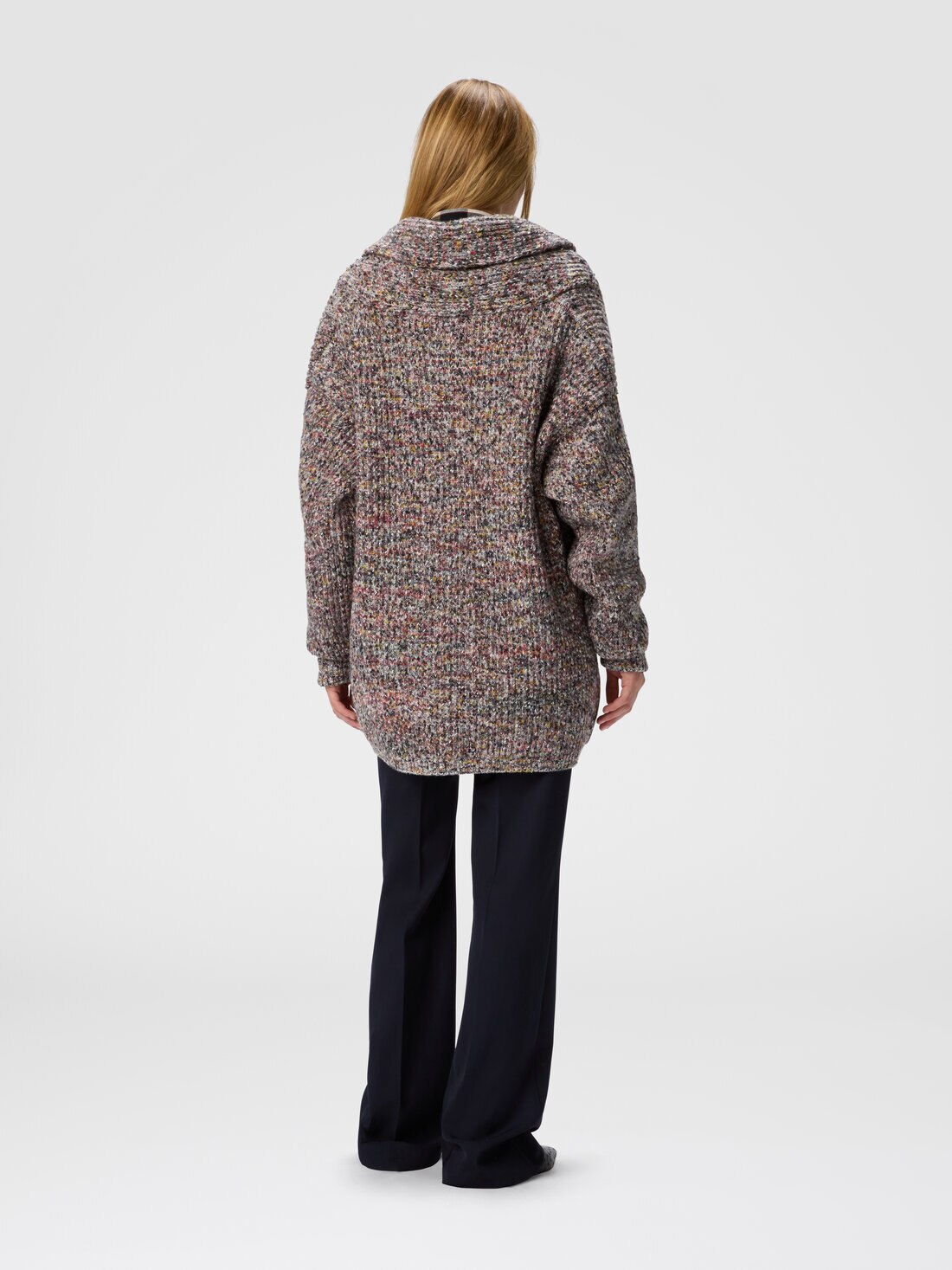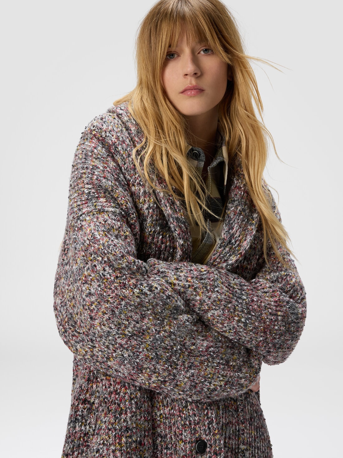 Cardigan oversize para mujer con tejido de canalé inglés jaspeado, realizado en mezcla de lana y algodón para un equilibrio perfecto entre suavidad y estructura. El diseño amplio y la trama refinada del canalé inglés añaden una dimensión táctil a la prenda, aportando un carácter distintivo y una sensación de comodidad envolvente.