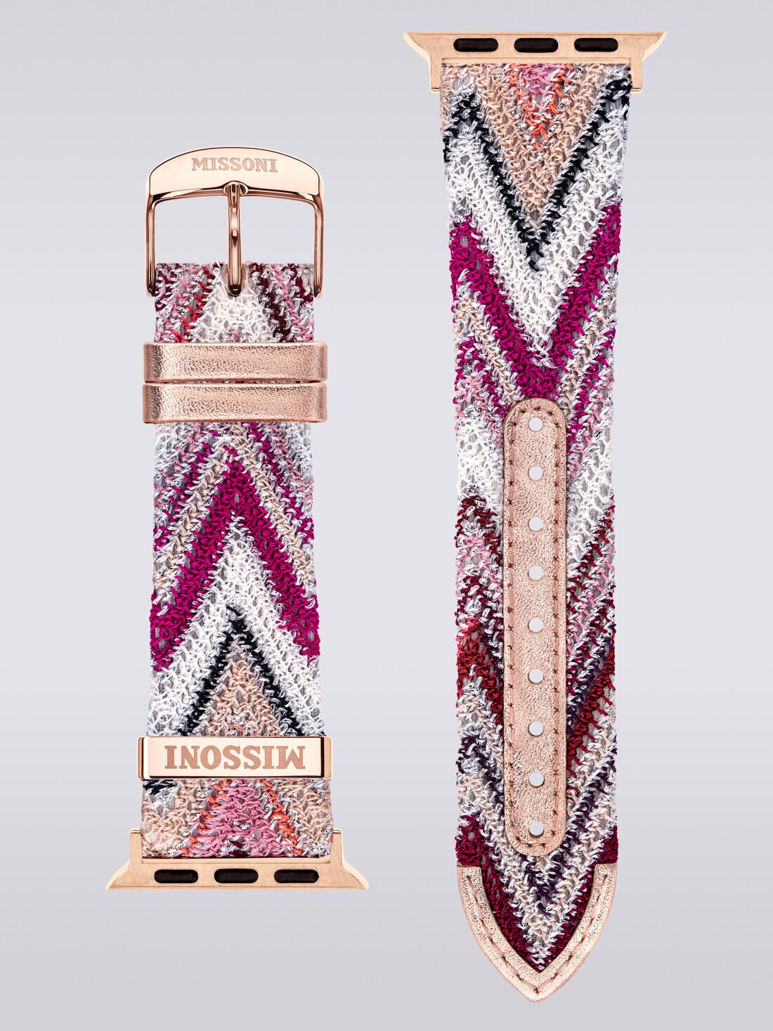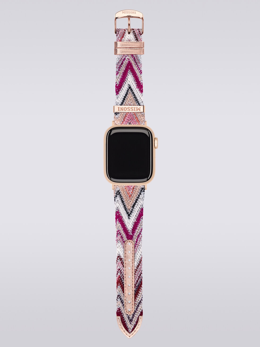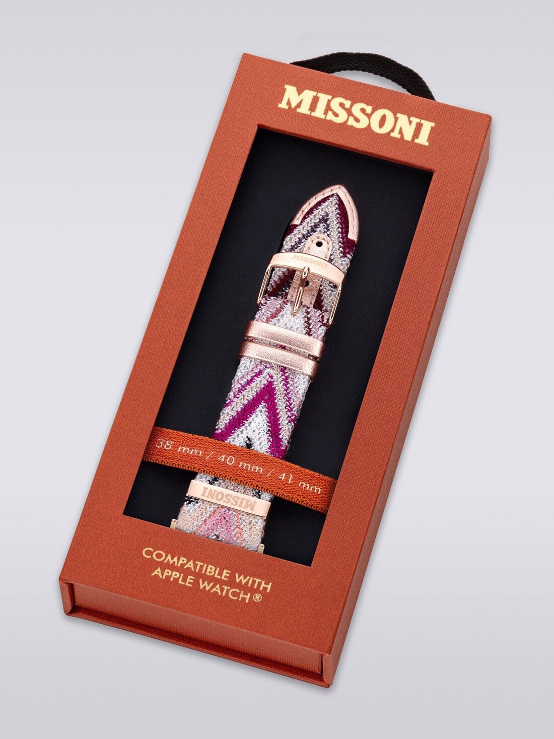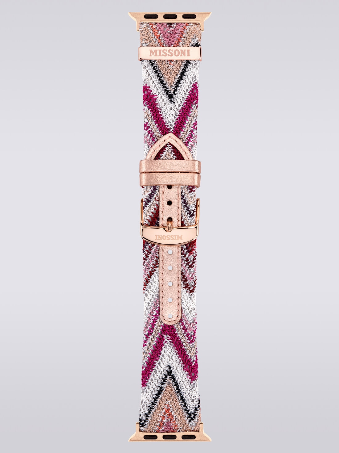 Fabricada con auténtico tejido Missoni, esta correa especial para Apple Watch© rinde homenaje al trabajo artesanal italiano y a su estética icónica. El elegante y moderno motivo en zigzag multicolor, junto con el logotipo de Missoni en la hebilla, hacen que este accesorio sea único y sofisticado. La correa es compatible con Apple Watch© hasta la Serie 8.