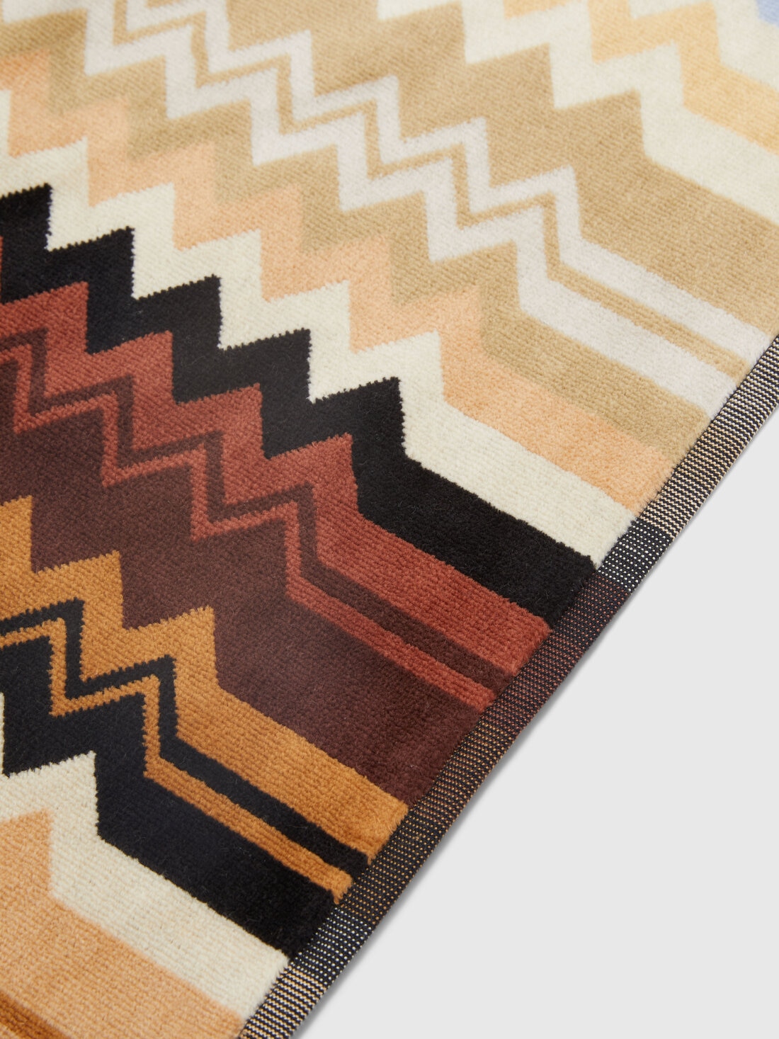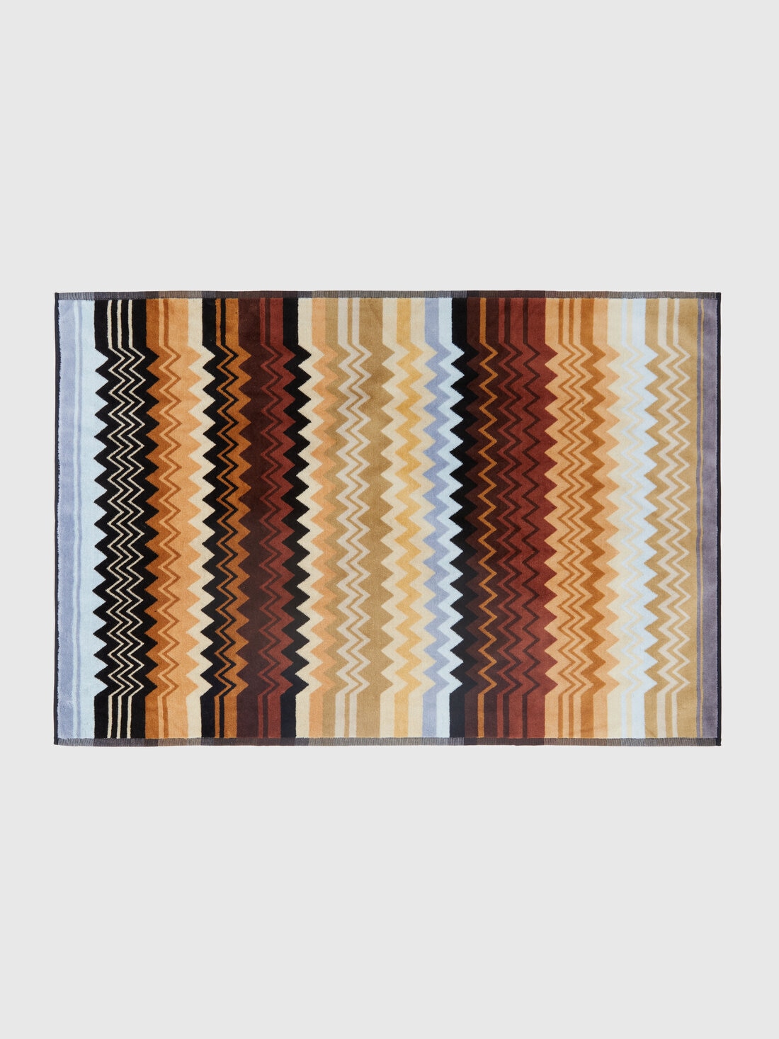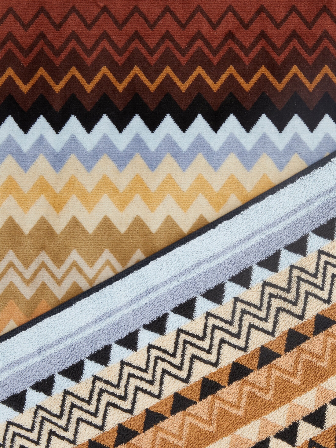 La alfombrilla de baño Giacomo de 90x60 cm es la quintaesencia del estilo Missoni: aquí, la calidad del rizo de algodón aterciopelado se une a la definición del estampado de espigas, que se sumerge en los bordes a rayas para animar este artículo precioso y atemporal.