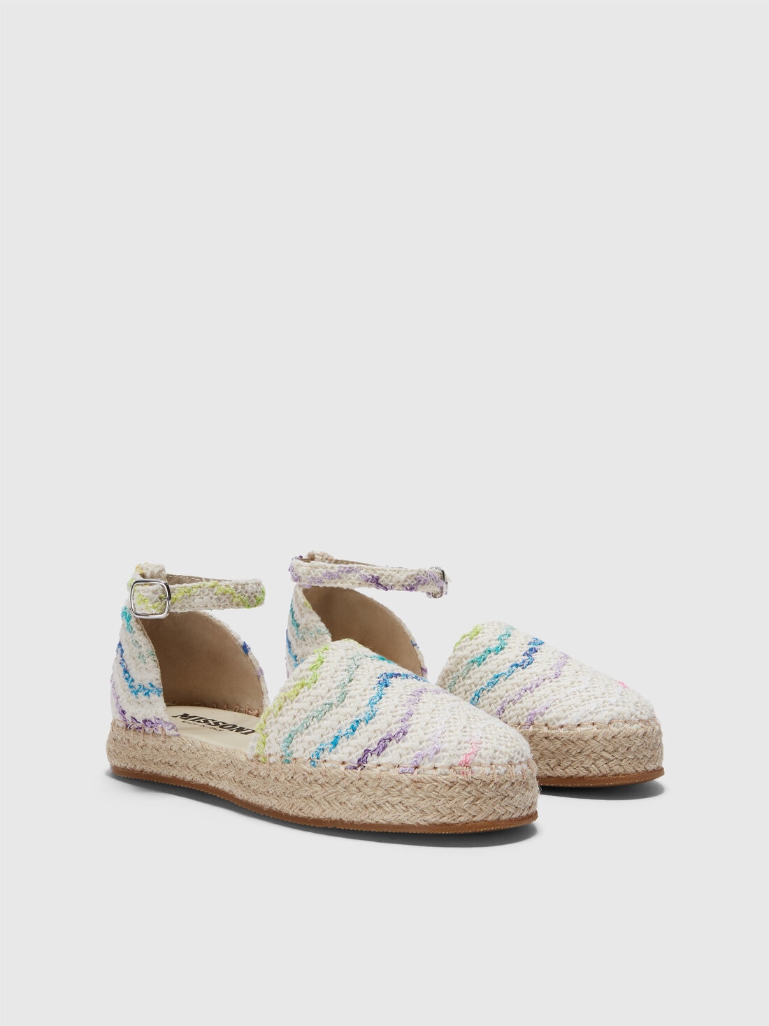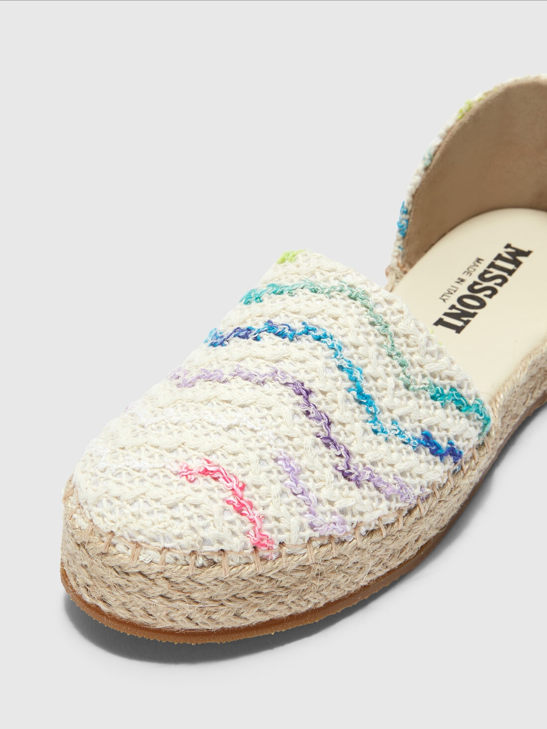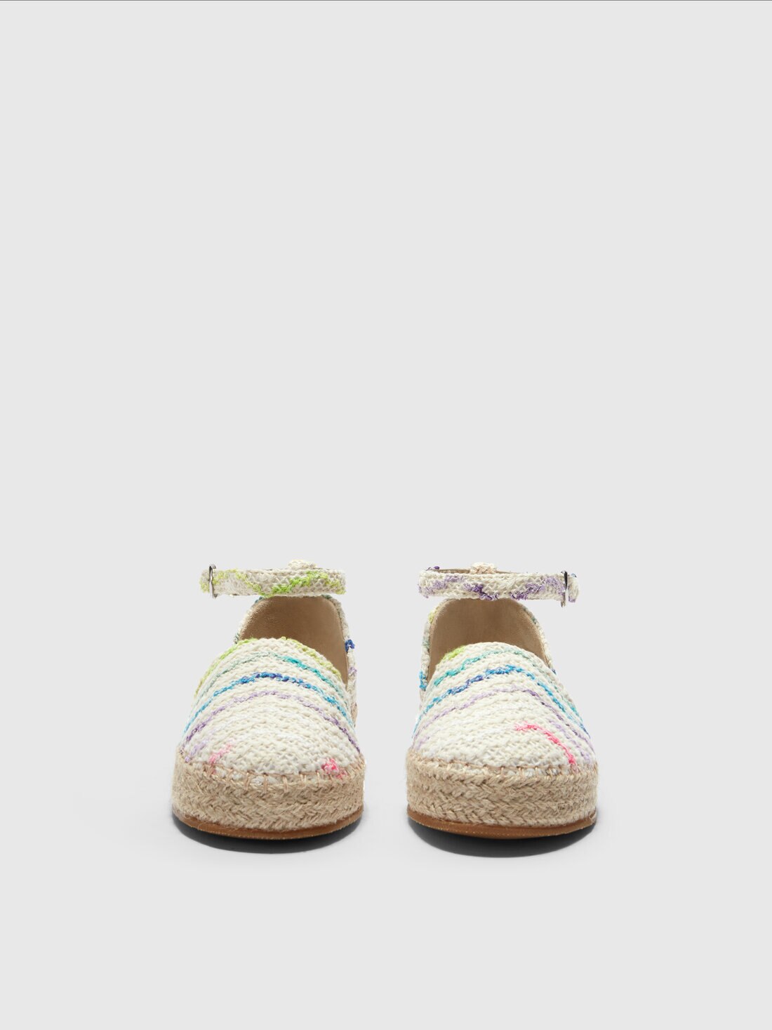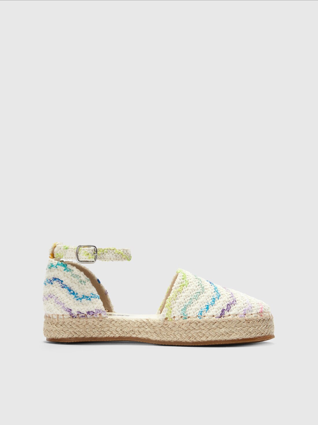 En las alpargatas de niña, el empeine de ganchillo con estampado de espigas multicolor se superpone a la parte inferior de cuerda trenzada típica del calzado veraniego por excelencia. El modelo, personalizado con la inscripción del logotipo, presenta una suela de goma.