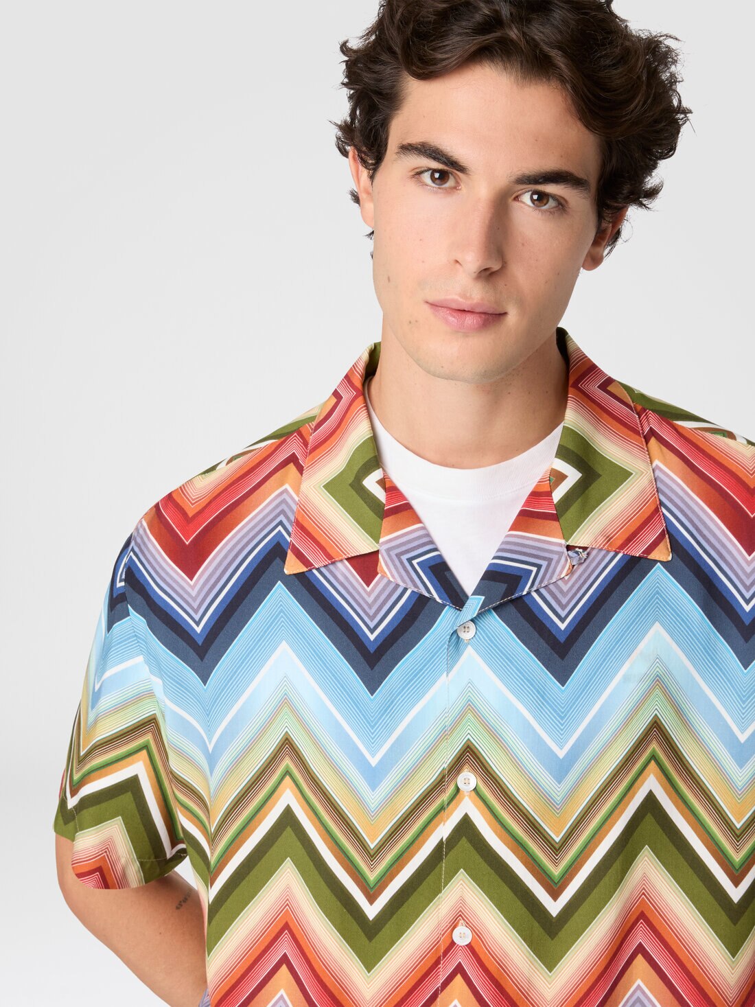 El motivo de macro zigzag anima esta camisa bowling de manga corta para hombre en viscosa, fusionando tradición y modernidad en un equilibrio de estilo relajado e identidad inconfundible.