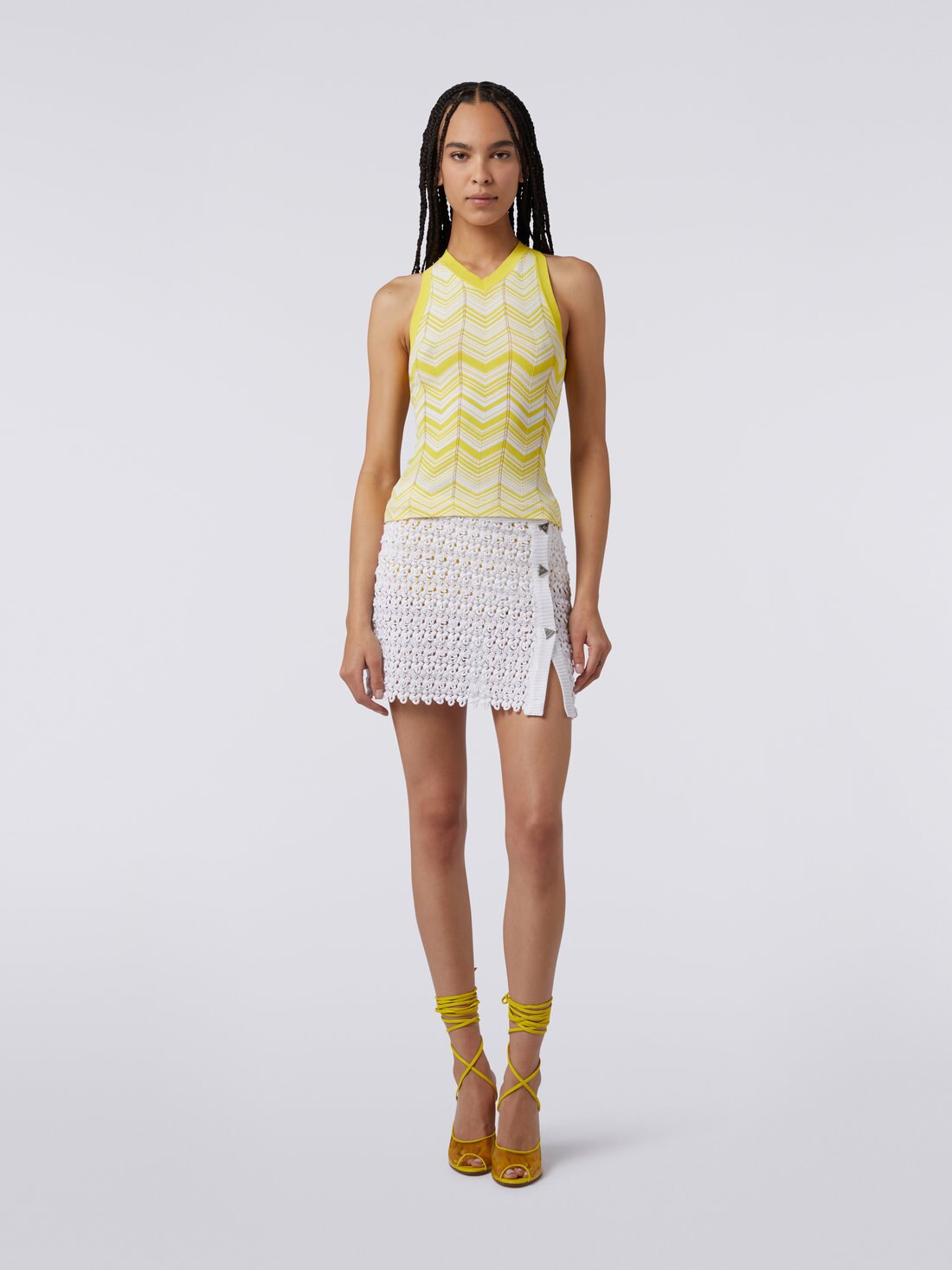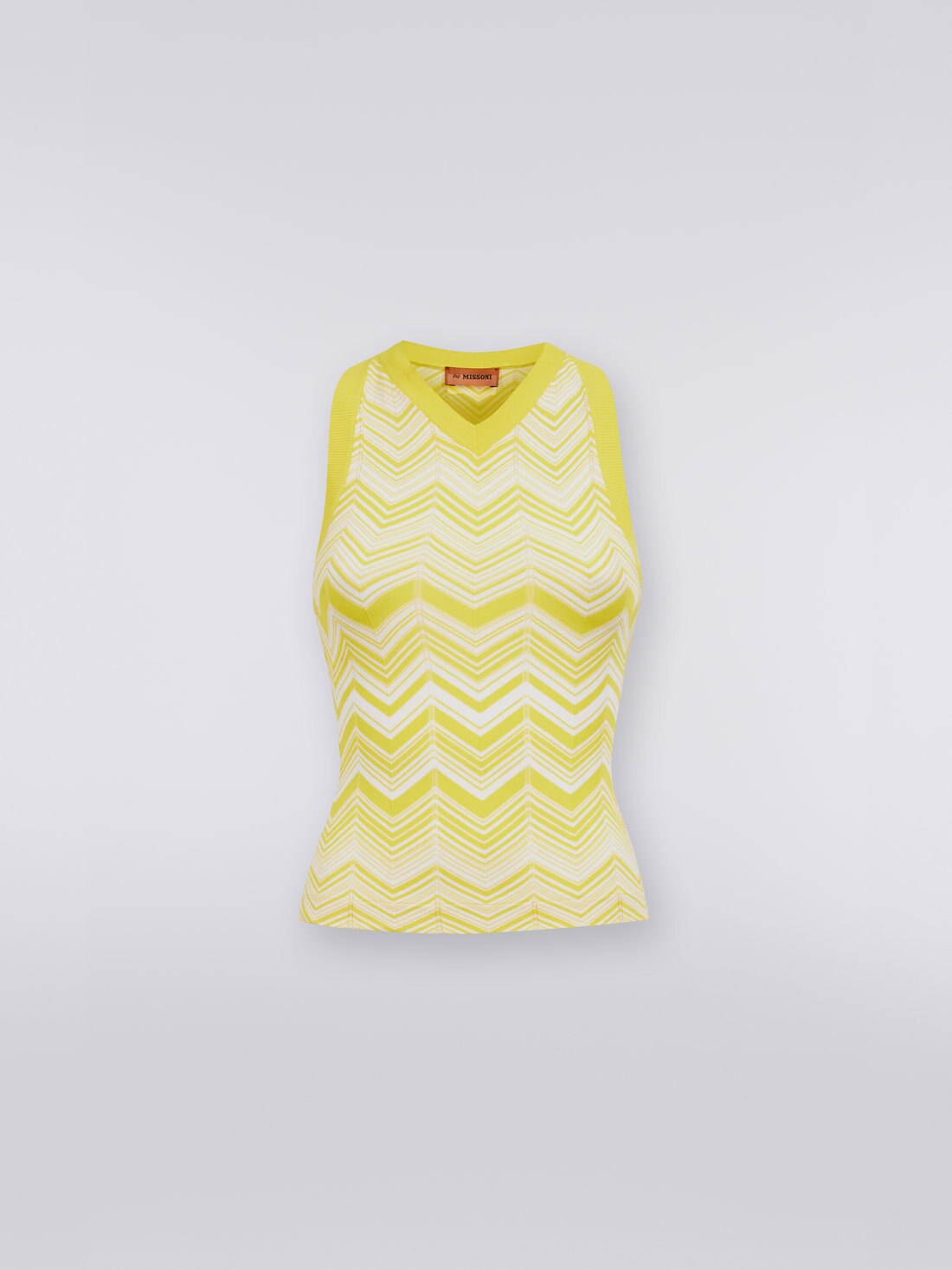 Combinando el estilo atlético del escote olímpico en la espalda y el carácter desenfadado y chic del punto de viscosa elástica con estampado a espigas, esta camiseta sin mangas para mujer presenta un discreto escote delantero en pico y ribetes en color liso.