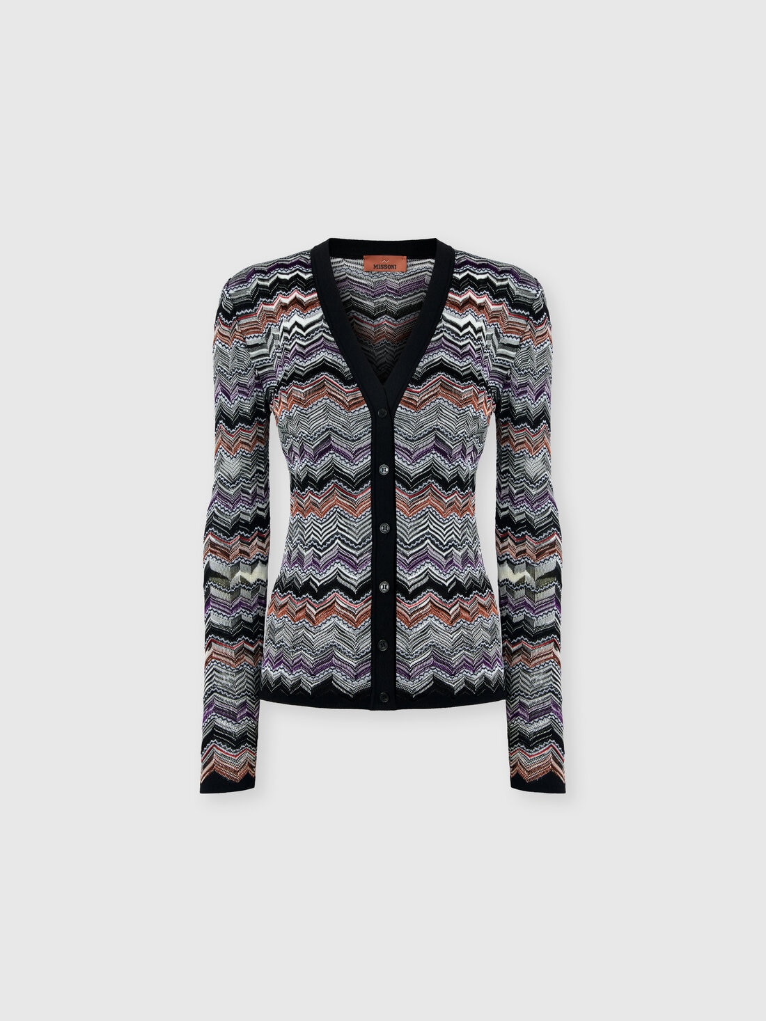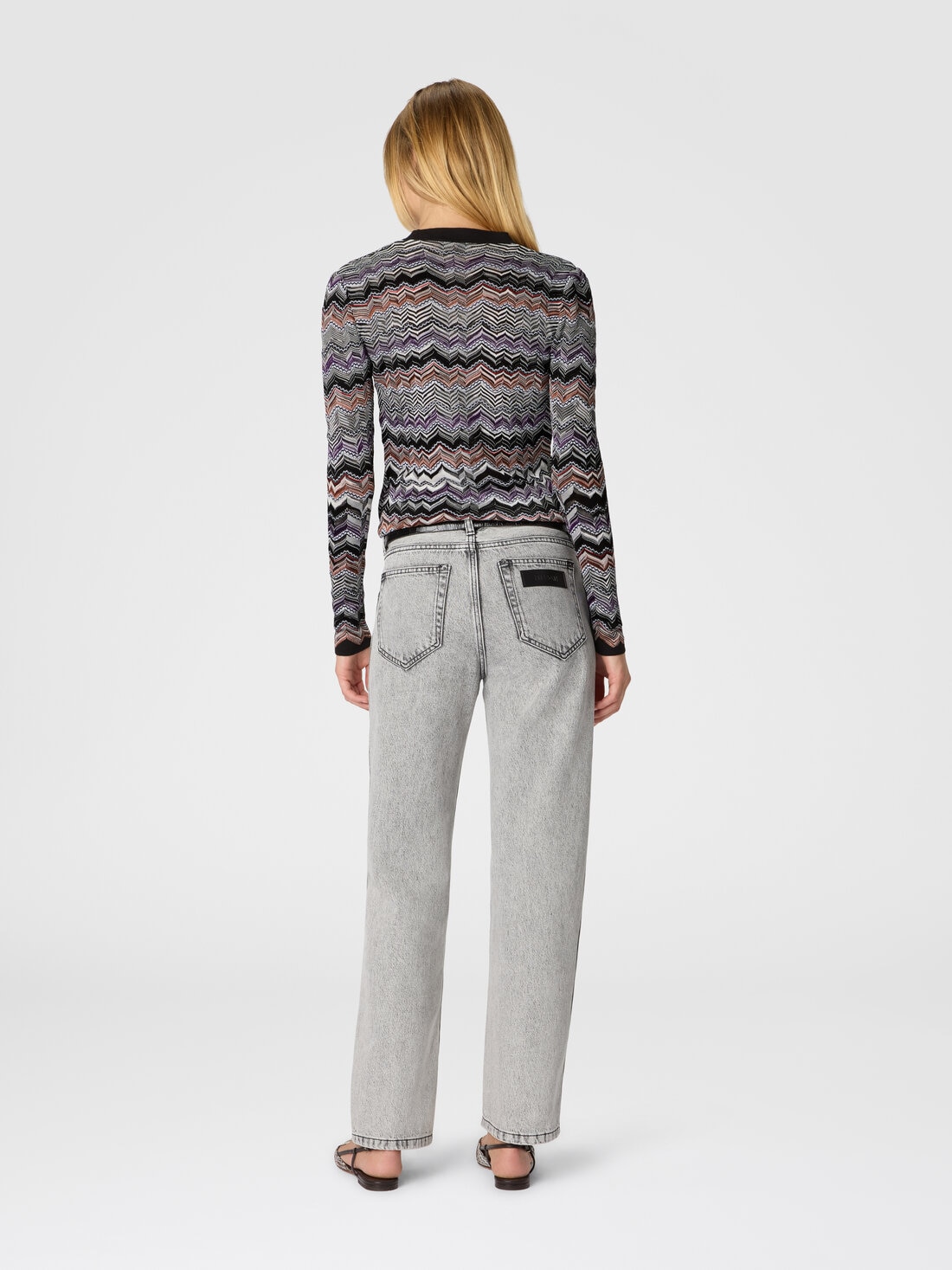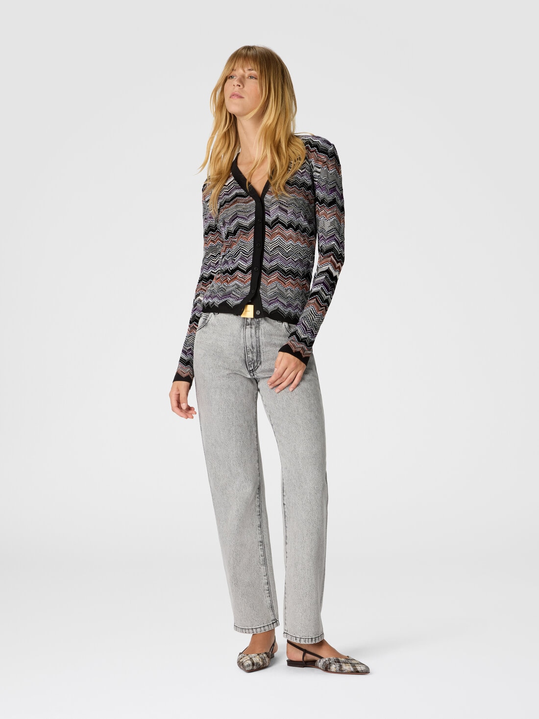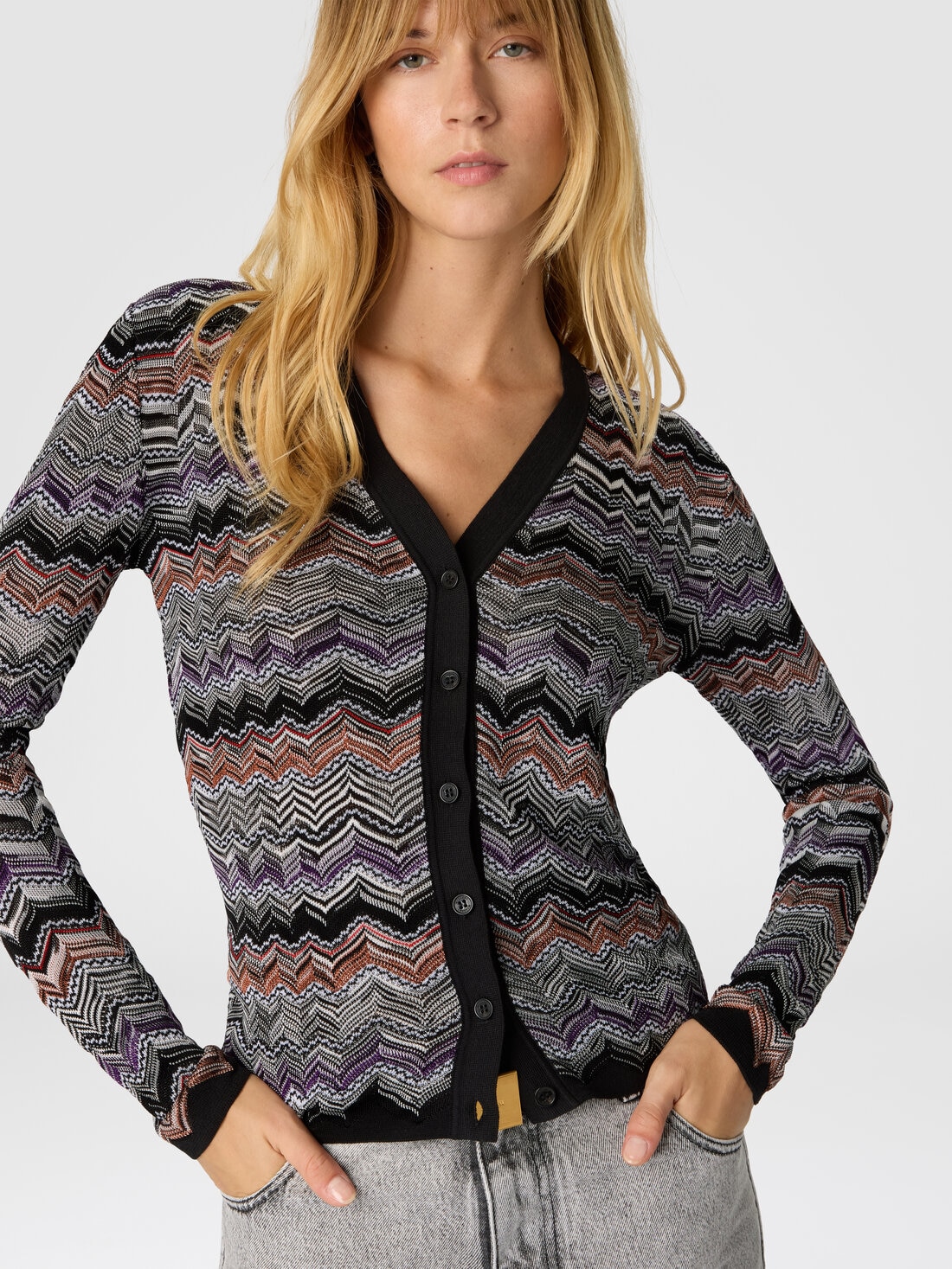 Cárdigan slim con botones para mujer, confeccionado en punto inglés con el icónico motivo chevron flameado de Missoni, que aporta dinamismo y reconocibilidad a la prenda. Los acabados en contraste completan el diseño con un detalle gráfico decidido, perfecto para un estilo distintivo y contemporáneo.