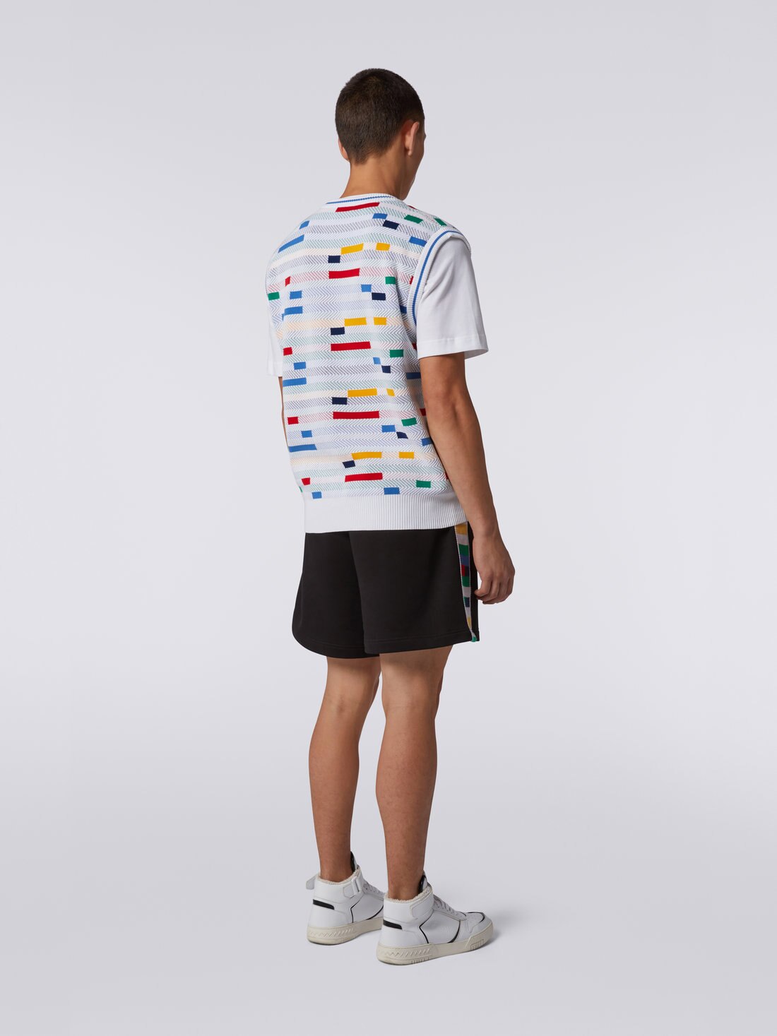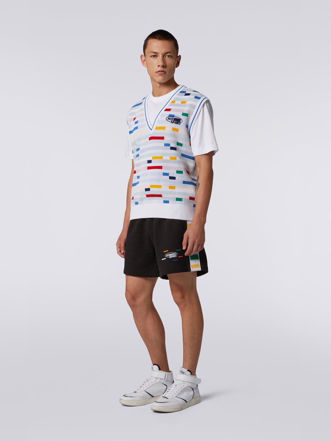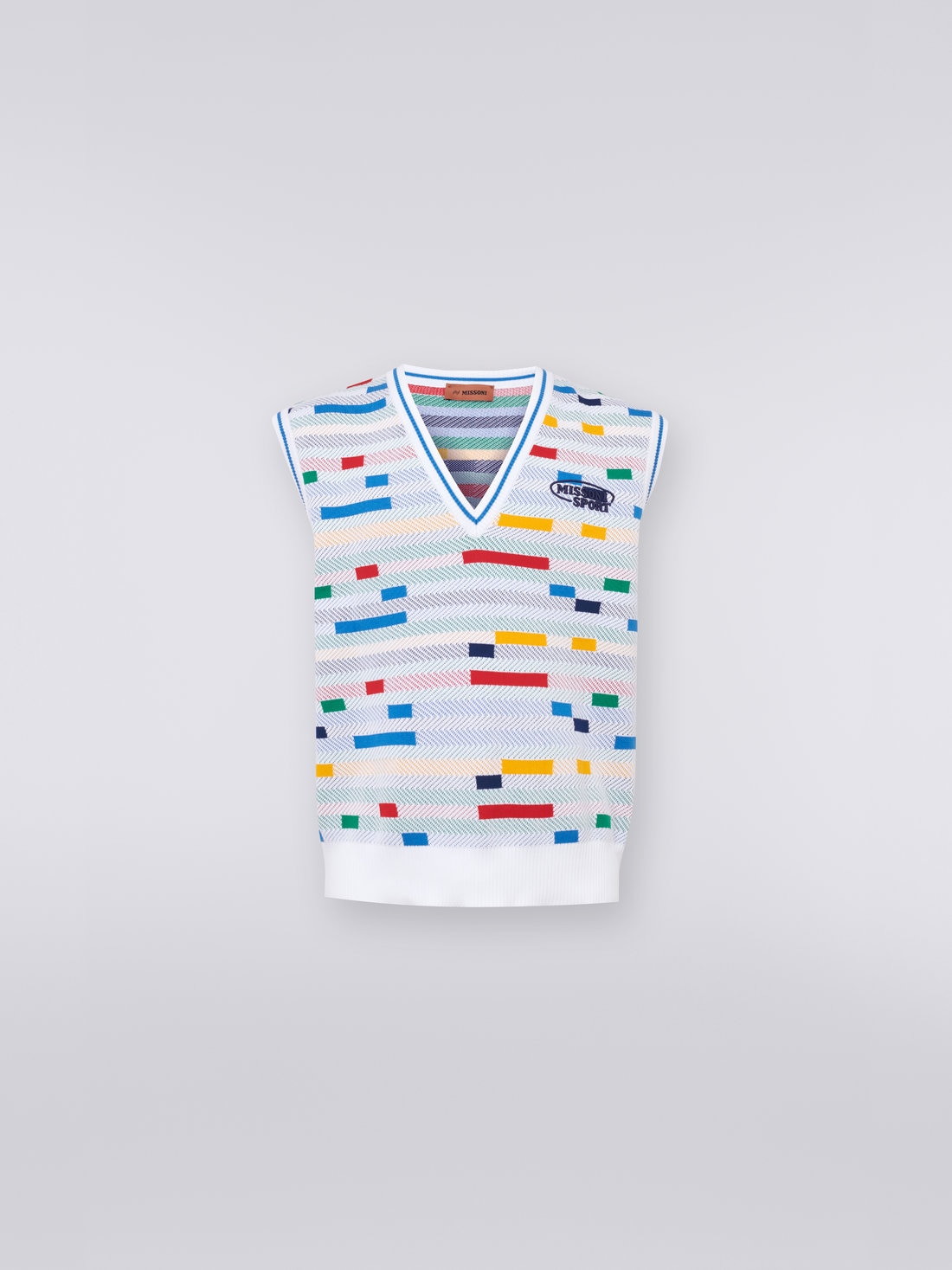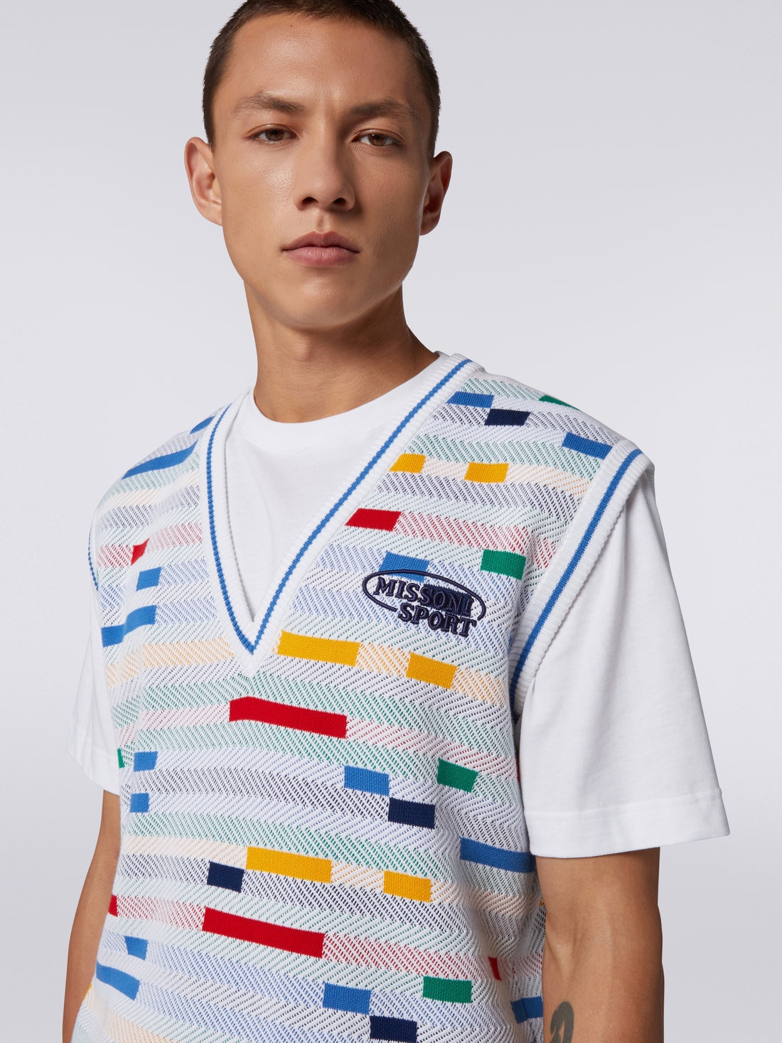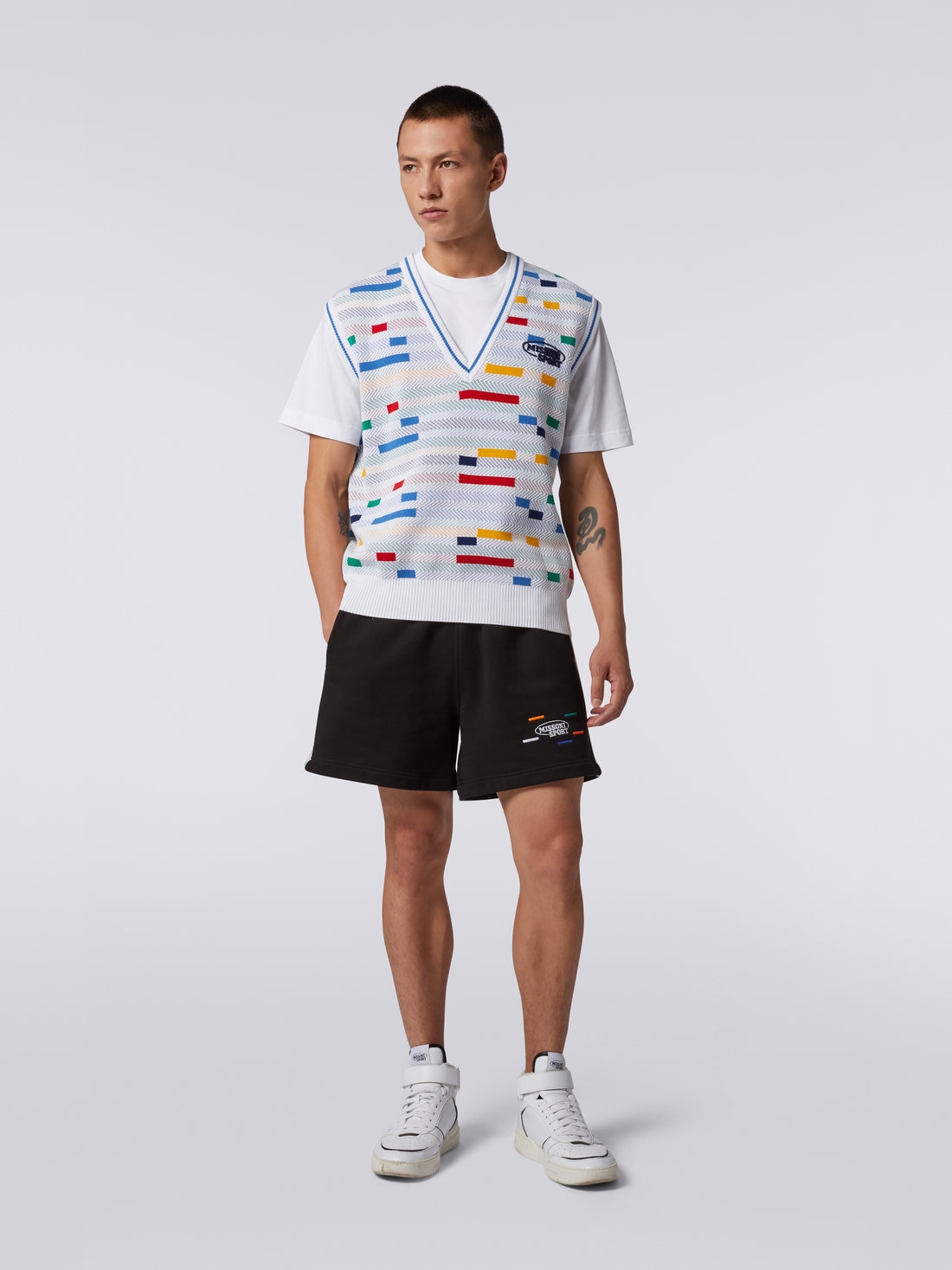 Chaleco de hombre de puro algodón con un toque contemporáneo inspirado en los noventa. Este modelo de punto presenta detalles en jacquard multicolor que evocan el histórico logotipo de la línea deportiva de Missoni. La prenda, personalizada con la inscripción bordada, es la expresión perfecta de la herencia de la marca.