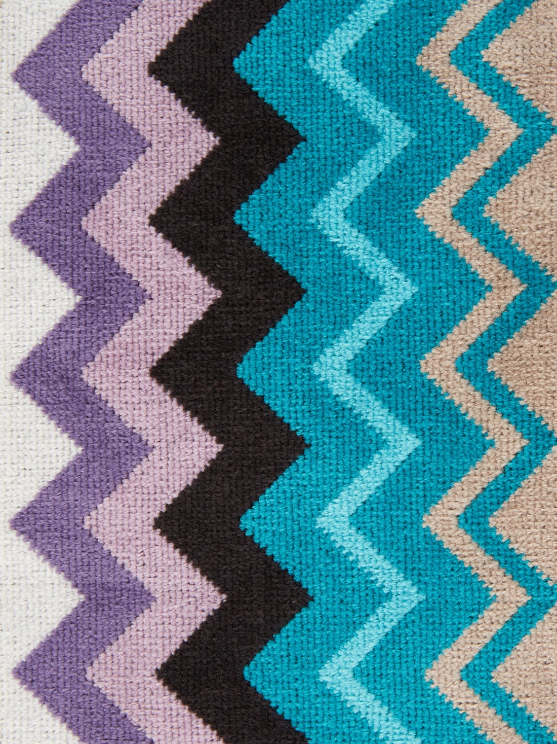 La toalla de baño Giacomo de 100x150 cm es la quintaesencia del estilo Missoni: aquí, la calidad del rizo de algodón aterciopelado se une a la definición del estampado de espigas, que se sumerge en los bordes a rayas para animar este artículo precioso y atemporal.