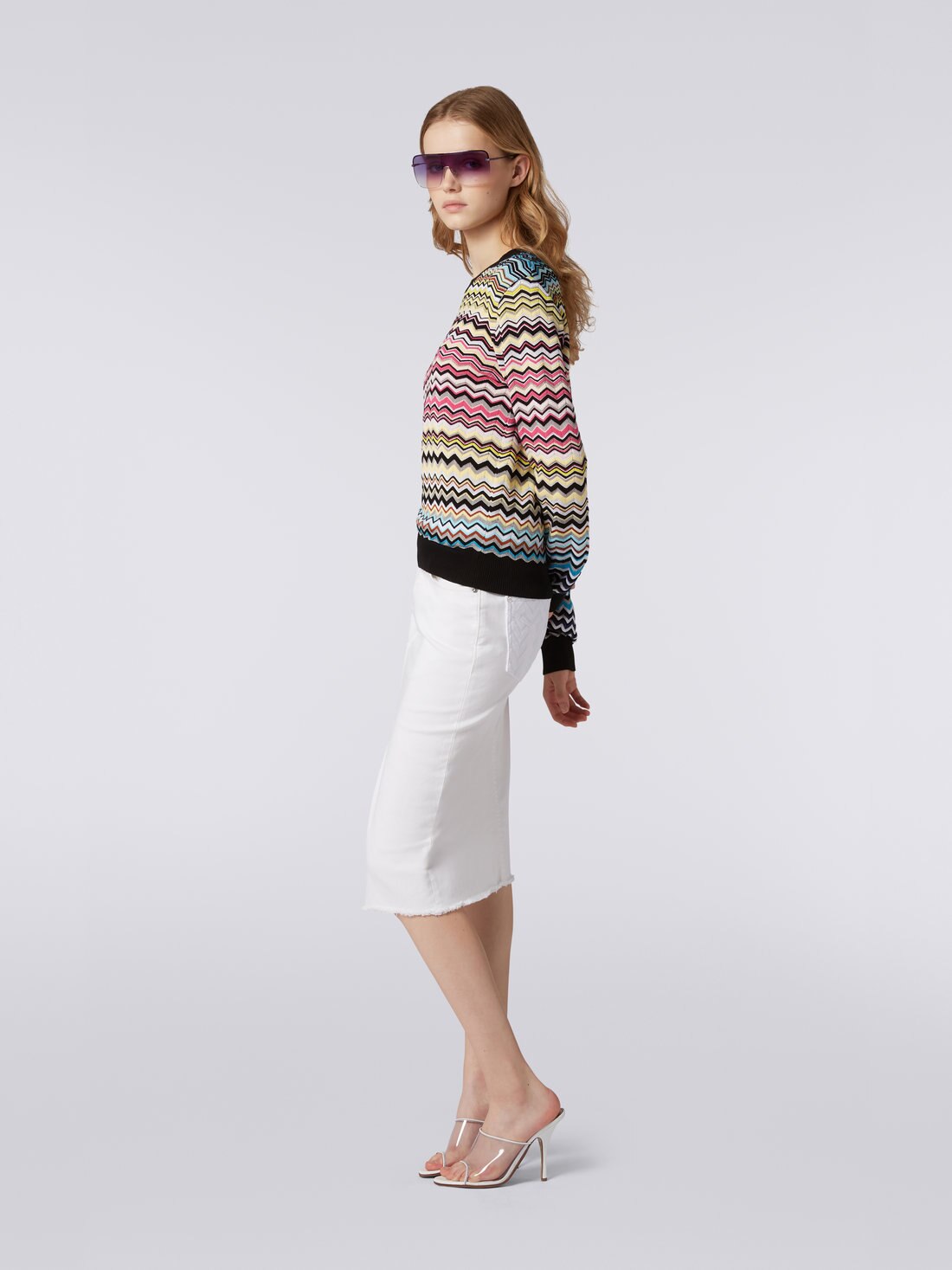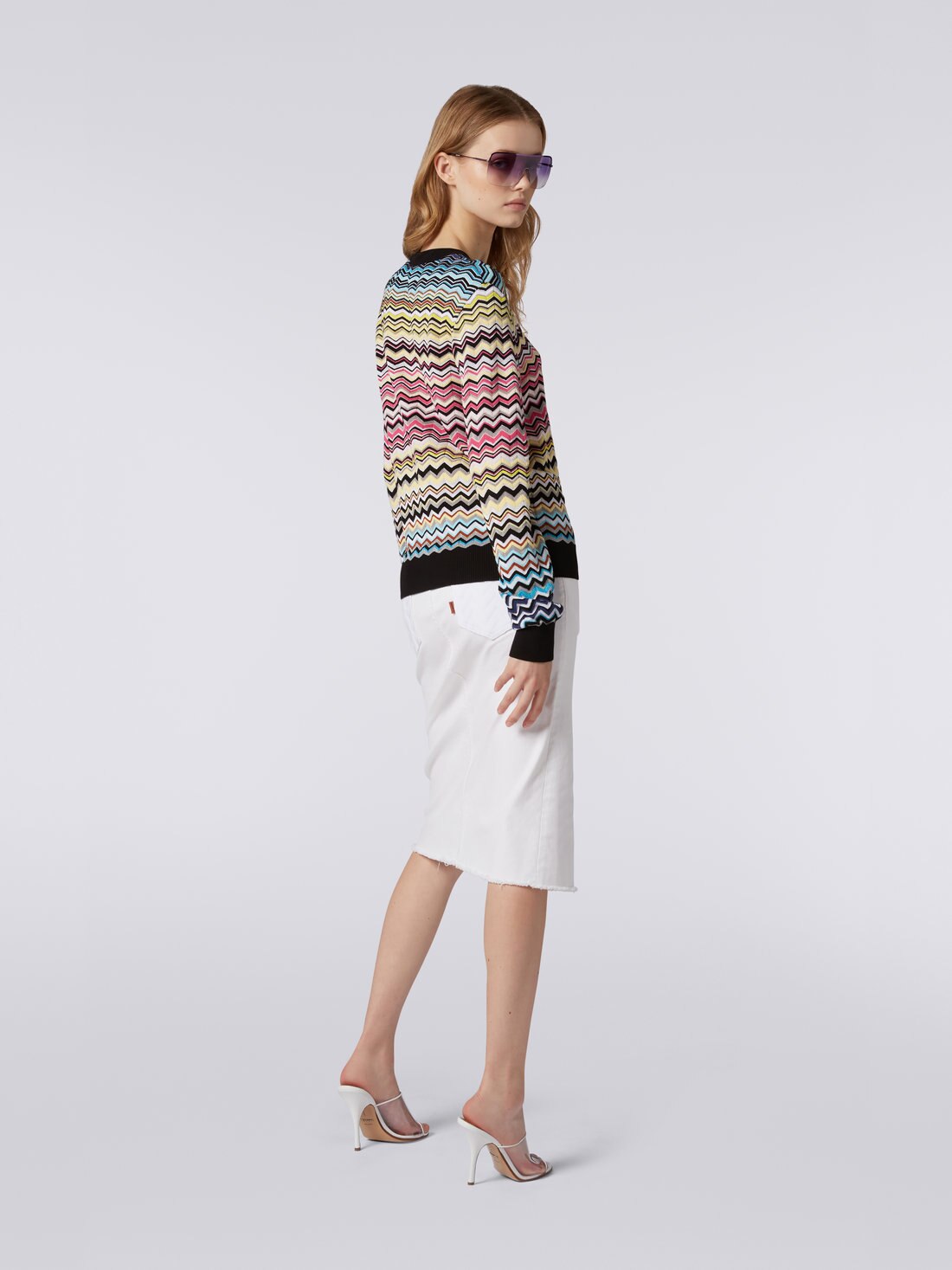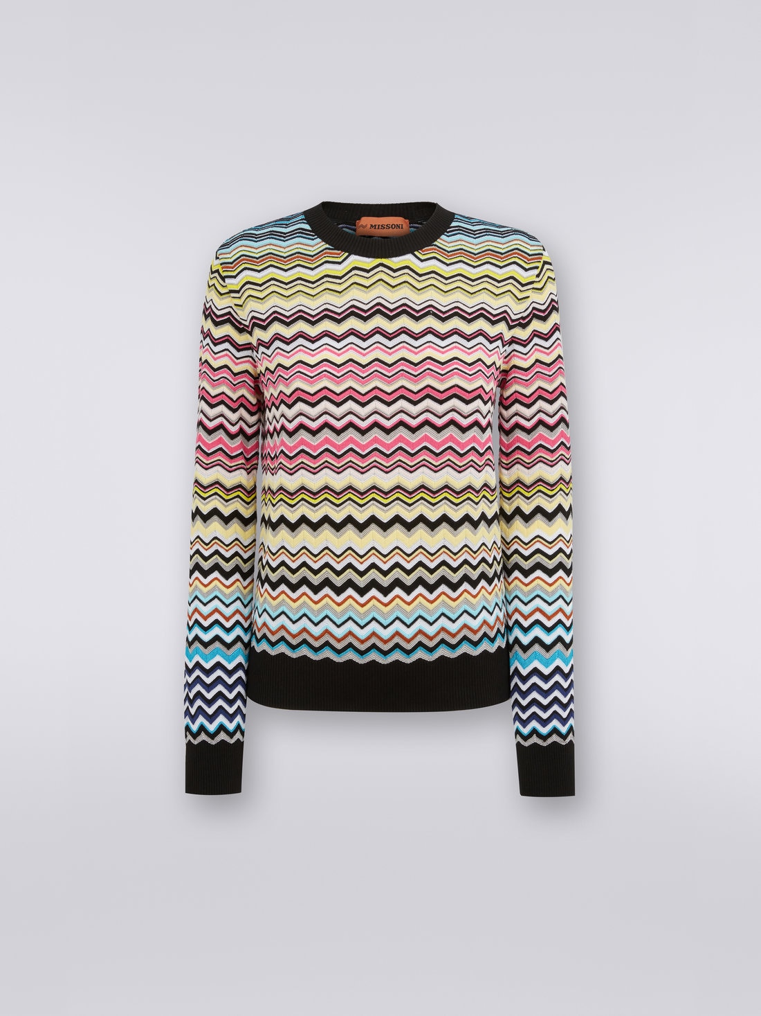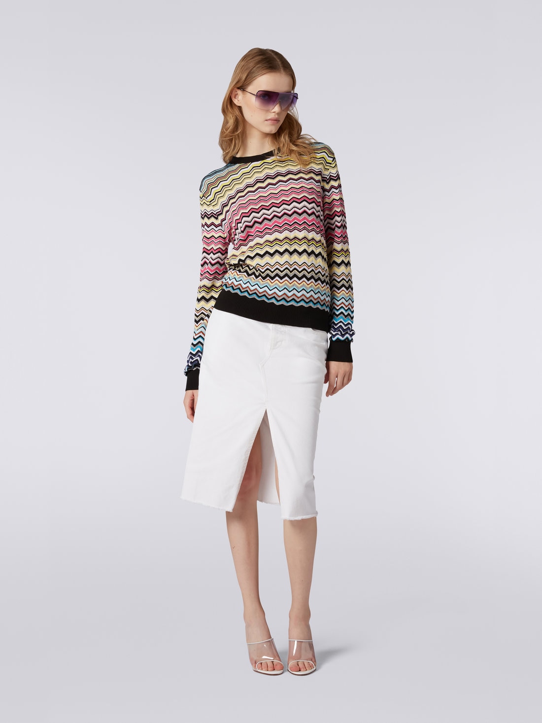 Las espigas multicolores en degradado con fondos variables alegra este jersey de cuello redondo de mujer en mezcla de algodón y viscosa. El diseño se acentúa con los ribetes acanalados de color liso.