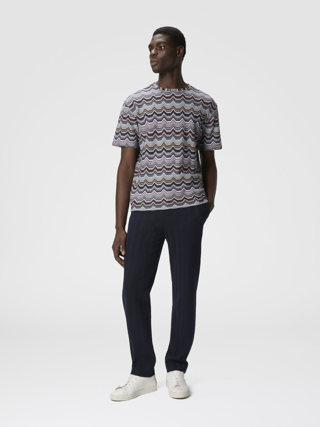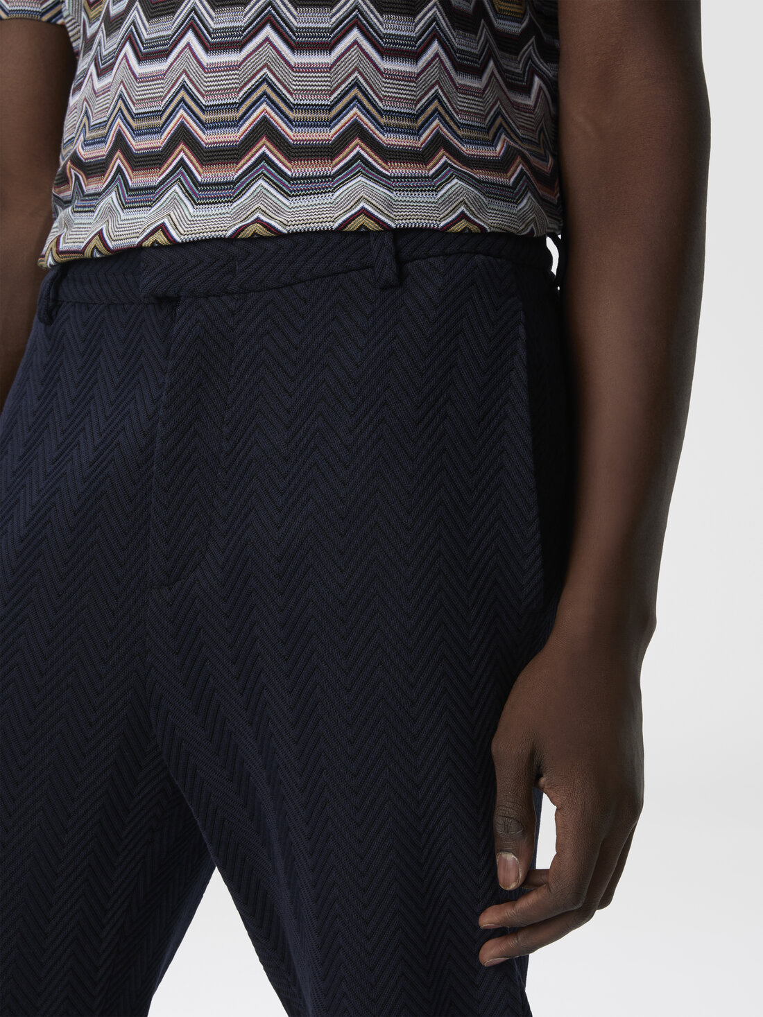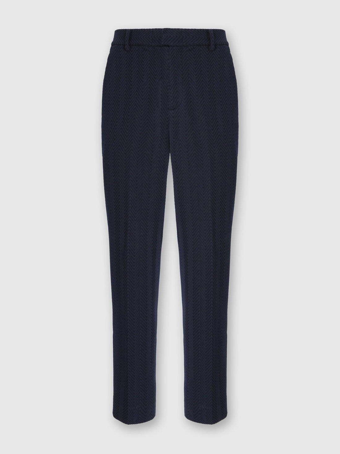 El corte recto subraya la línea elegante de estos pantalones de hombre en tejido con motivo zig zag tono sobre tono. Las trabillas en la cintura, el cierre oculto, los bolsillos laterales y la raya planchada realzan el clasicismo del modelo.