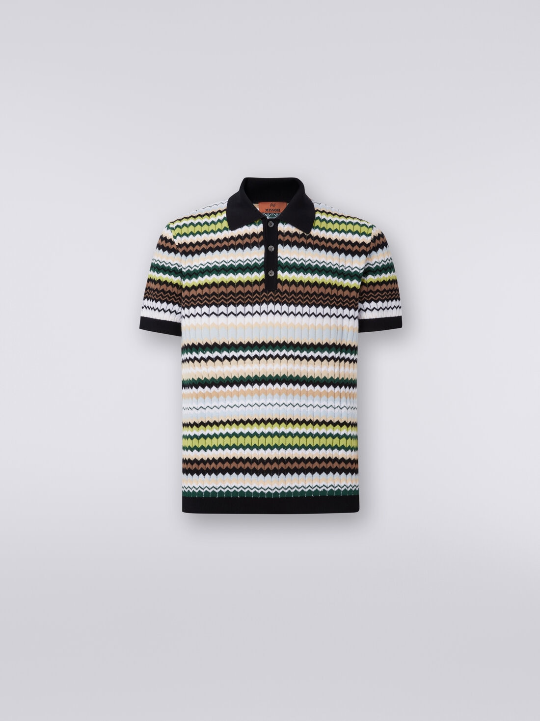 Caracterizado por su particular confección con hilo bouclé combinado con el motivo de espigas, este polo de manga corta para hombre está confeccionado en algodón puro. El cuello, el bajo y las sisas de color liso completan su refinado diseño.