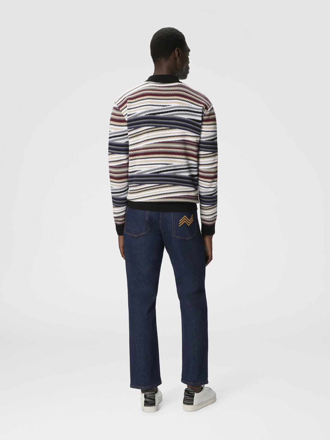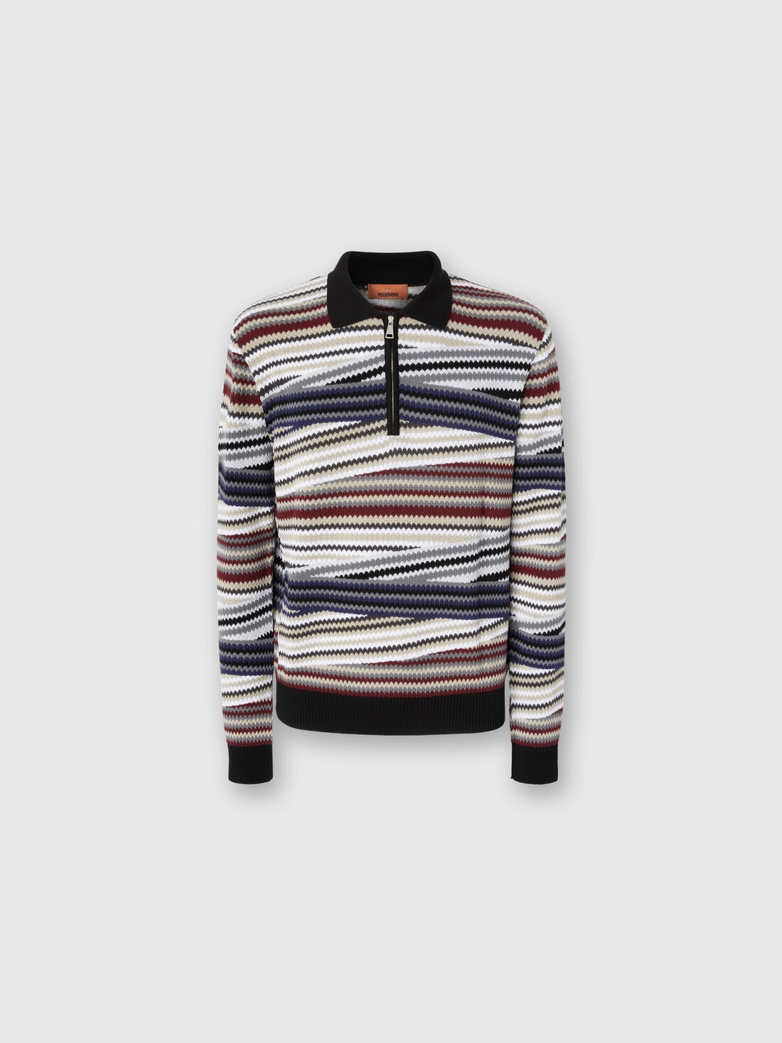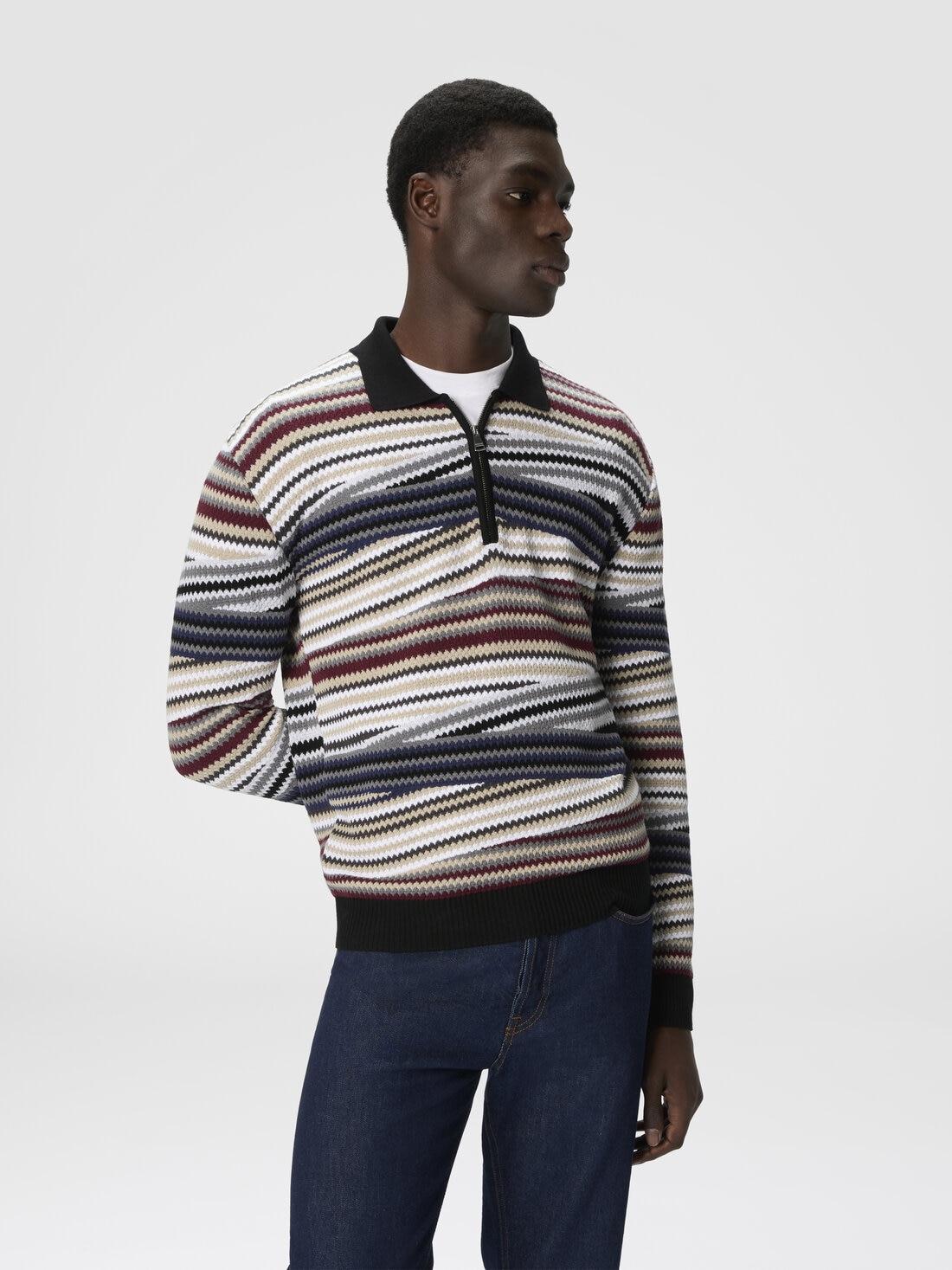 El típico motivo zig zag reinterpretado anima este polo de manga larga con cremallera para hombre, confeccionado en algodón. Su confección a rayas otorga un toque distintivo y moderno, combinando la elegancia atemporal de Missoni con un diseño práctico y contemporáneo.