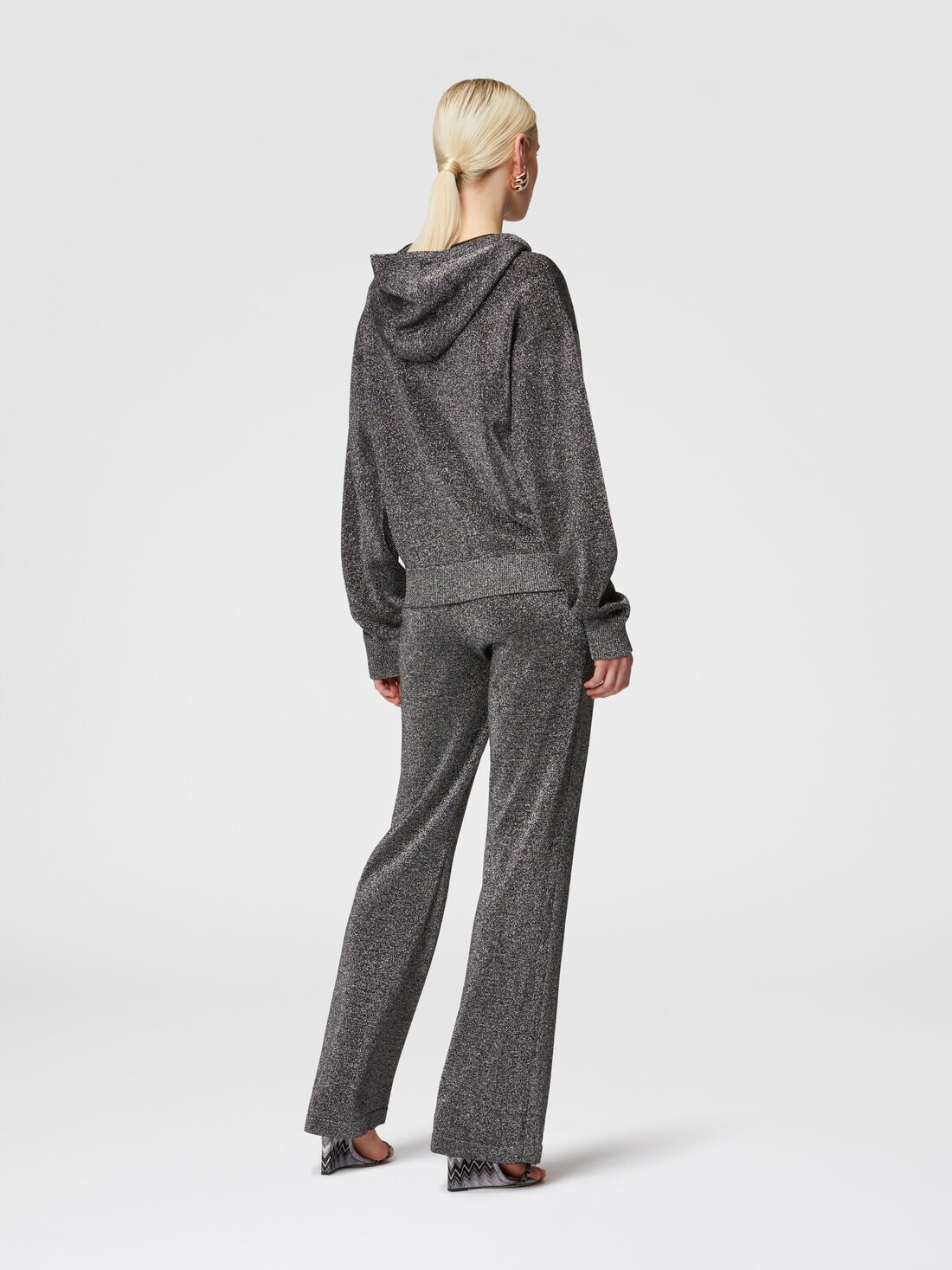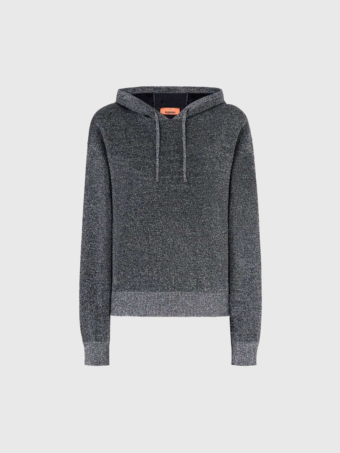 Viscosa con purpurina para un efecto multifacético: así es como el jersey con capucha y cordón adquiere un carácter "disco", perfecto para embellecer cualquier look.