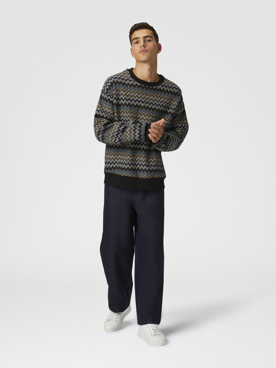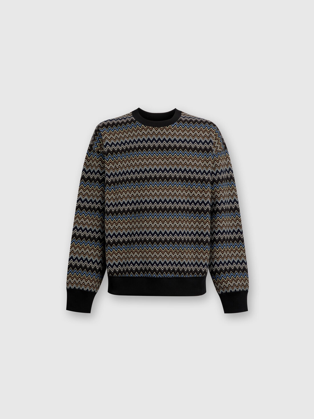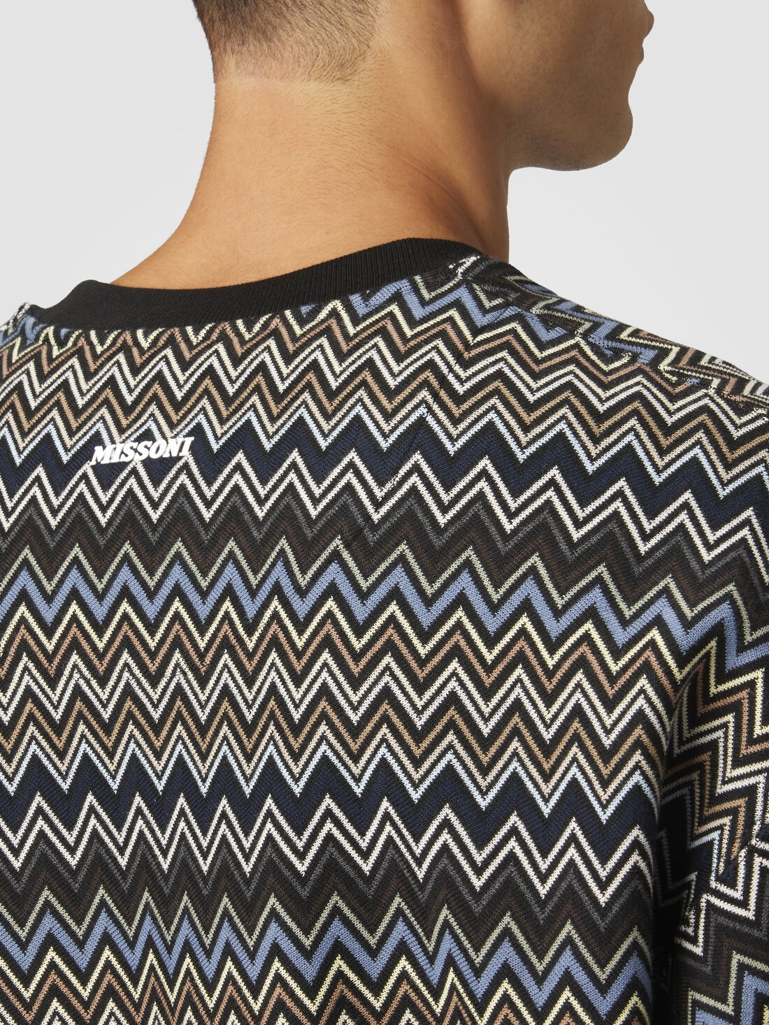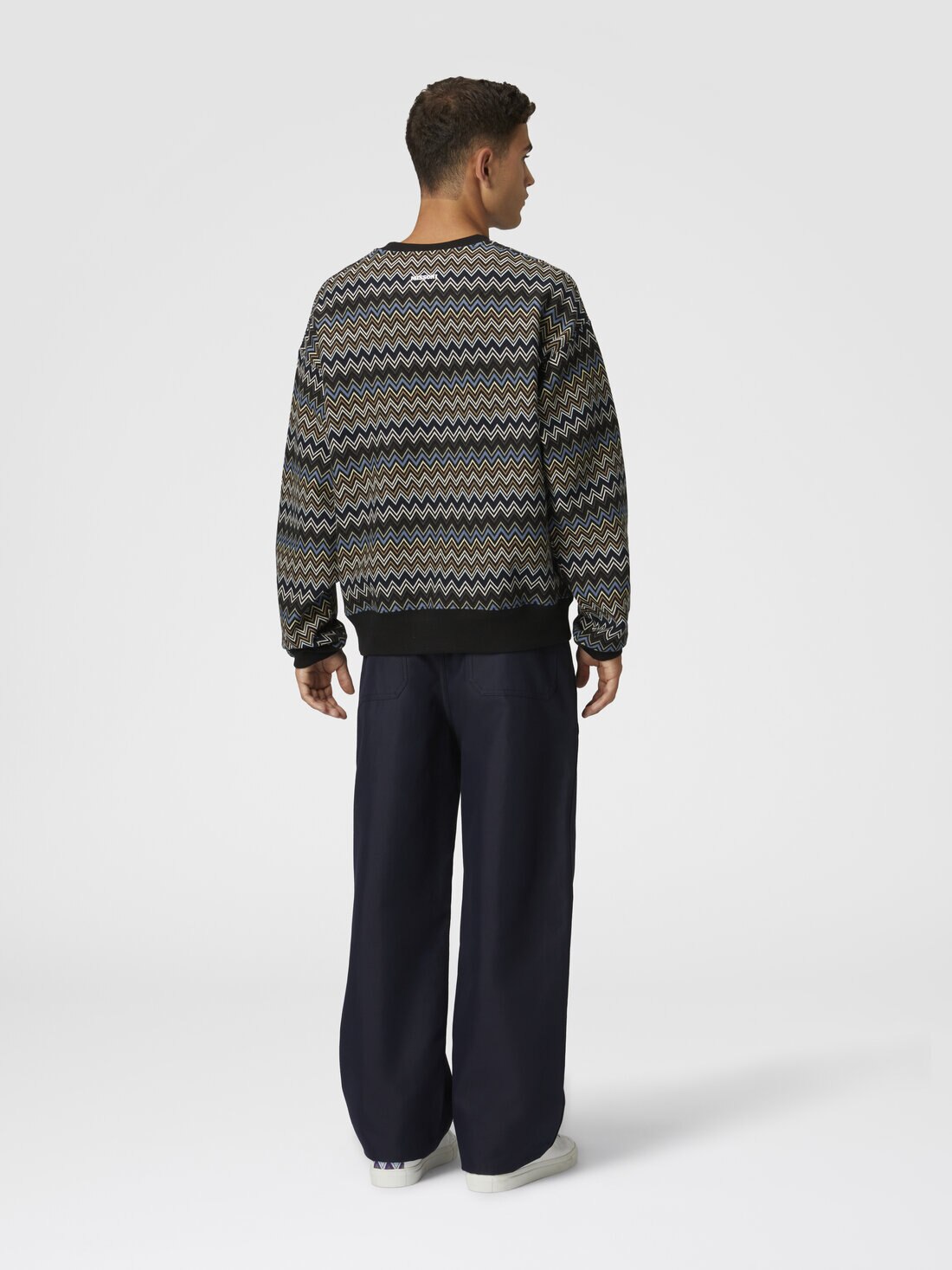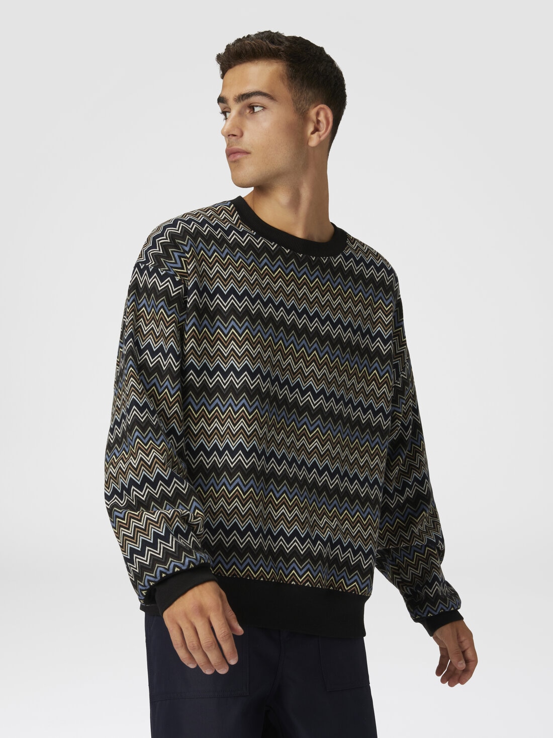 La sudadera de algodón con cuello redondo, piedra angular del look deportivo, sale renovada por el tratamiento Missoni, que la personaliza con el motivo en zigzag. Los embellecedores acanalados macizos completan el diseño.