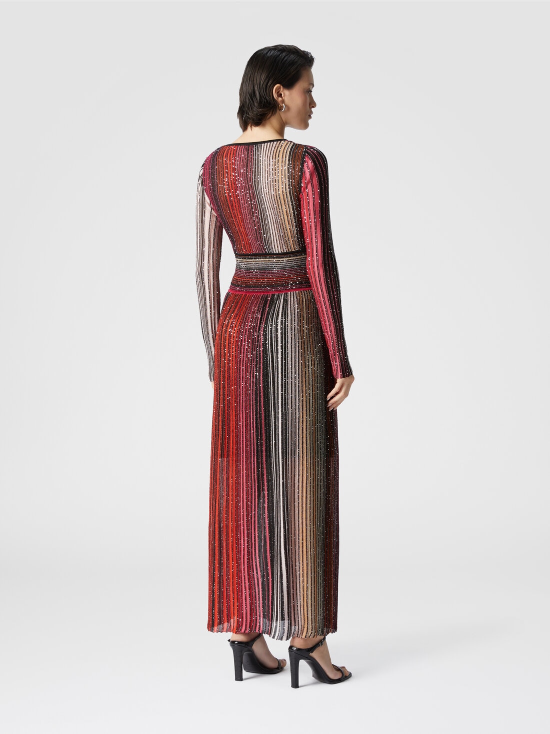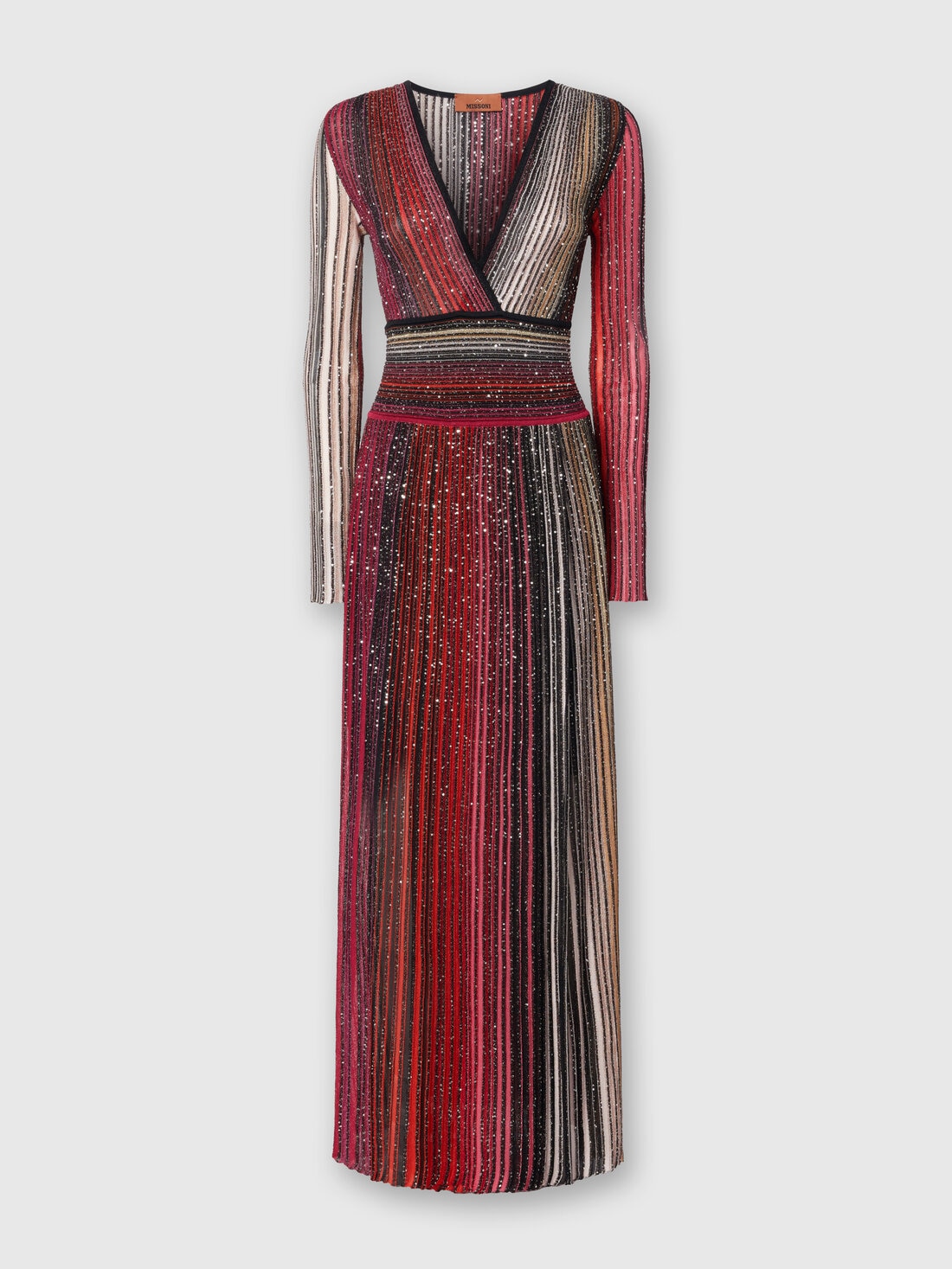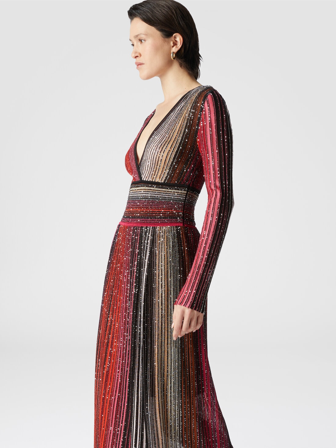 Elegante y sofisticado, este vestido largo con escote en V encarna el equilibrio perfecto entre la clase y la modernidad típica de Missoni. Hecho de una mezcla de viscosa, el tejido plisado se caracteriza por sus tonos vibrantes que se fusionan armoniosamente, mientras que los paillettes brillan delicadamente a la luz, aportando un toque de resplandor. La silueta fluida y ligera se desliza con gracia sobre el cuerpo, convirtiéndolo en una prenda ideal para ocasiones especiales que no pasa desapercibida.