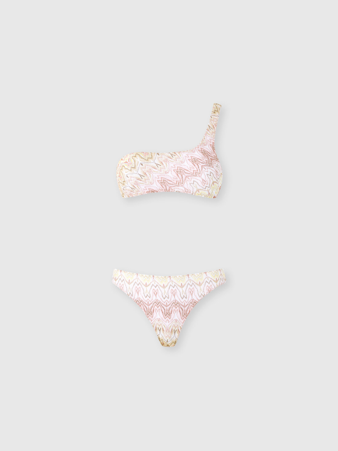 Un signo refinado y fluido caracteriza este bikini de mujer de un solo hombro, confeccionado en encaje de tejido raschel con motivo space-dye en mezcla de viscosa lamé. La construcción asimétrica realza la silueta, dando lugar a una prenda luminosa y equilibrada para el beachwear.