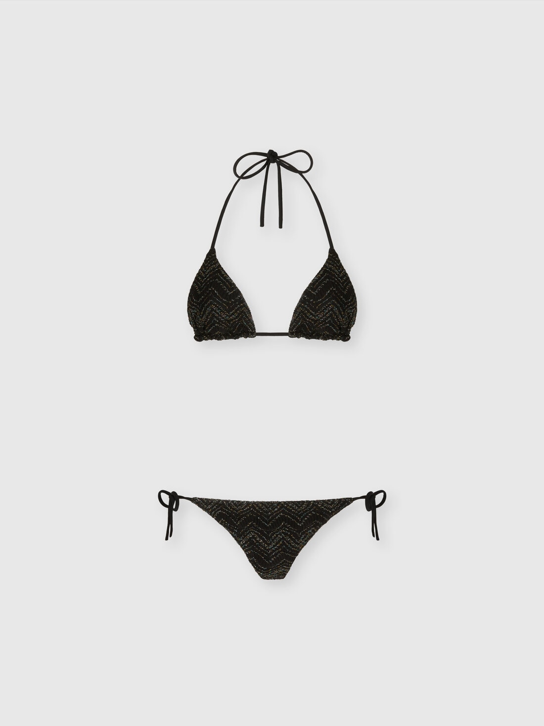 Directamente del archivo de la maison, el icónico motivo de chevron cobra nueva vida en el bikini de viscosa de Missoni. El sujetador triángulo y los calzoncillos con lazos laterales ofrecen un ajuste ajustable, realzando la silueta con una sensualidad refinada. La adición de hilo lamé le da un toque de luz y dinamismo, para un look brillante y sofisticado.