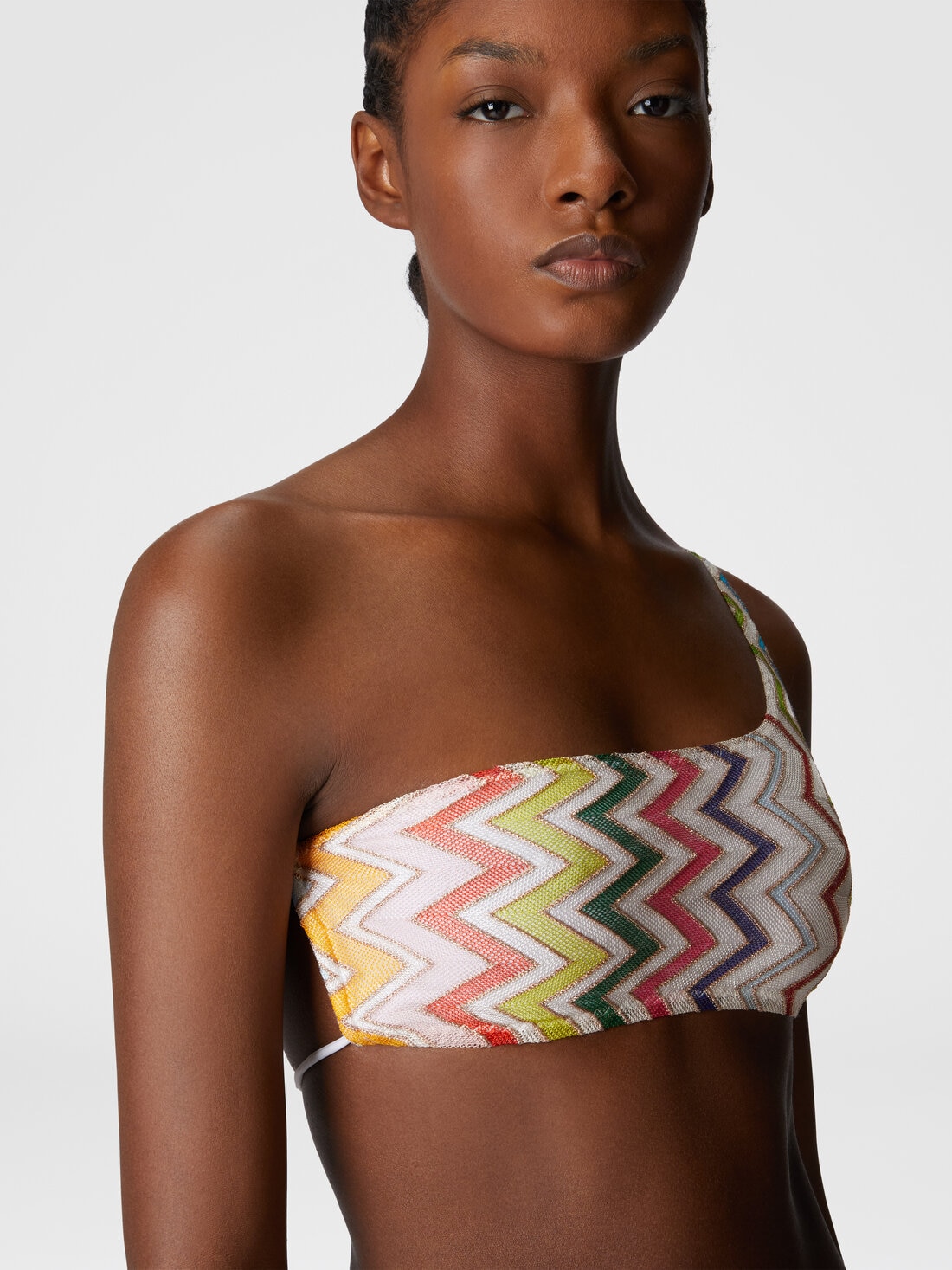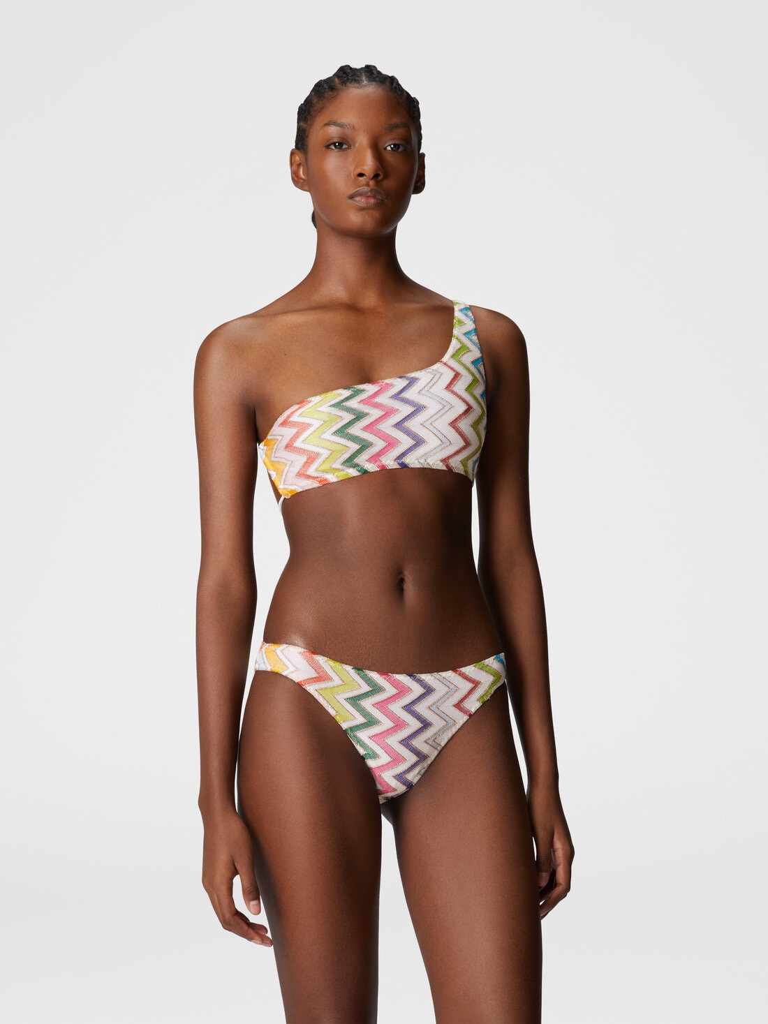Con su silueta de un solo hombro y los lazos cruzados en la espalda, el traje de baño en trabajo raschel y lamé resalta el icónico motivo zig zag de Missoni. Una prenda ideal para una elegancia refinada y dinámica.
