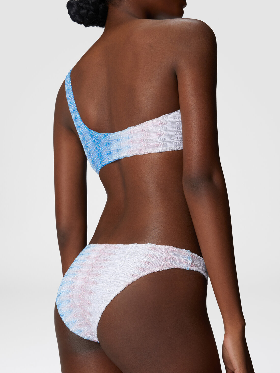 Estilo minimalista y chic para el bikini monospalla en encaje degradé. Realizado en viscosa y lamé, completado con un slip clásico, es una prenda esencial para un look refinado y luminoso.