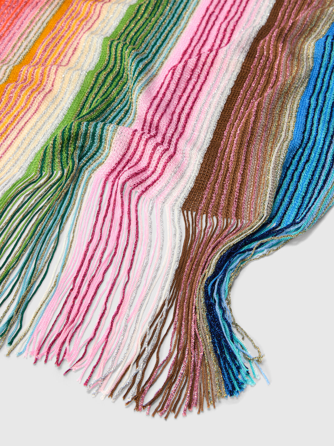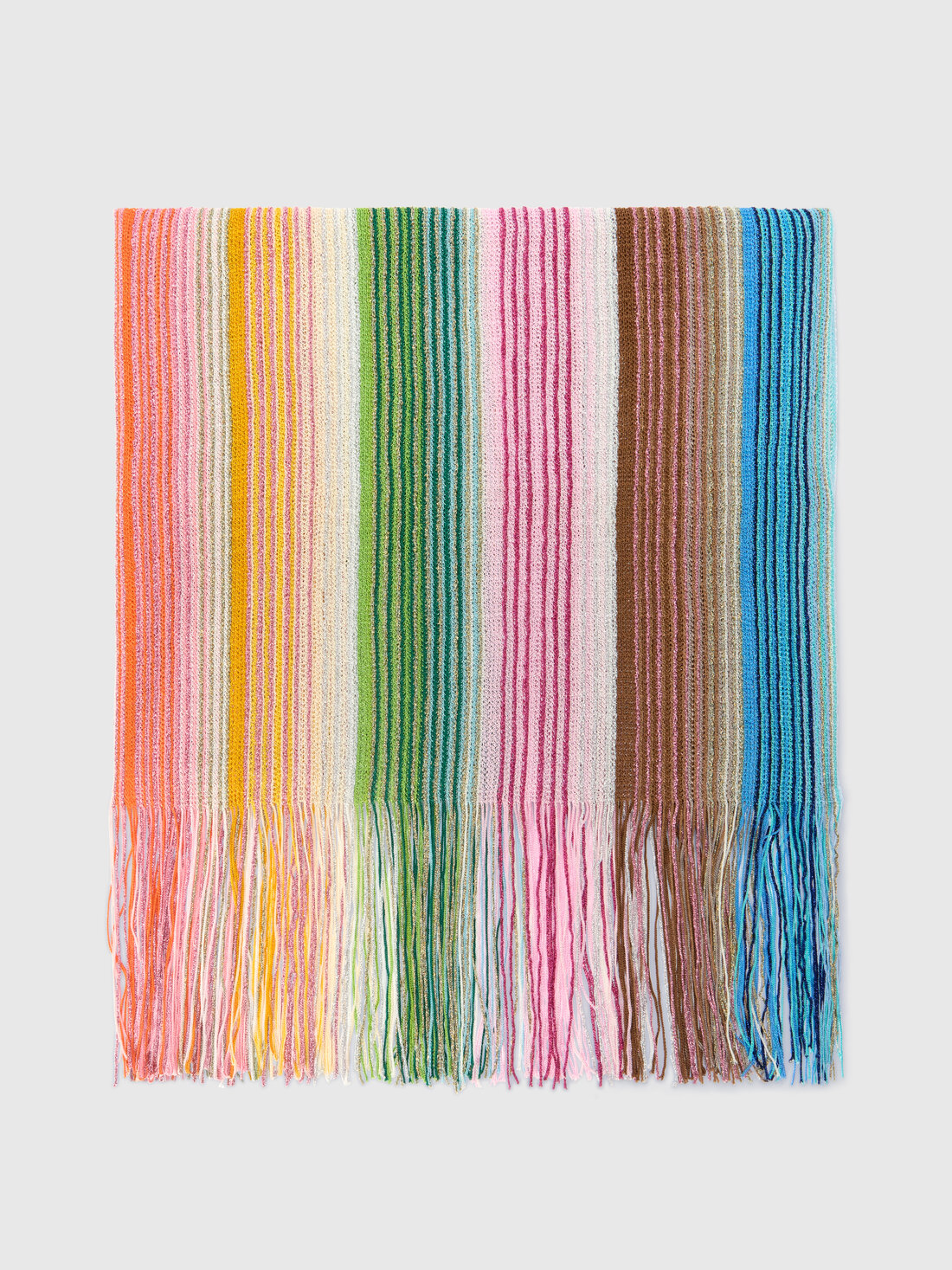 Pañuelo para mujer de mezcla de viscosa, caracterizado por un diseño a rayas que realza su textura. Los flecos en los bordes aportan movimiento y una elegancia natural, haciéndolo perfecto para completar tanto looks cotidianos como sofisticados.