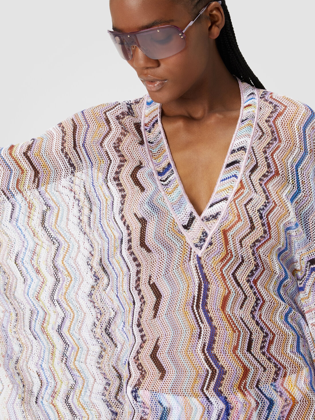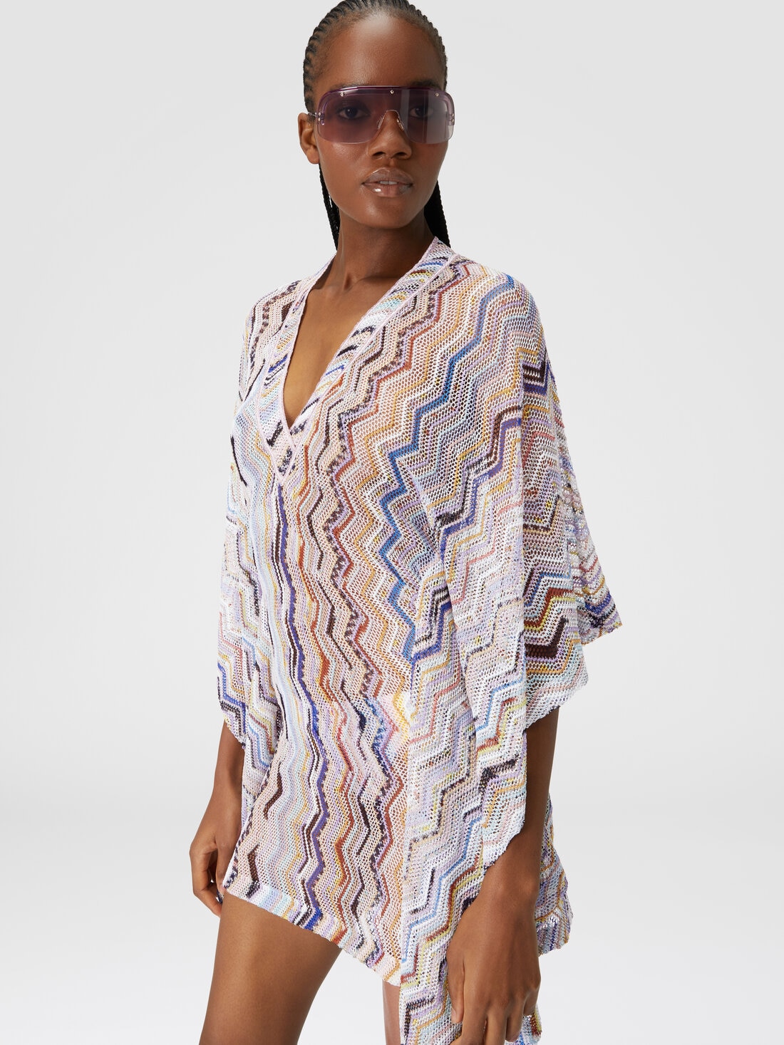 Un escote en V con costuras a la vista, amplias mangas de campana y una confección con efecto ganchillo con motivo zigzag vertical y lúrex: estas son las características del nuevo caftán cubrebikini para mujer de Missoni confeccionado en mezcla de viscosa.