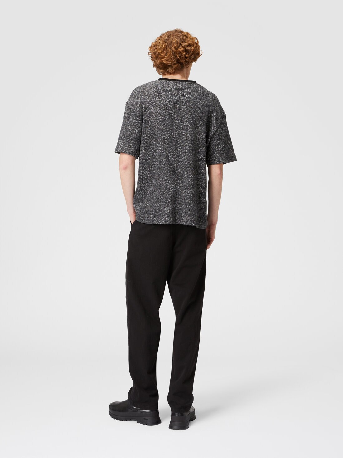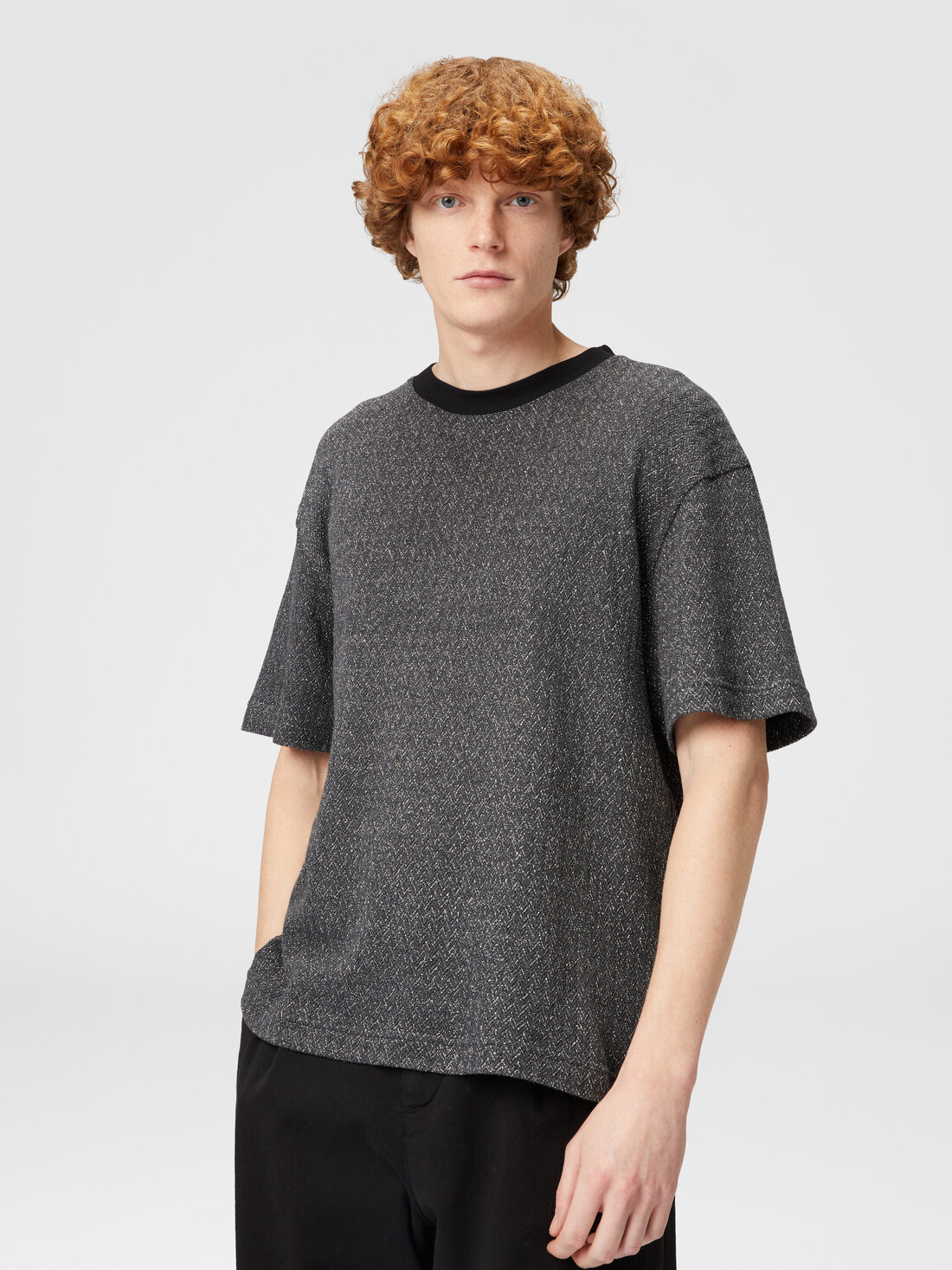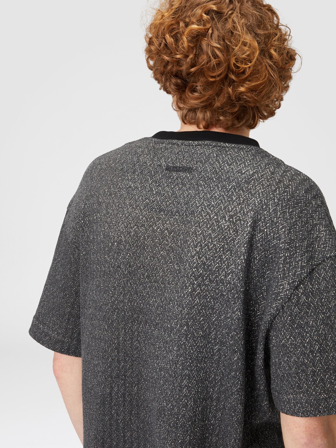 Iluminada por el hilo con procesamiento raschel y motivo lamé en zig zag, aquí está la nueva versión de la camiseta de cuello redondo: preciosa, en mezcla de algodón y viscosa, con un diseño simple y refinado.