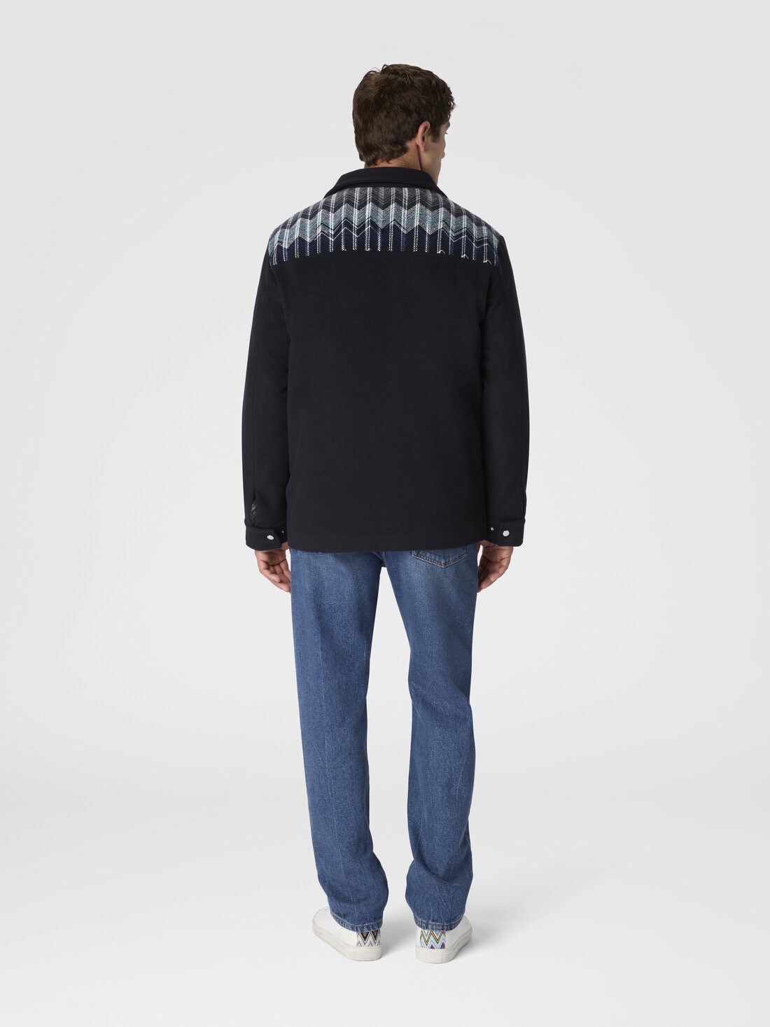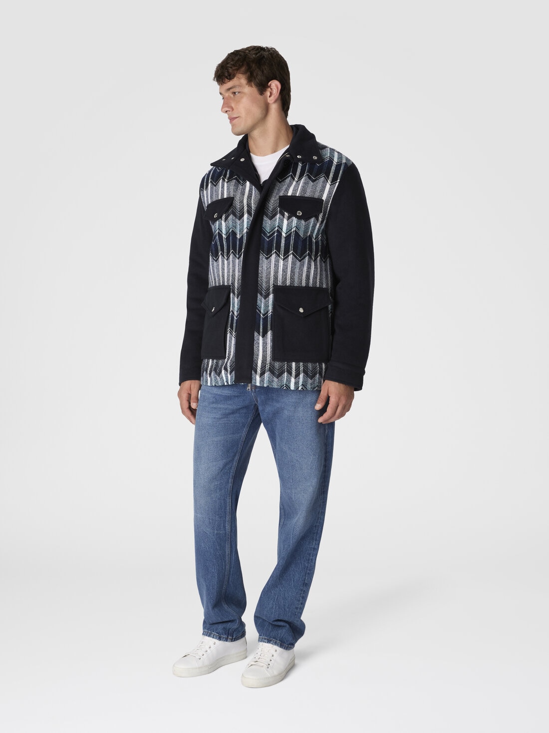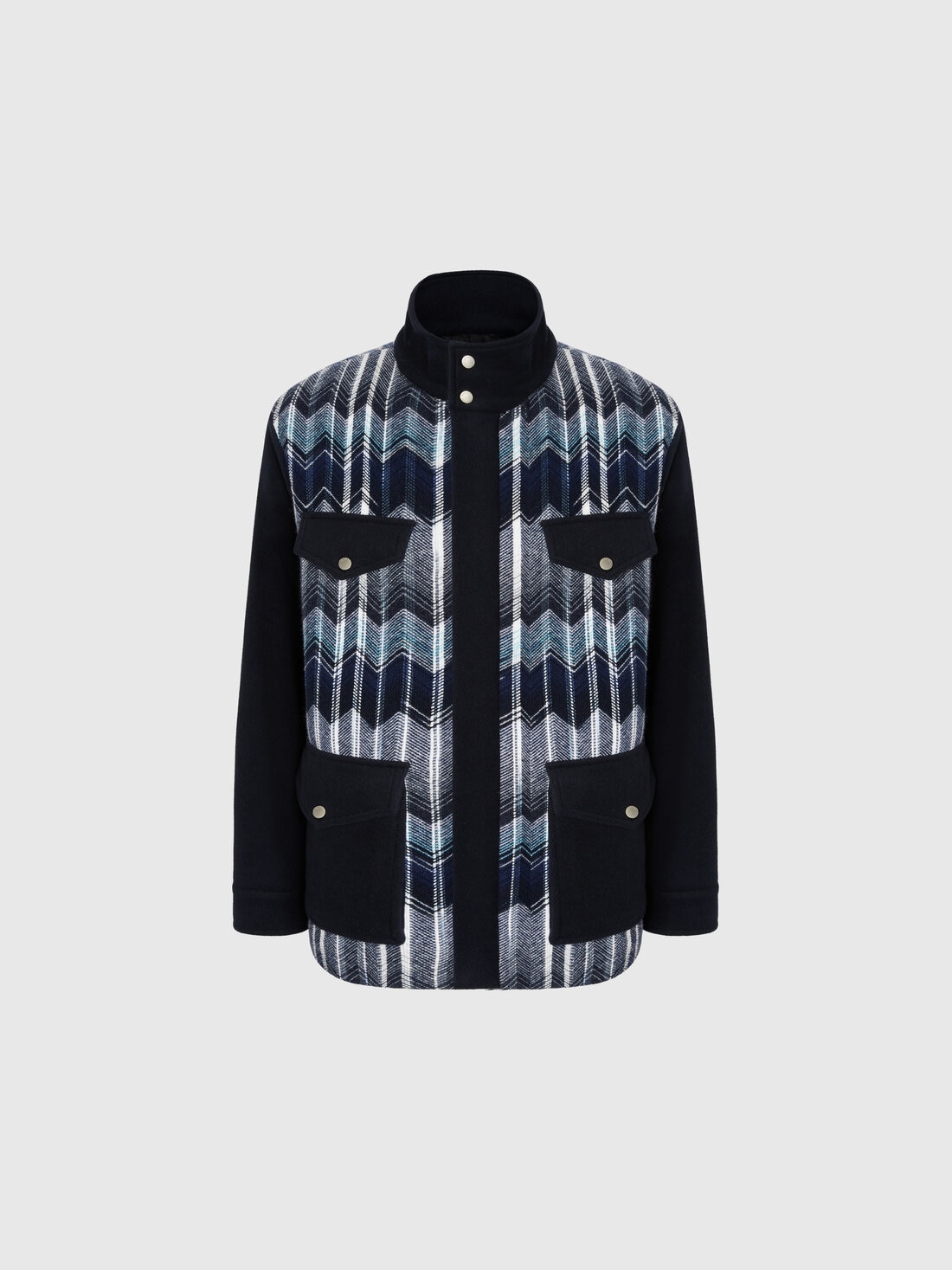Cazadora tipo field jacket para hombre en mezcla de lana y algodón, confeccionada en punto de telar con el icónico motivo zig zag. Los bolsillos grandes en la parte frontal acentúan su carácter funcional, mientras que la textura refinada refleja el estilo distintivo de Missoni en clave utility-chic.