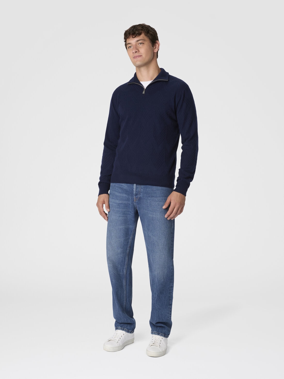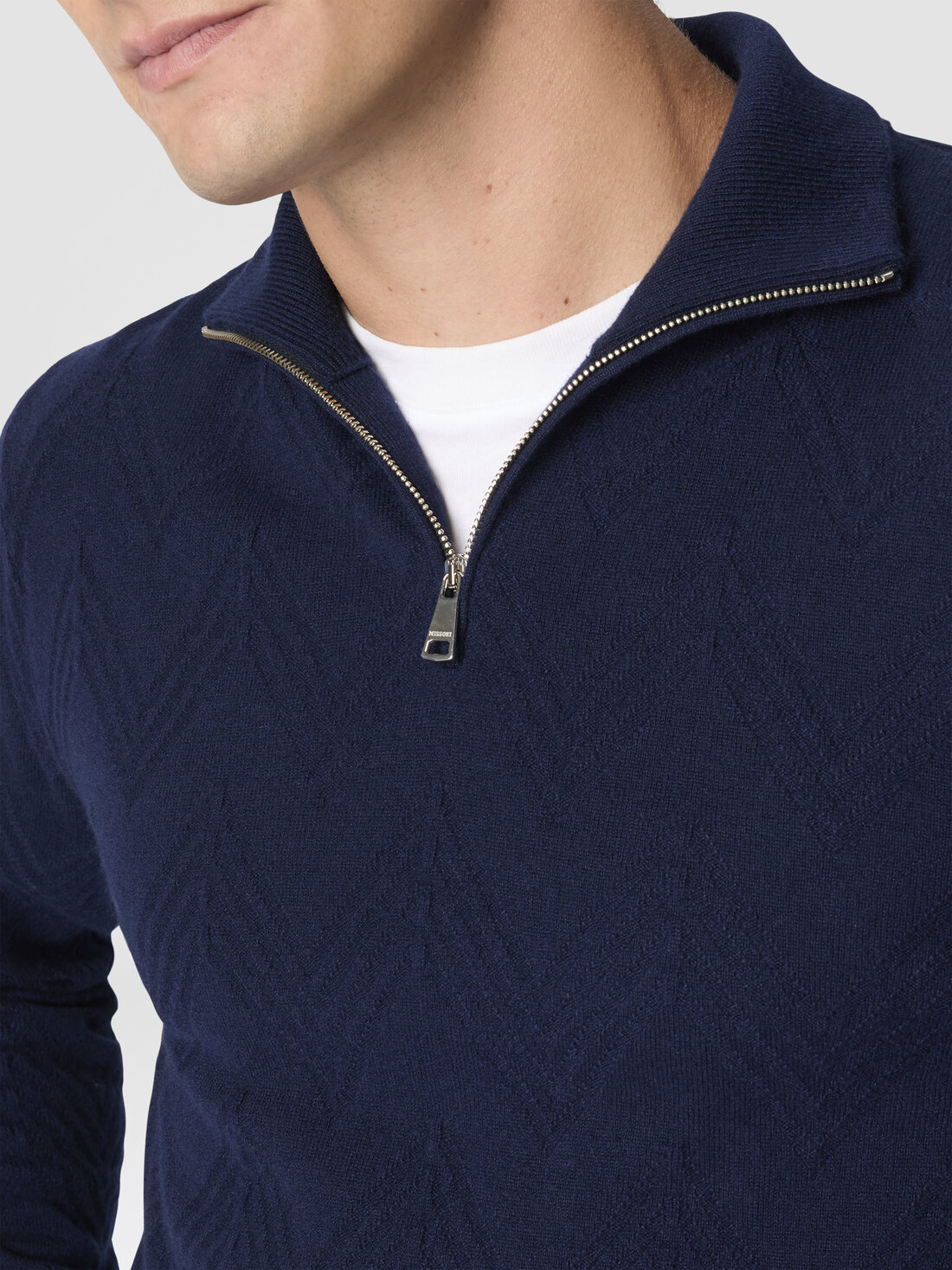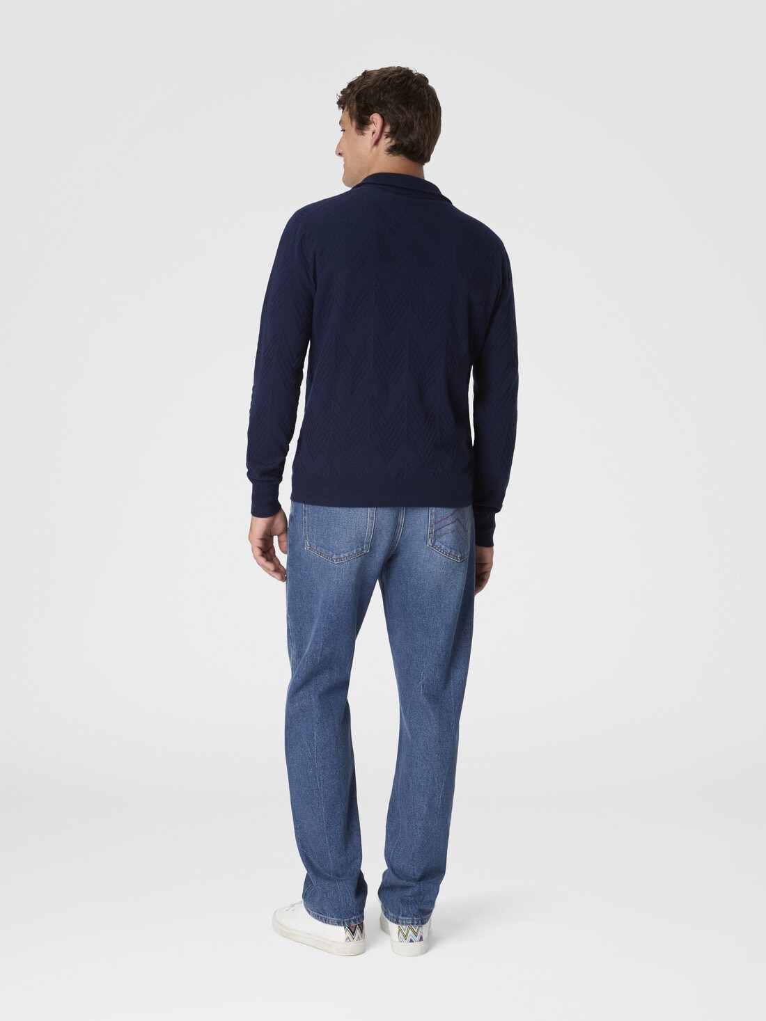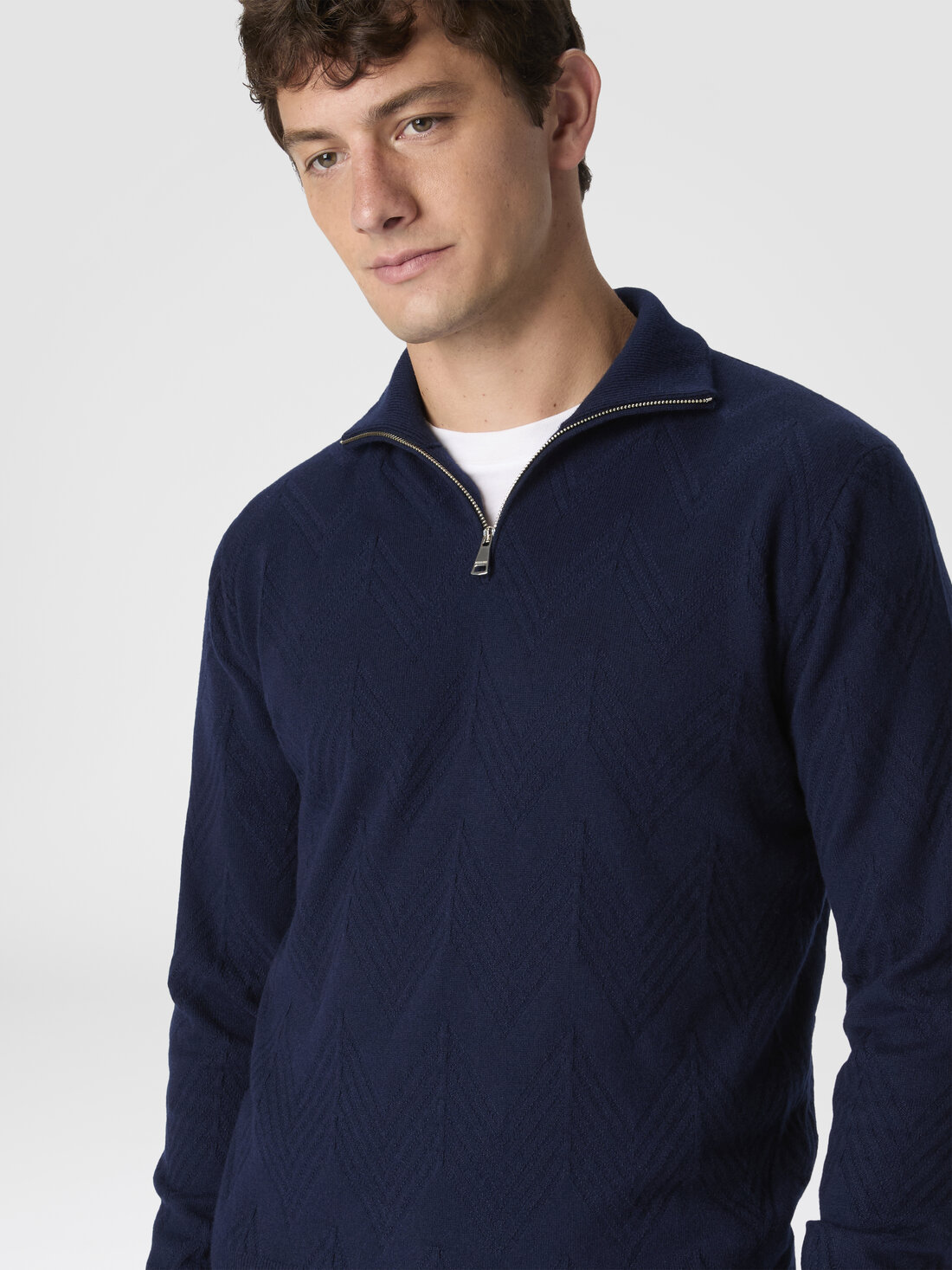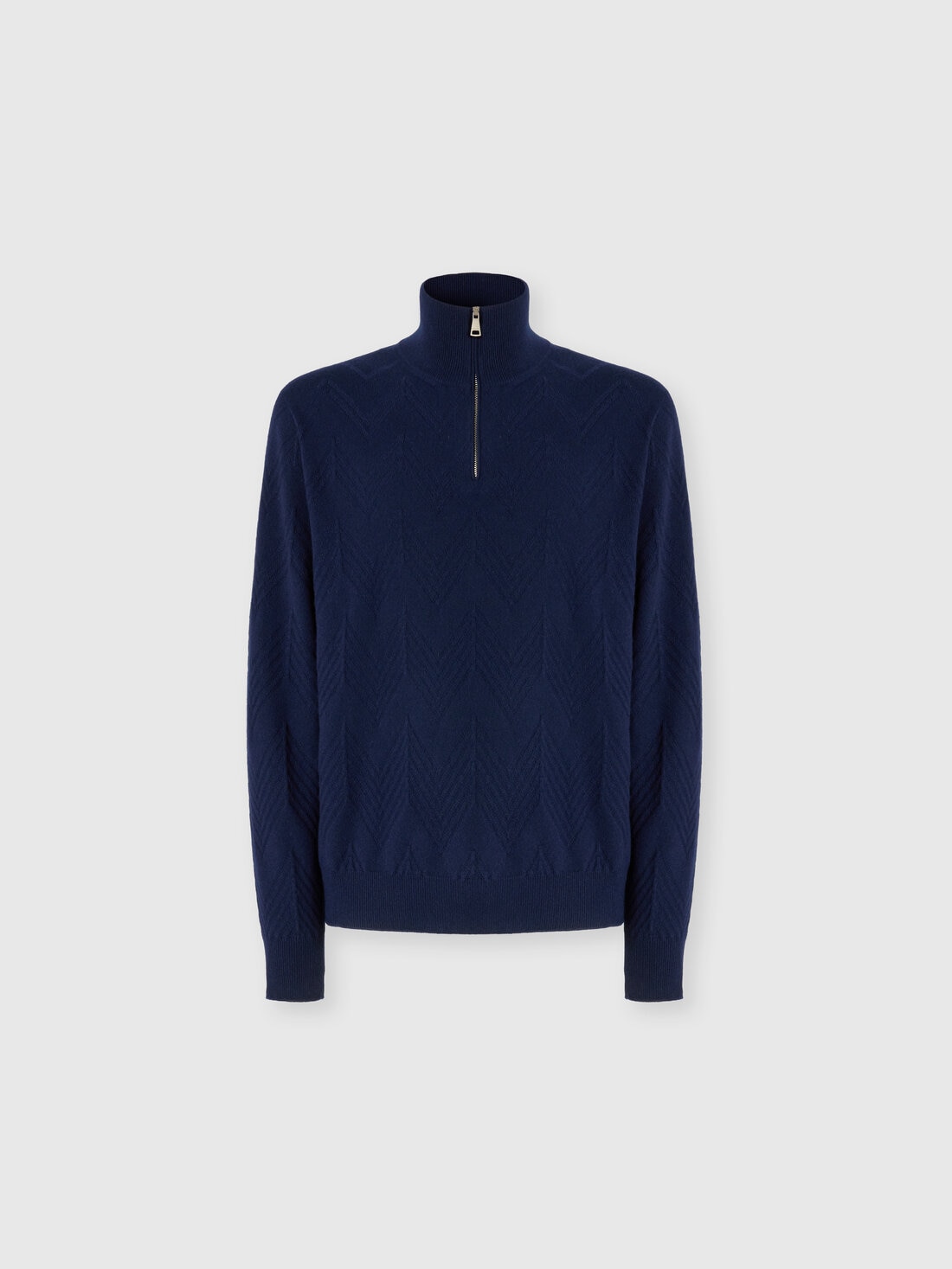 Elegante y suave, este jersey half-zip para hombre en cachemira 100% está enriquecido con un refinado motivo zig zag tono sobre tono, que aporta a la prenda un toque de textura y dinamismo.