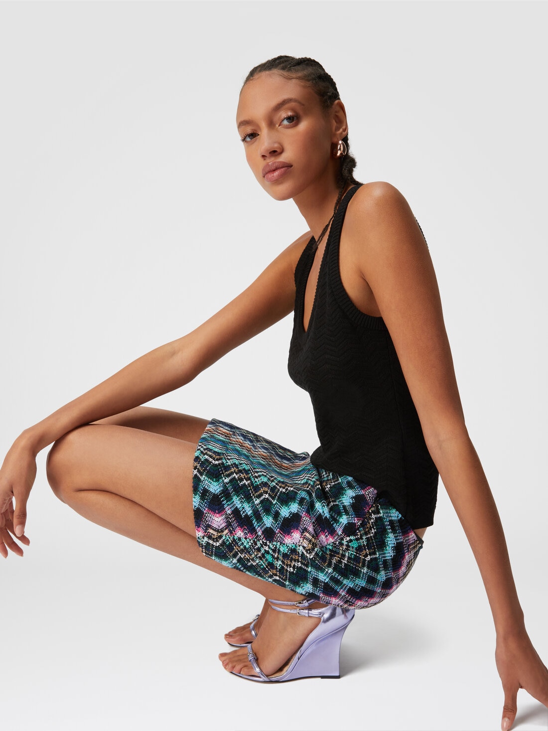El estampado en zigzag, realizado con la icónica montura de Caperdoni, caracteriza la minifalda. Discretamente cerrada por la cremallera lateral oculta, la prenda de lana y algodón ofrece una dosis de inconfundible "missonity".