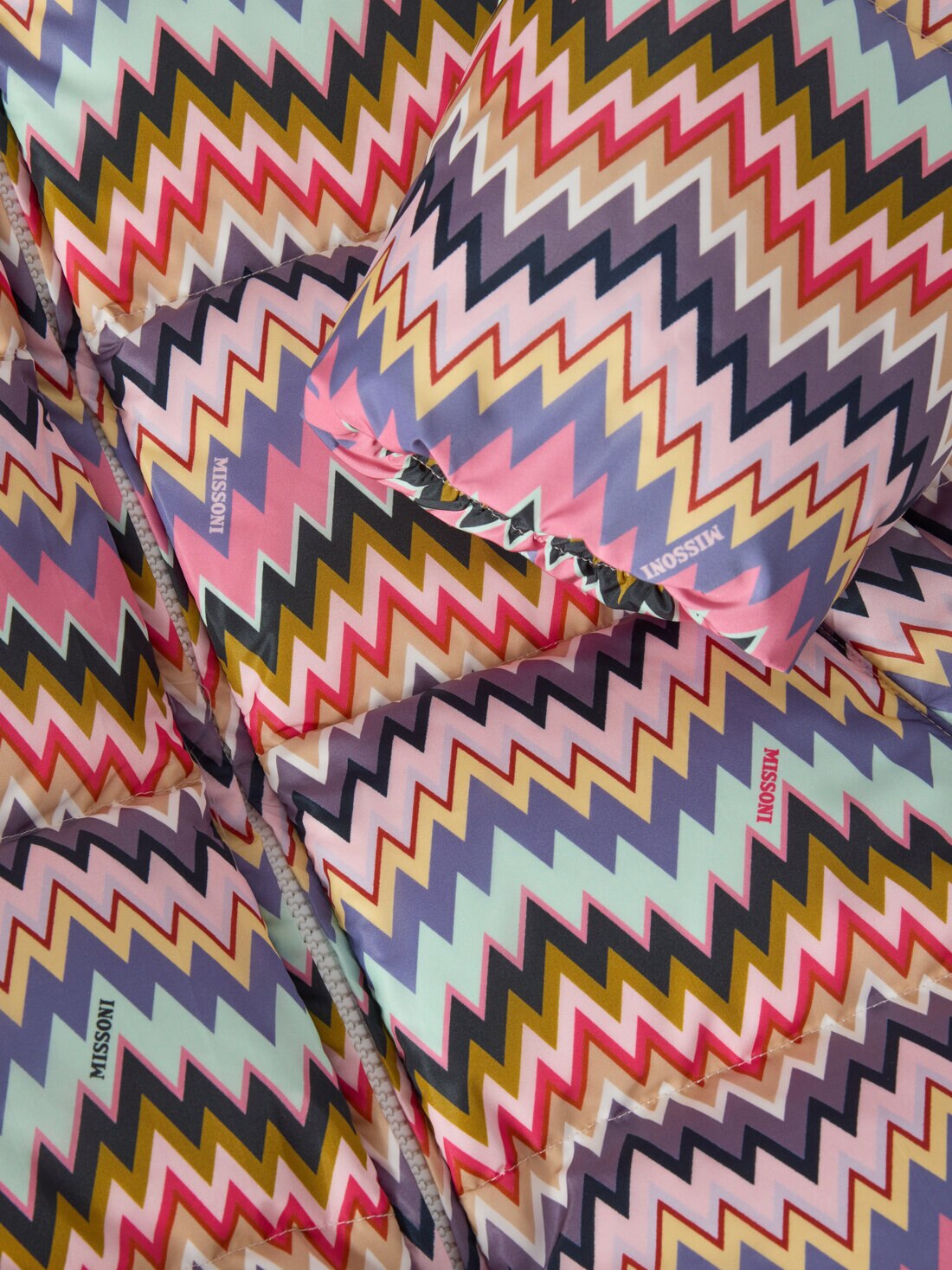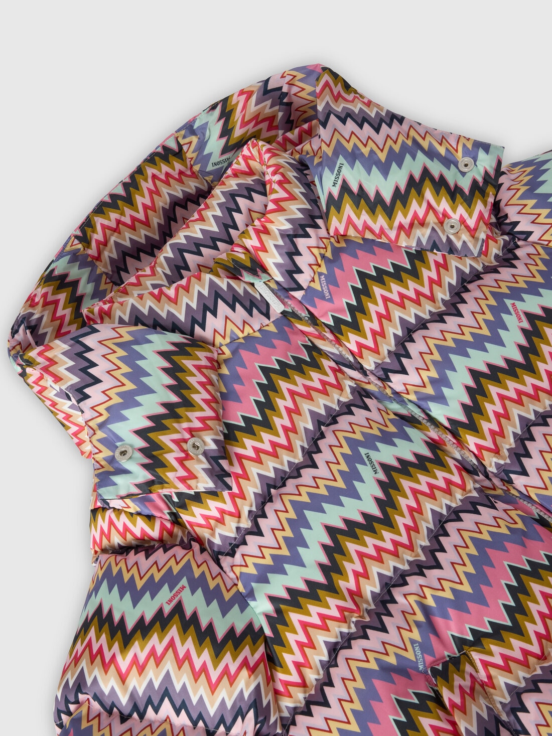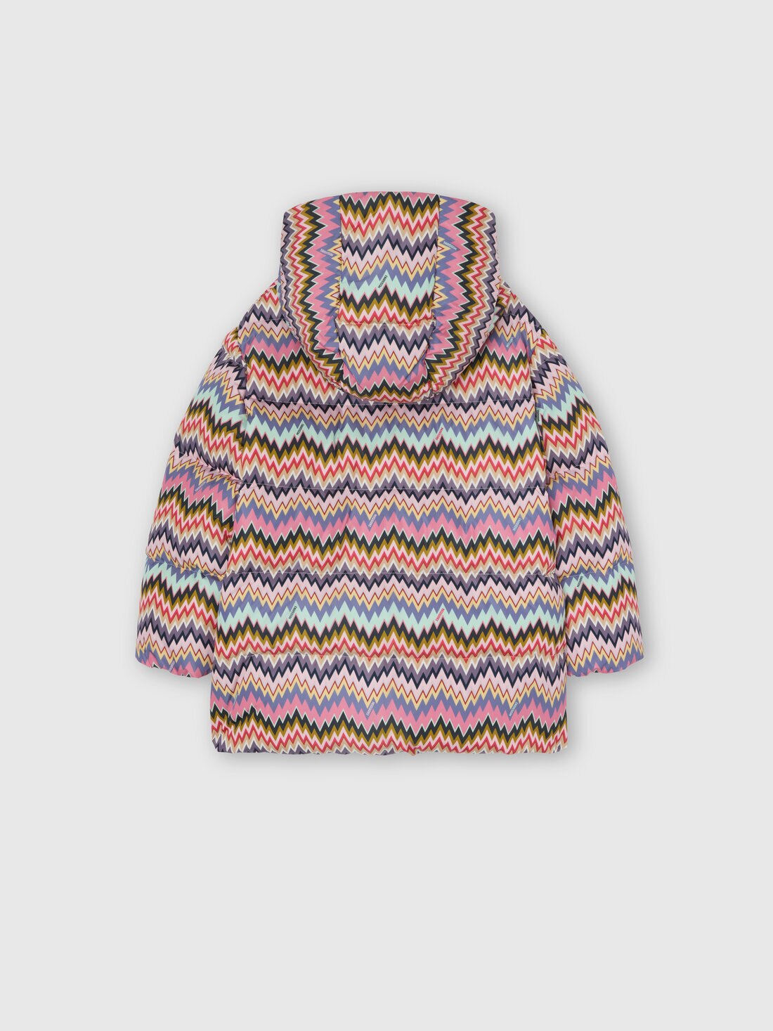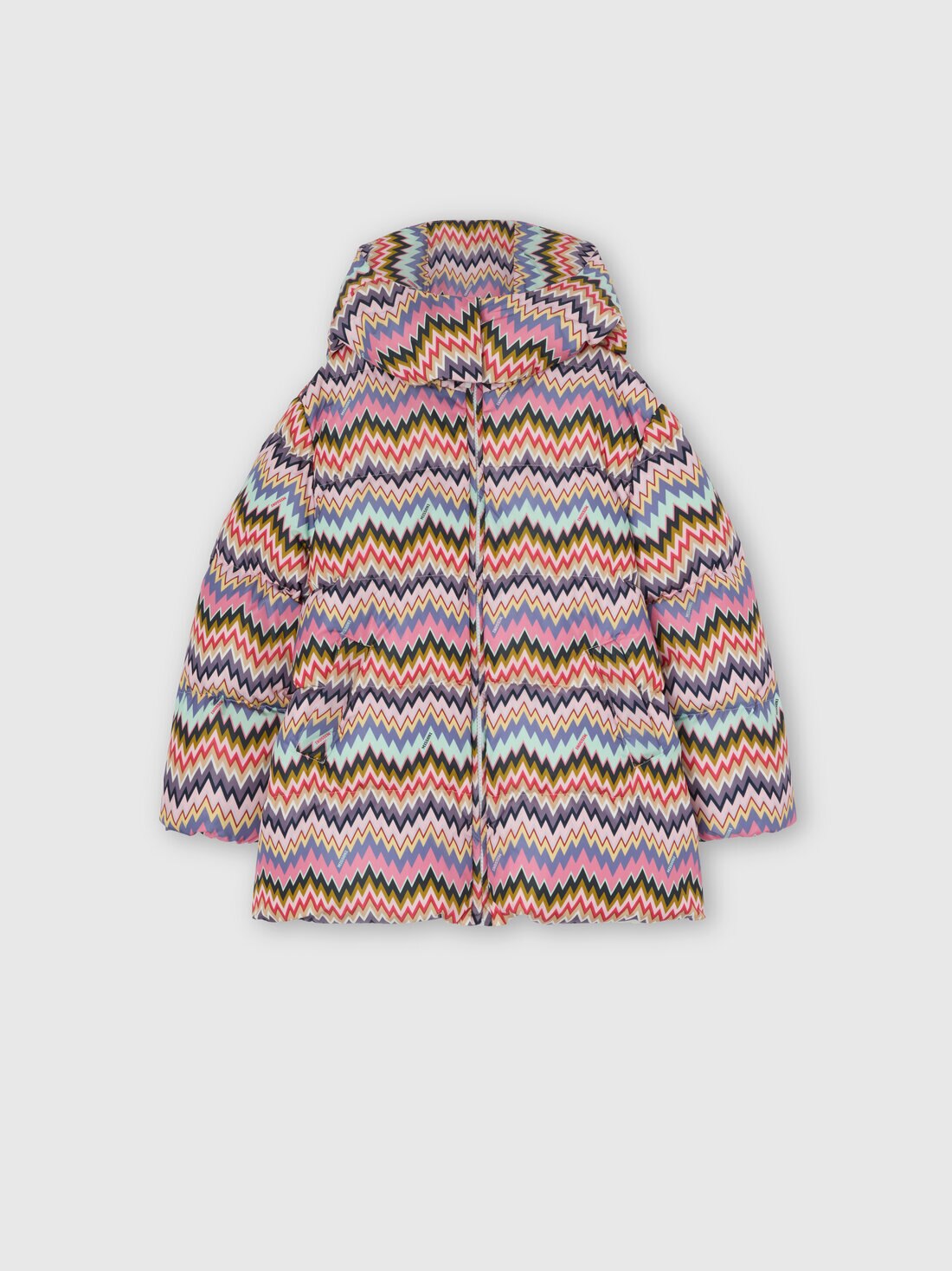 Plumífero con capucha para niña, hecho único por el característico motivo en zigzag de Missoni. Una prenda cálida y cómoda que combina practicidad y estilo, llevando el inconfundible toque de la maison también al armario de las más pequeñas.