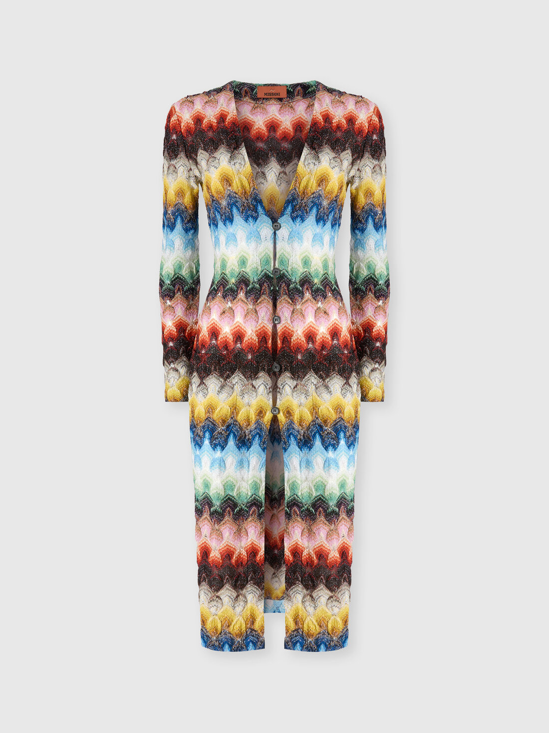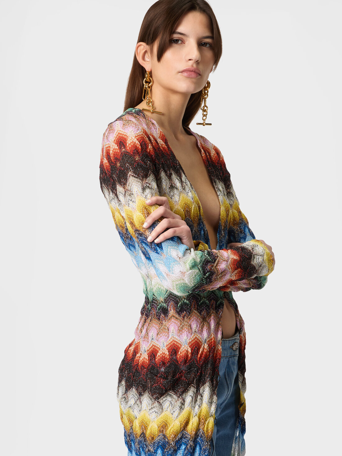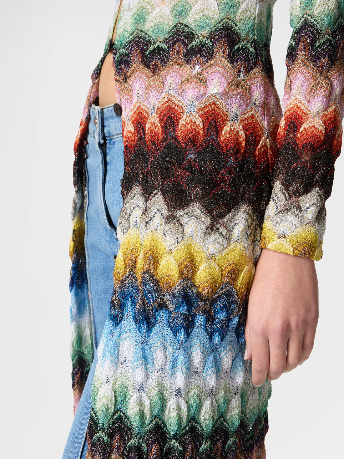 La maestría artesanal de la maison se expresa en este cardigan largo de mujer con botones, confeccionado en tejido raschel de encaje en mezcla de viscosa lamé. Una prenda refinada que combina ligereza y luminosidad, realzando la silueta con elegancia.