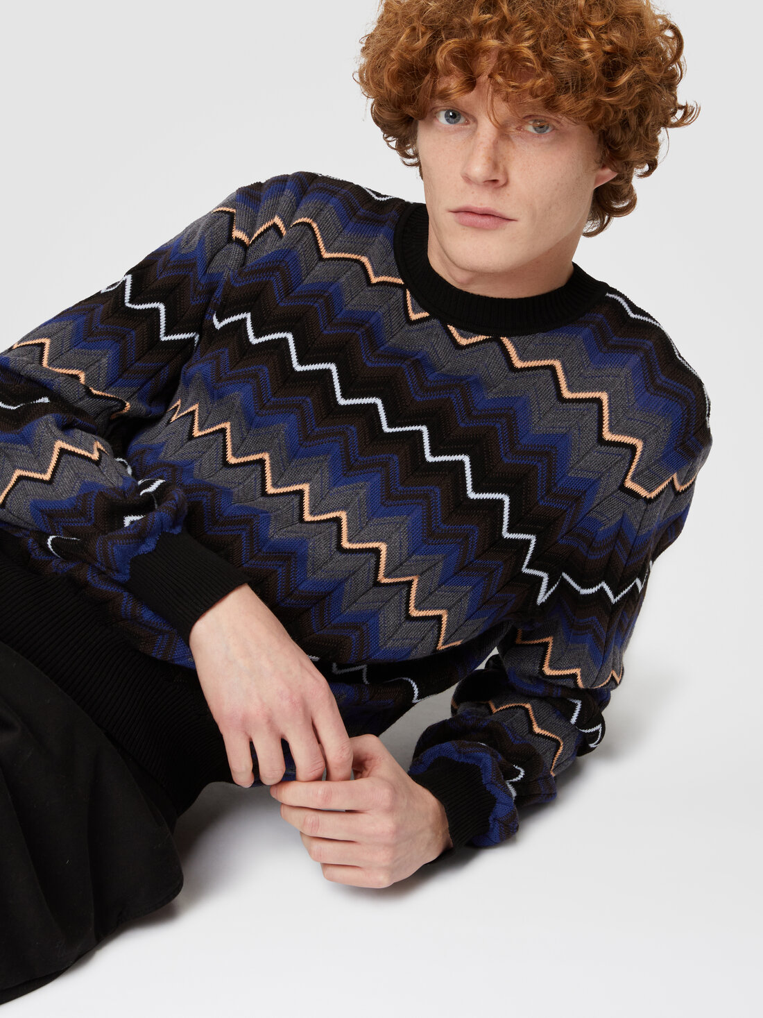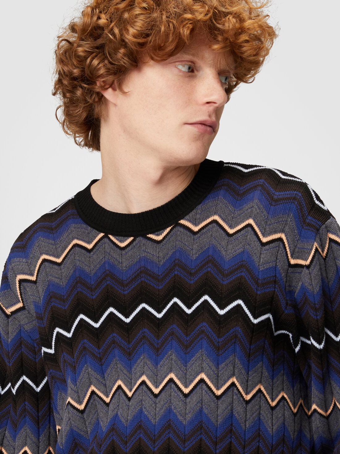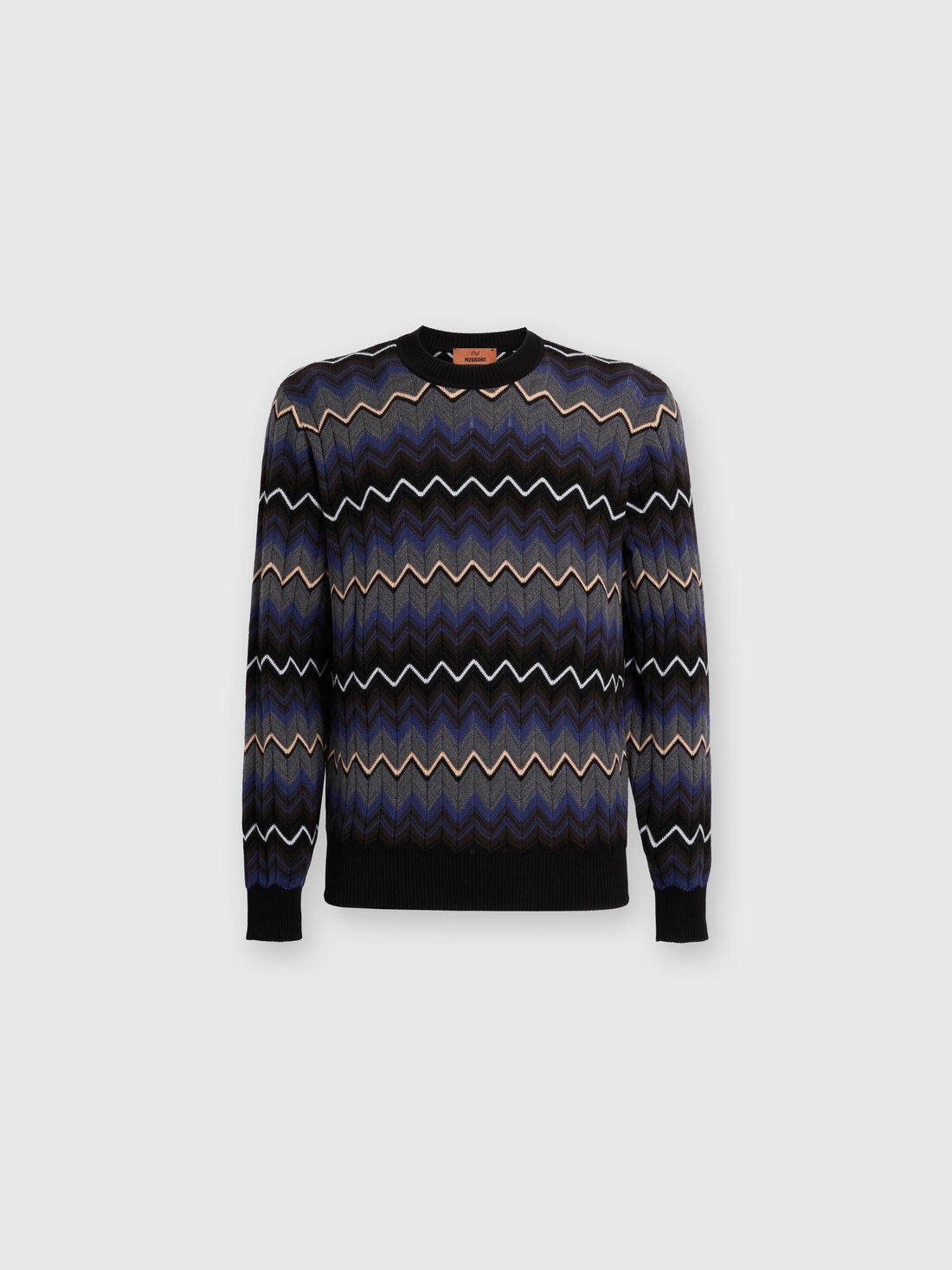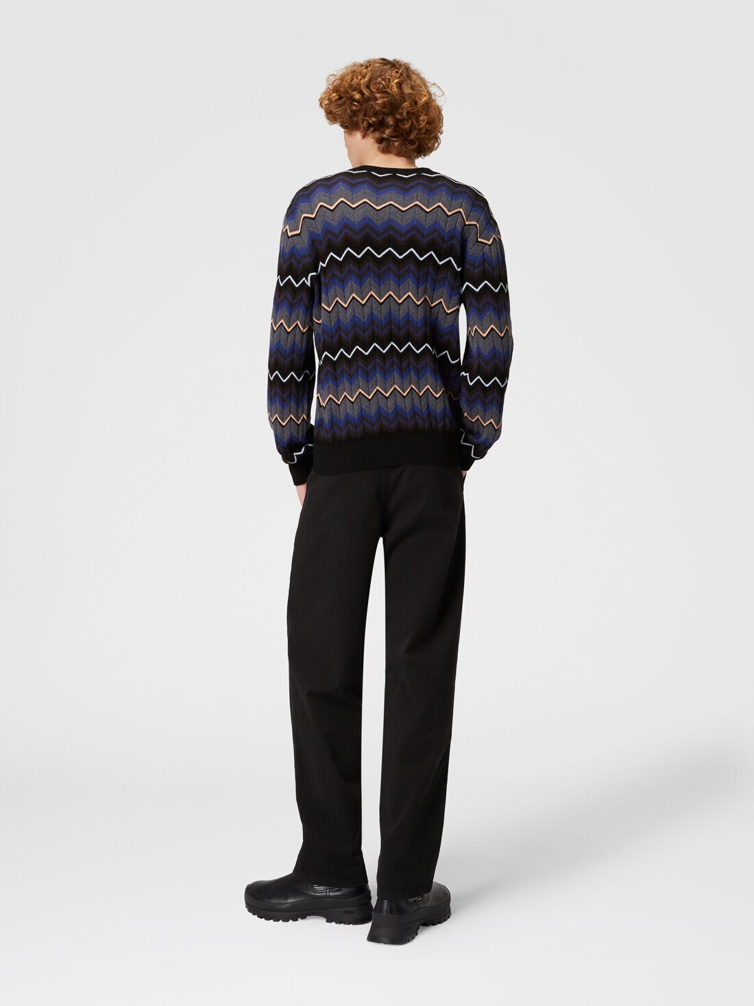 Concéntrese en los ribetes contrastantes para el jersey de cuello redondo. Confeccionado en punto de lana y algodón, está enriquecido con el patrón en zigzag degradado.