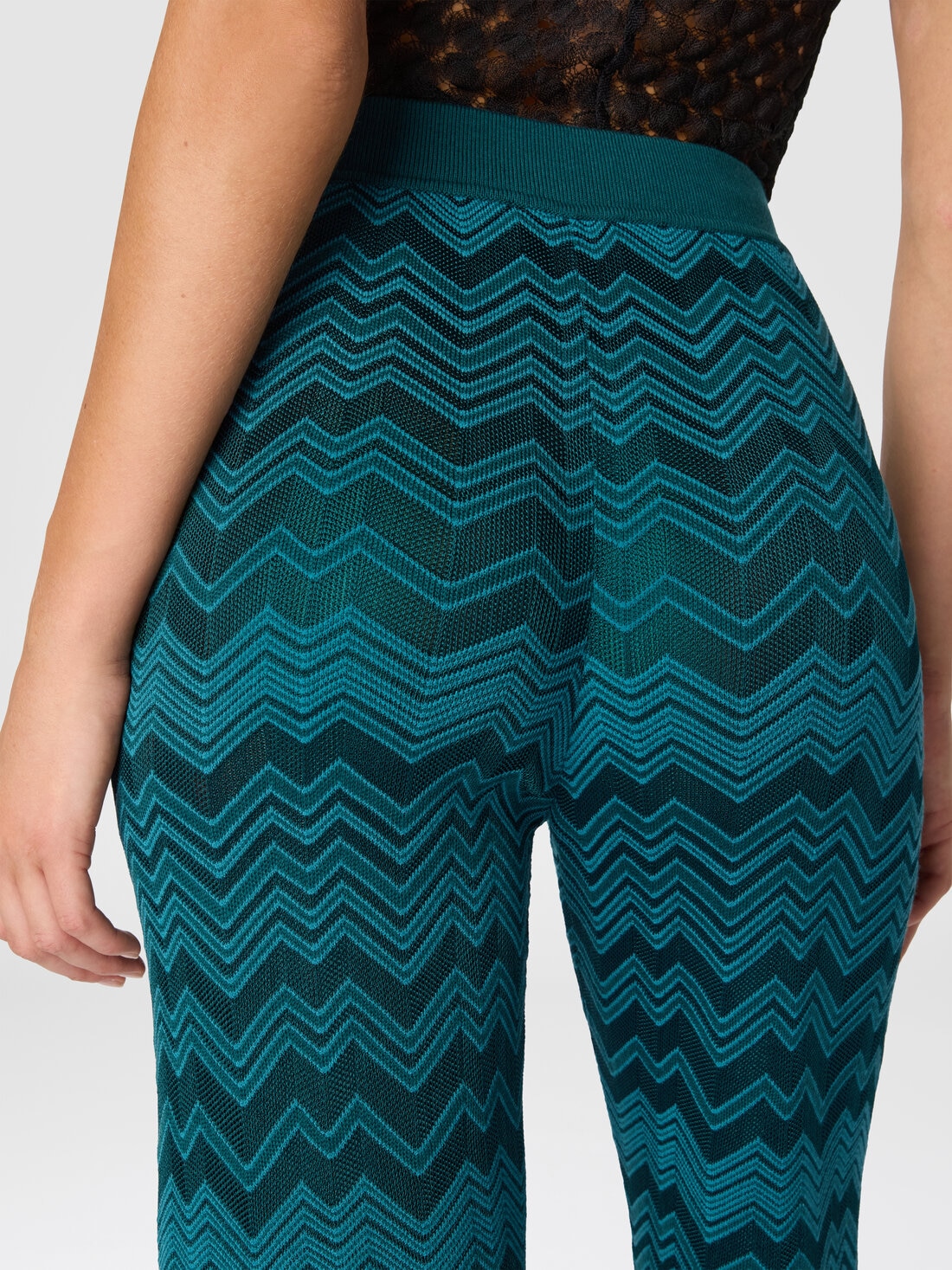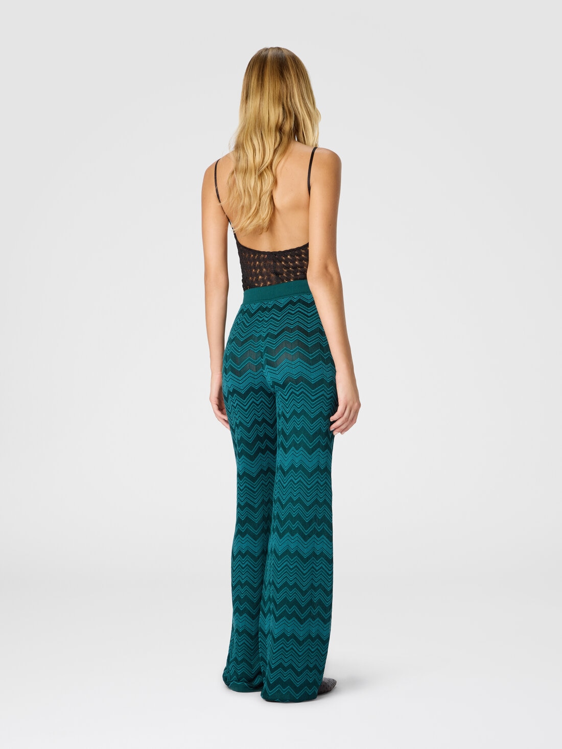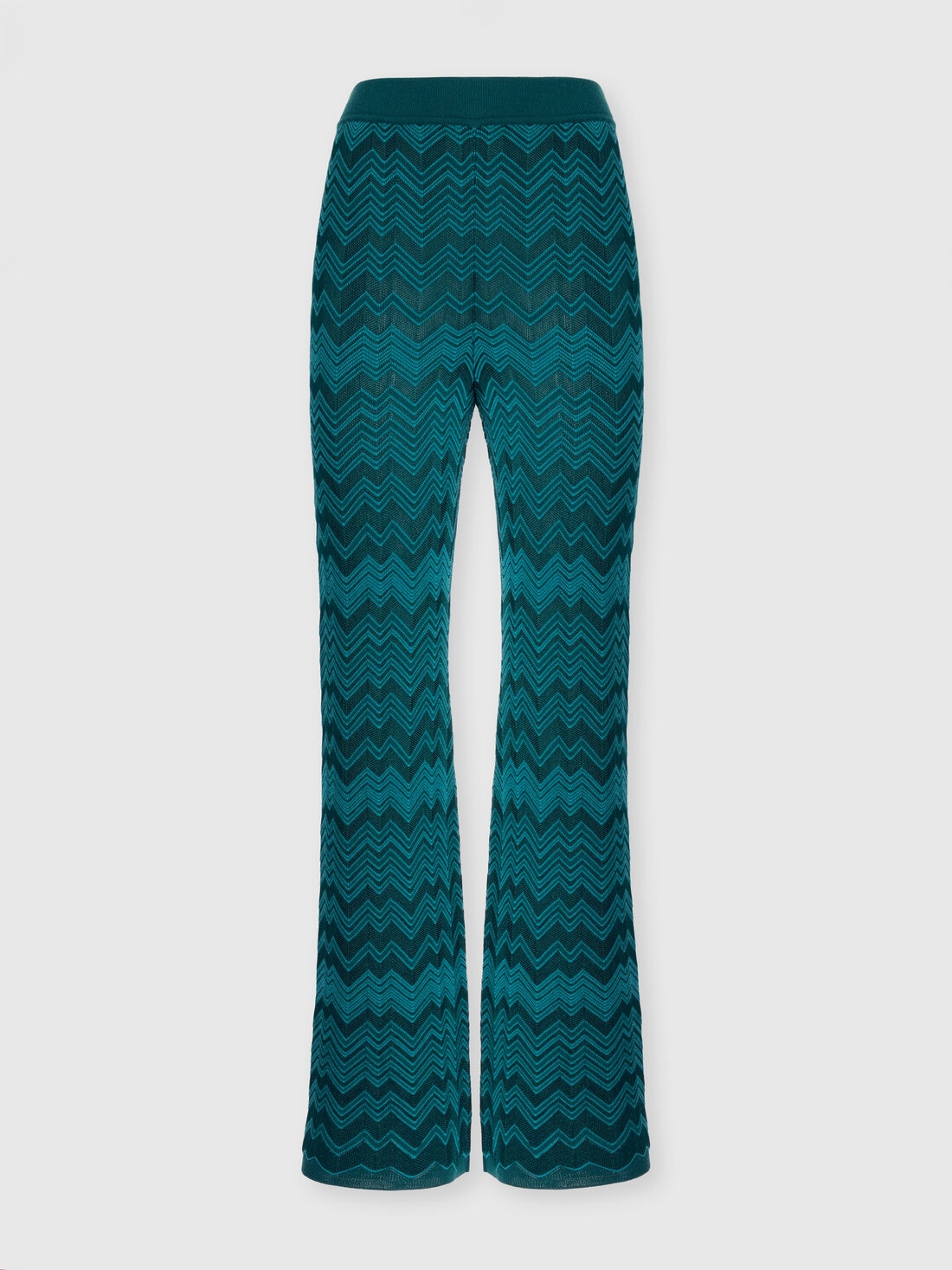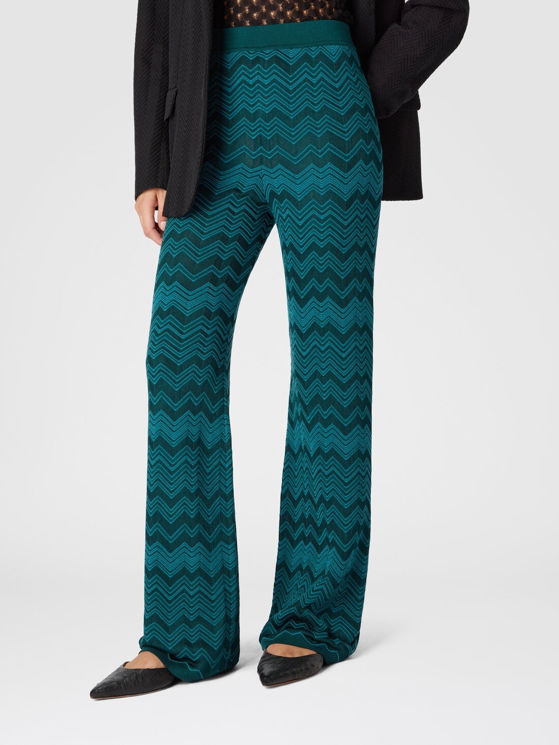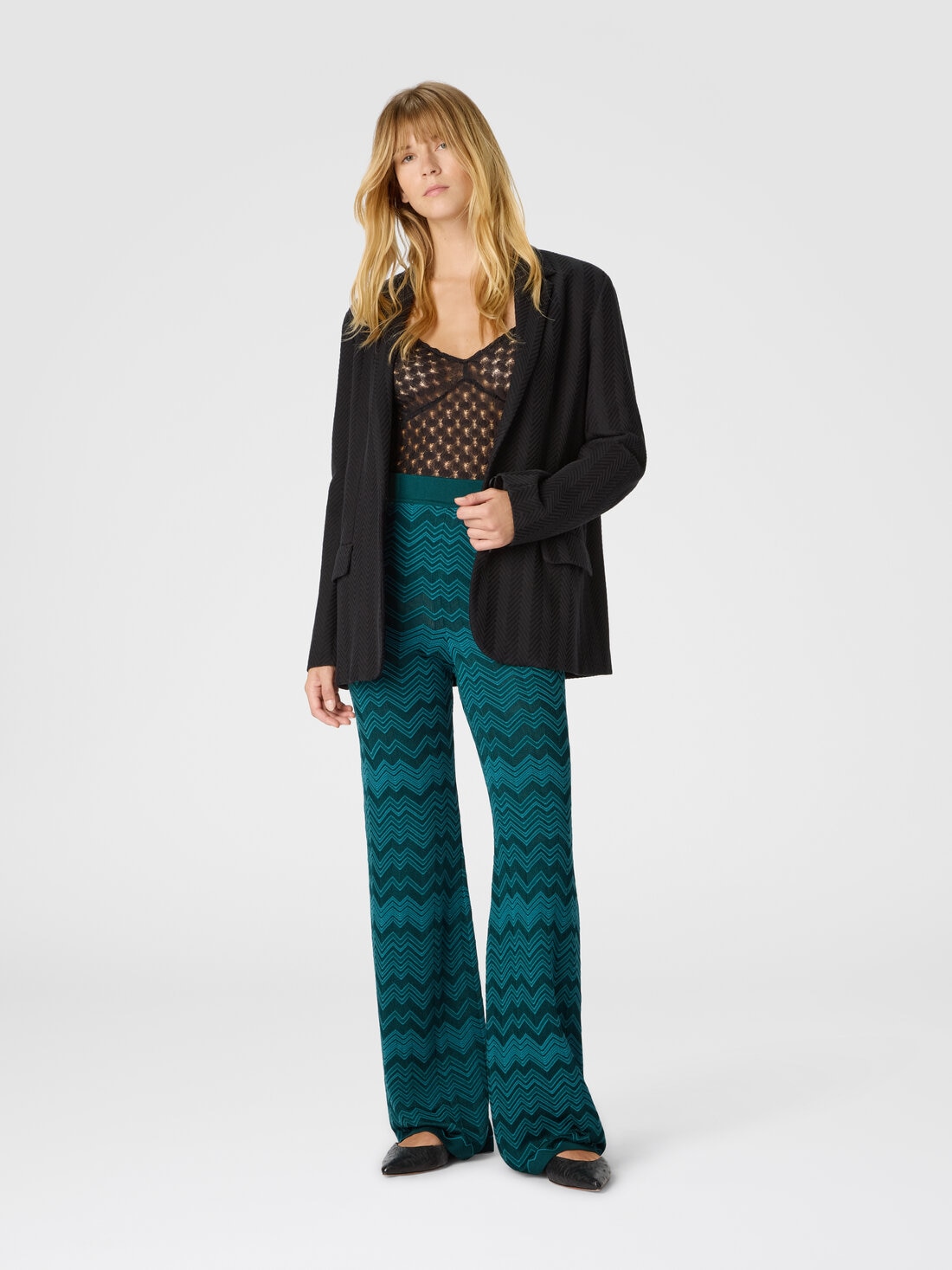 El célebre zig zag Missoni se reinterpreta en clave esencial en este pantalón largo de mujer de línea recta, realizado en color liso con motivo chevron tono sobre tono. La mezcla de lana y viscosa aporta estructura y suavidad a una prenda icónica de estilo sobrio y contemporáneo.