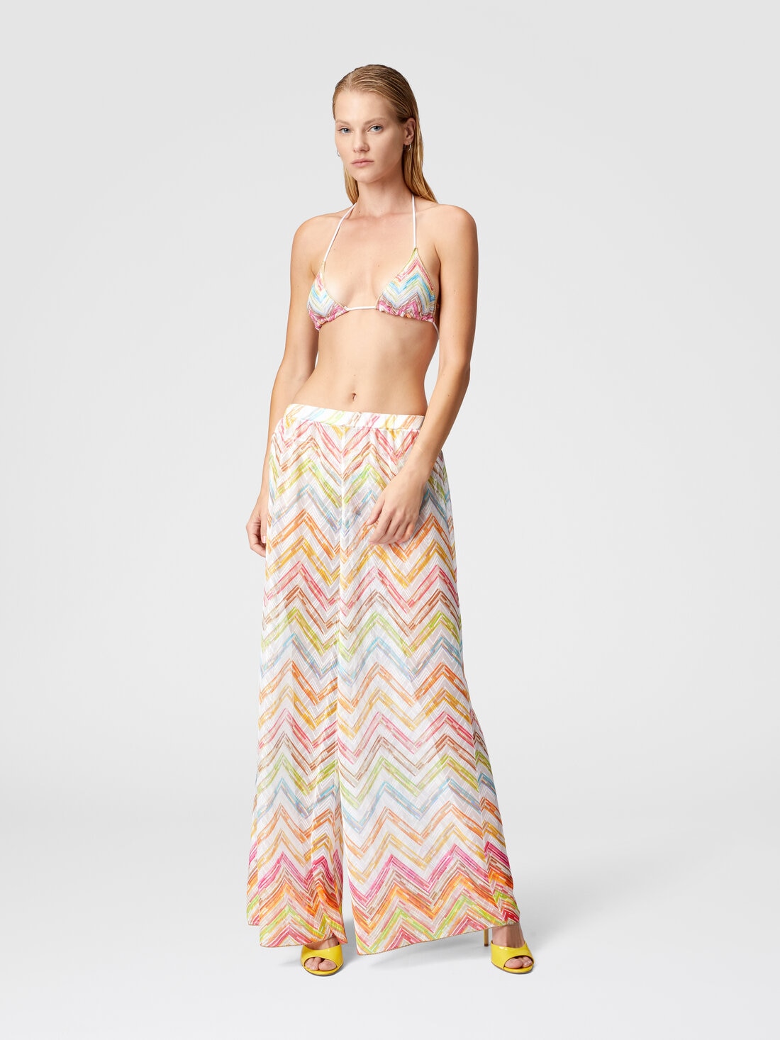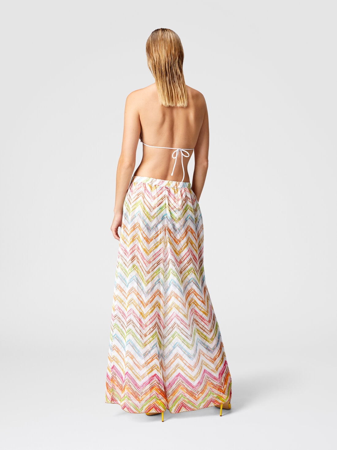 Estos abrigos antideslizantes de tul estampado con factura raschel, interpretan el lujo en clave Missoni. La silueta holgada y fluida con efecto transparente confiere una elegancia suntuosa, mientras que el estampado ilumina la prenda con dinamismo. Imprescindible para aquellos que quieren un look sofisticado y versátil incluso fuera de la playa.