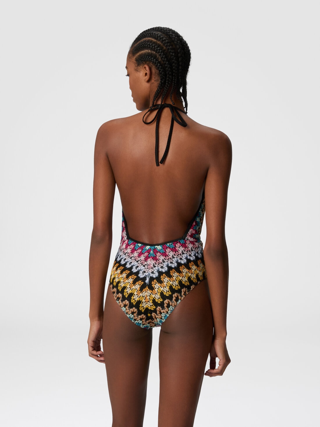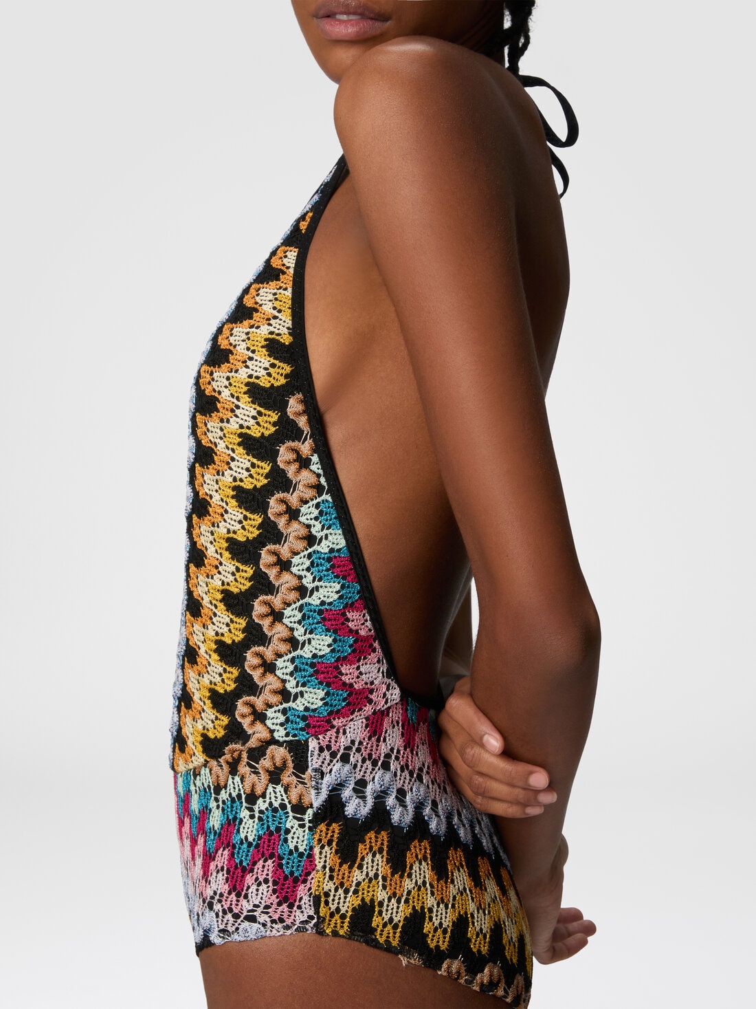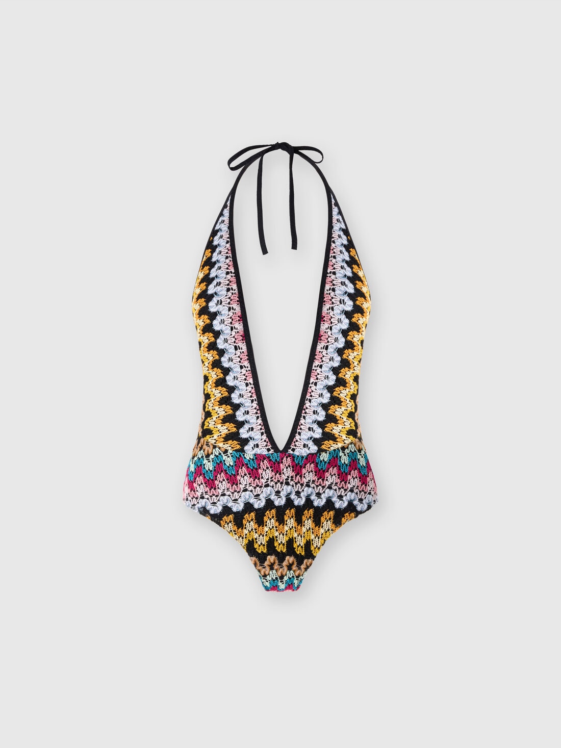 Con su escote pronunciado y encaje de viscosa lamé, este traje de baño de una pieza evoca una elegancia refinada y atemporal. El patrón en zigzag, realzado por reflejos luminosos, da un toque de vivacidad, mientras que la silueta sensual acaricia la figura con sofisticada naturalidad. Una prenda que captura el espíritu de un encanto atemporal.
