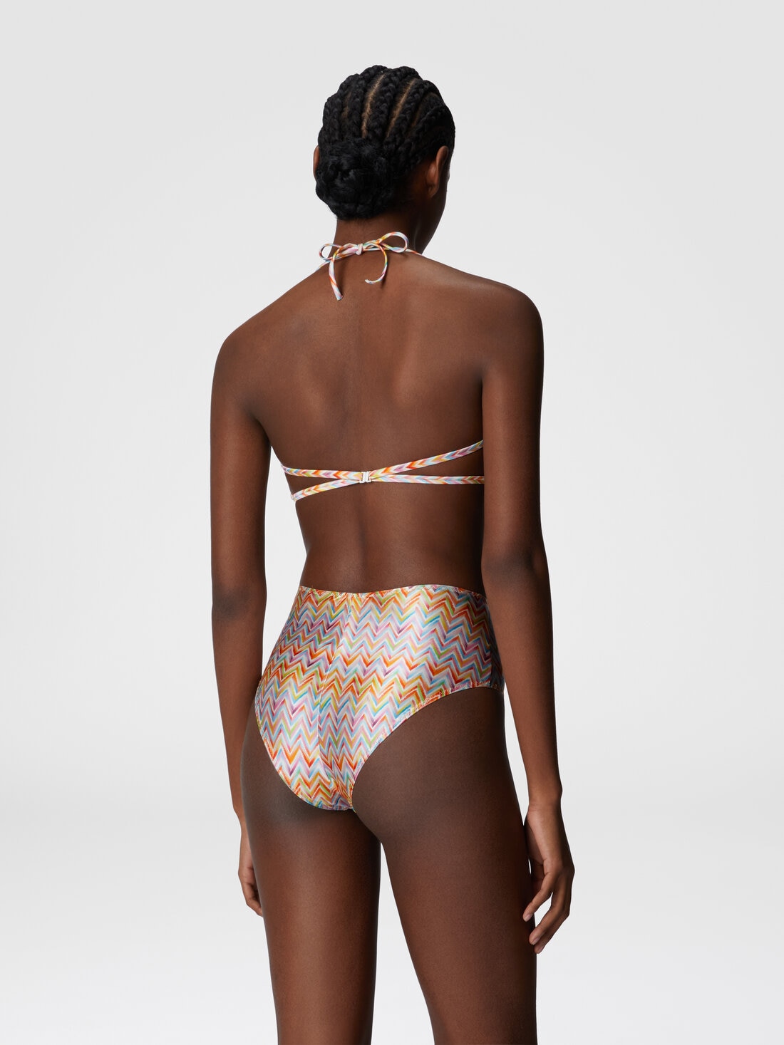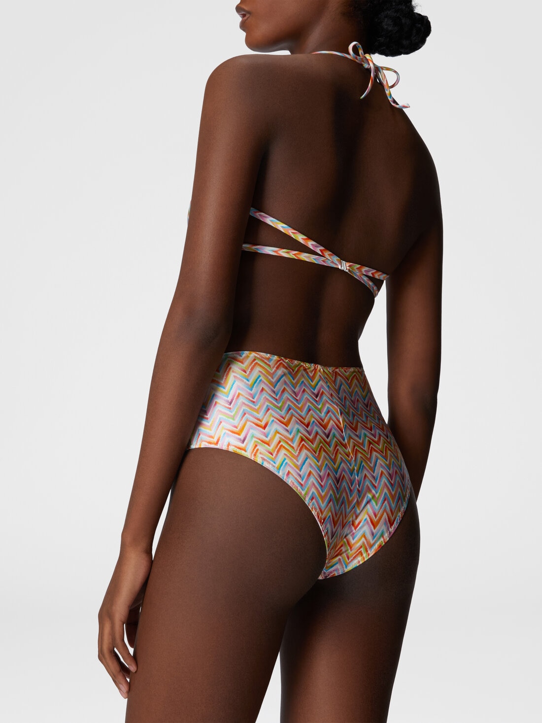 Líneas retro y detalles modernos se encuentran en el bikini con slip alto y sujetador con aro, caracterizado por una atadura detrás del cuello. Realizado en tejido técnico estampado, celebra el icónico motivo zig zag de la maison con una elegancia atemporal.