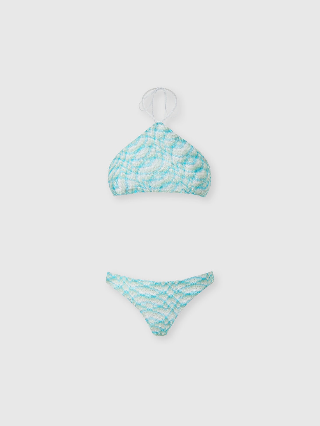 Las líneas onduladas típicas del motivo de ondas cobran vida en el trabajo raschel de este bikini para mujer con cuello halter en viscosa lamé degradada.