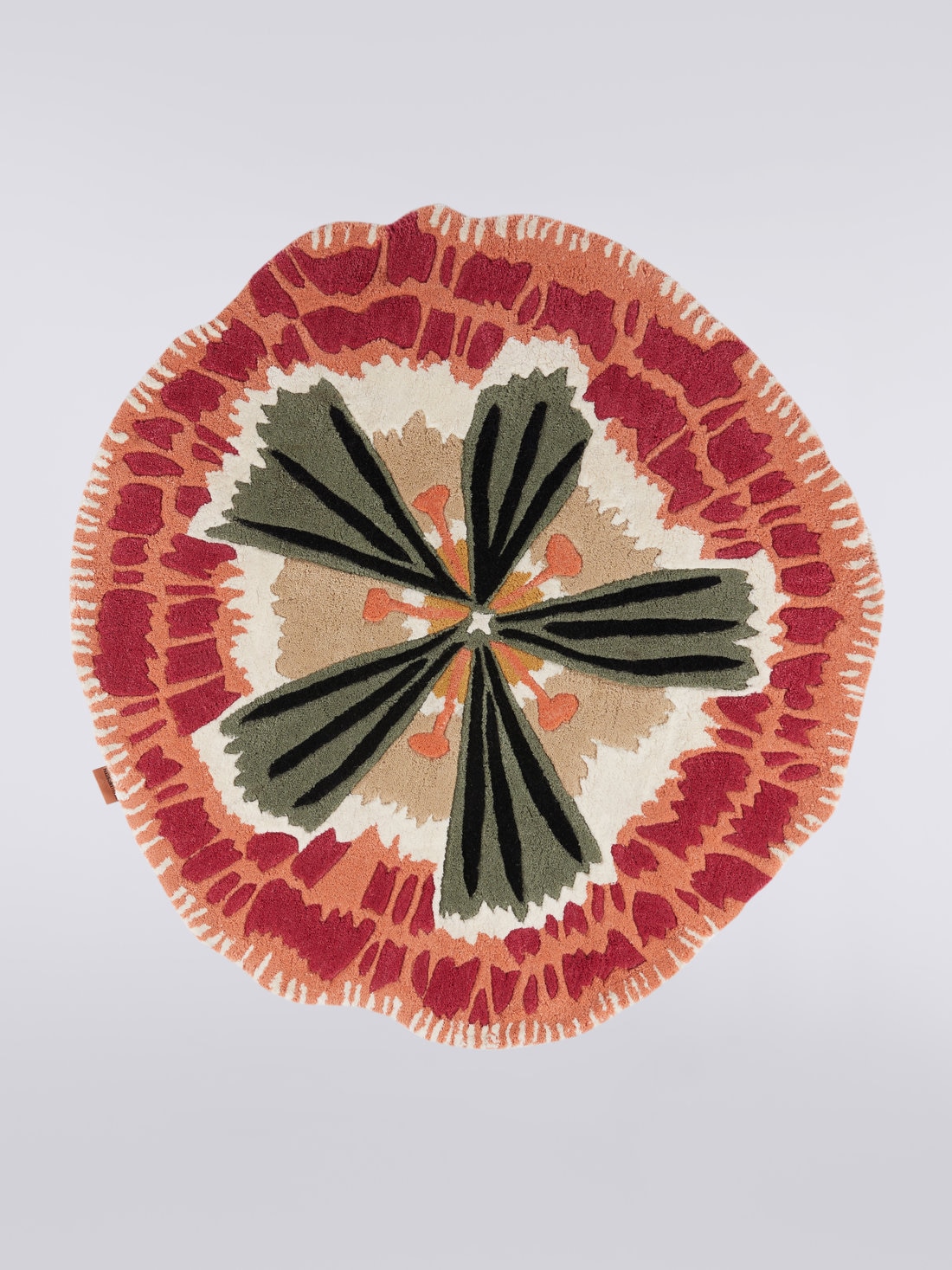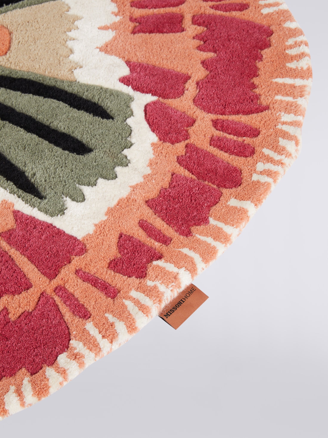 Una mezcla textil de lana y viscosa embellece la alegre personalidad de la alfombra redonda Botanica. El diámetro de 110 cm es perfecto para dar espacio a toda la creatividad de Missoni, que ofrece una versión de este accesorio para el hogar con una fuerte inspiración floral.