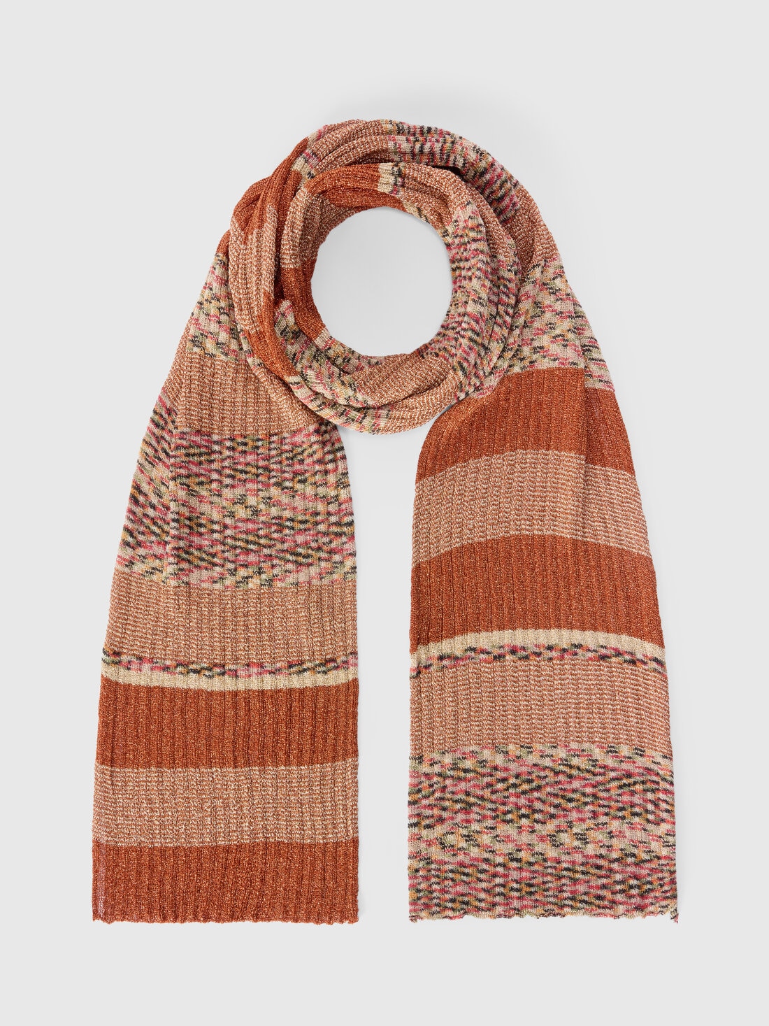 Un accesorio que combina estilo y confort, esta bufanda para mujer en lana y viscosa presenta un tejido de canalé con rayas e inserciones en chevron. Un juego de texturas y líneas que aporta profundidad a la prenda, perfecta para completar cualquier look con elegancia y personalidad.