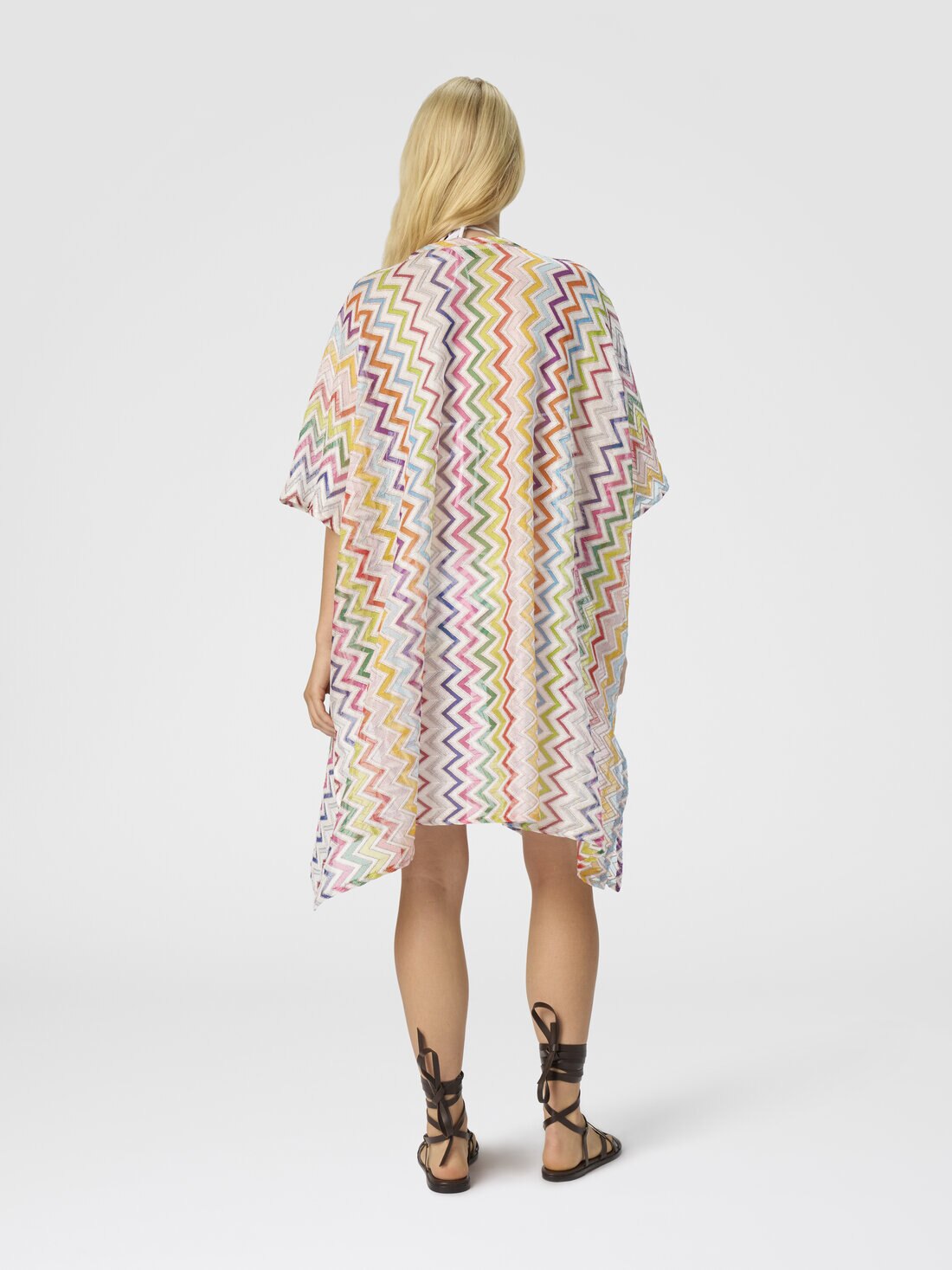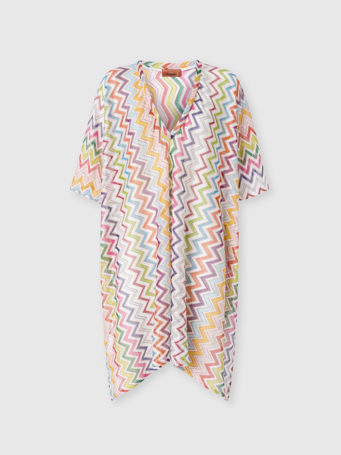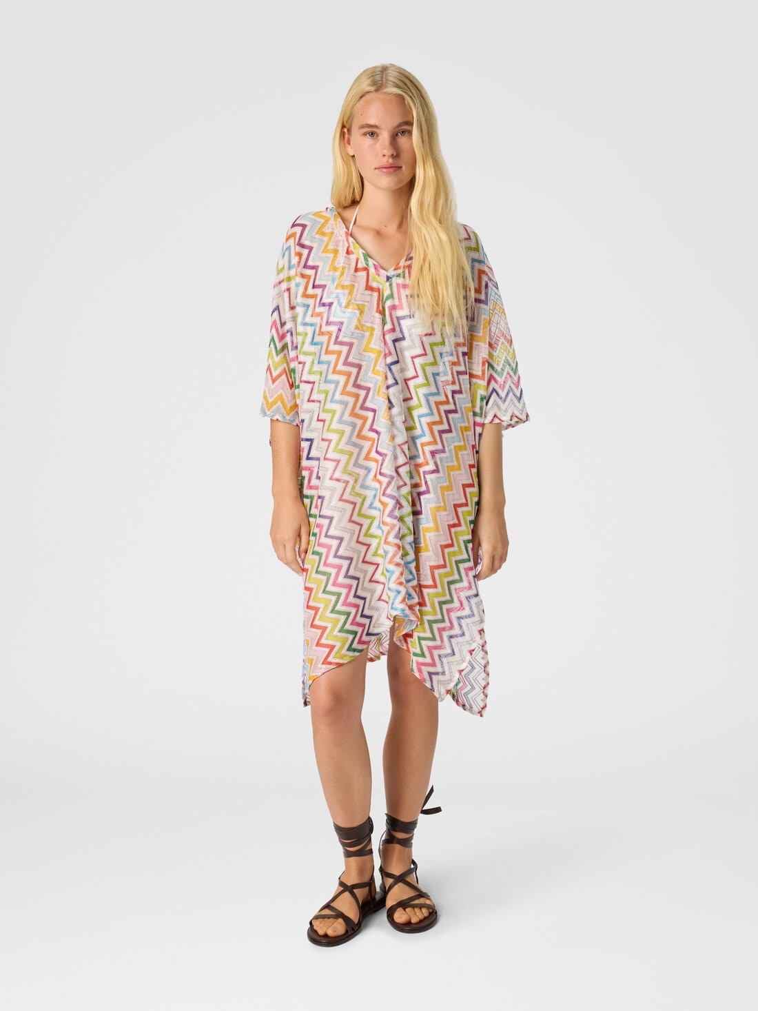 Elegancia esencial en este caftán sin costuras, que resalta el icónico motivo zig zag de Missoni con un efecto "vedo-non-vedo". El escote en V, realizado en viscosa y lamé, añade un toque de lujo minimalista, perfecto para cualquier ocasión.