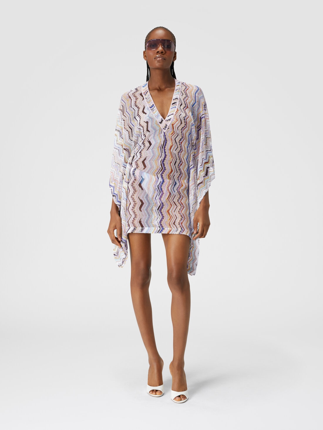Un escote en V con costuras a la vista, amplias mangas de campana y una confección con efecto ganchillo con motivo zigzag vertical y lúrex: estas son las características del nuevo caftán cubrebikini para mujer de Missoni confeccionado en mezcla de viscosa.